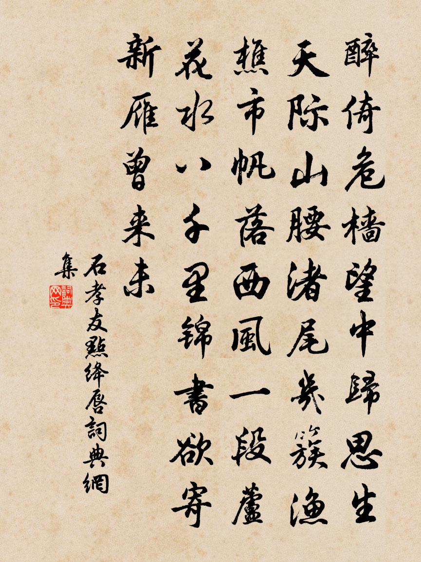 詩詞名句歷史字典書法欣賞書法字典國語詞典說文解字康熙字典古漢語字典標 題 作 者 詩 句 點絳唇作者:石孝友 朝代:宋代點絳唇原文醉倚危檣,望中歸思生天際。山腰渚尾。幾簇漁樵市。帆落西風,一段蘆花水。八千里。錦書欲寄。新雁曾來未。詩詞問答問:點絳唇的作者是誰?答:石孝友問:點絳唇寫於哪個朝代?答:宋代石孝友點絳唇書法欣賞點絳唇書法作品詩詞推薦次韻謝唐先生惠得項安世〔宋代〕後進魯諸生,斯文久服膺。有心知映雪,何意望寒冰。粵嶠連屏秀,閩溪淨練澄。山川八州地,人物九霄鵬。樞坐子寶東歸以嚶其鳴矣求友聲為韻作古詩七章寬孫應時〔宋代〕歲寒松柏蒼,波動金石止。物生不自別,有時正須此。真源在極致,空談非實理。玉汝其或成,造物恩大矣。登白雲絕頂劉過〔宋代〕雨罷新晴怯宿寒,一簾秋色滿闌乾。欲窮大地三千界,須上高峰八百盤。累世避人秦婦子,一時驚客漢衣冠,塵寰初夏即事十二解楊萬里〔宋代〕檻中紅藥趁春歸,瓶里苛留三兩枝。一片落來能戀我,葉梢閣住不教飛。頌古二十九首釋師體〔宋代〕甘贄設白粥,南泉費鹽醋。彼此落便宜,至今斷來路。寄紫閣無名頭陀(自新羅來)姚合〔唐代〕峭行得如如,誰分聖與愚。不眠知夢妄,無號免人呼。山海禪皆遍,華夷佛豈殊。何因接師話,清淨在斯須。思故鄉胡仲弓〔宋代〕隨龍南渡後,五世作泉人。僅識傳家譜,空餘報國身。中原無馬跡,鉅野隔邊塵。北定知何日,歸期未有因。句滕宗諒〔宋代〕笑語隔幽叢。送楊明夫郎中持節閩中王炎〔宋代〕稍覺飛騰疾,方知選擇公。雲霄移列宿,泉嶺度春風。問俗窮閻底,搜材薦墨中。褰帷先辦此,續續寄詩筒。韓宗彥寺丞通判鄧州梅堯臣〔宋代〕往歲陪祠泰壇下,始一相見如相知。我今入幙君有待,喜得款語勝前時。便嗟陳事日侵汨,雖欲數面曾無期。忽聞懷友人施樞〔宋代〕錦野重來已秀葽,雨肥梅杏粉痕銷。晚山四面子規叫,曉樹一聲婆餅焦。耐久交當如水淡,慣游身亦似蓬飄。老鶯竹竿佚名〔先秦〕籊籊竹竿,以釣於淇。豈不爾思?遠莫致之。泉源在左,淇水在右。女子有行,遠兄弟父母。淇水在右,泉源在左尋王道士藥堂因有題贈白居易〔唐代〕行行覓路緣松嶠,步步尋花到杏壇。白石先生小有洞,黃芽奼女大還丹。常悲東郭千家冢,欲乞西山五色丸。但恐黃致政輓詩二首王炎〔宋代〕祿養更迎侍,消搖介壽康。壯圖雖偃屈,潛德竟輝光。可惜今埋玉,無由自奠觴。他年觀上冢,千騎擁龍岡。緣識宋太宗〔宋代〕無縈無虛鬢如醫,手執仙經杖一藜。猛利銷磨閒歲月,玄中妙道入雲霓。紅塵世界何拘束,白日山川高又低。去住論詩三十首元好問〔金代〕百年才覺古風回,元〖礻右〗諸人次第來。諱學金陵猶有說,竟將何罪廢歐梅?王廙問安王秋二帖贊岳珂〔宋代〕摹法之精,必驗以真。我見棗刻,已同似人。啟以楷書,告以章草。情敬之分,於此焉考。聲聲慢(春)趙佶〔宋代〕宮梅粉淡,岸柳金勻,皇州乍慶春回。鳳闕端門,棚山彩建蓬萊。沈沈洞天向晚,寶輿還、花滿鈞台。輕煙里,算贈平首座王炎〔宋代〕家在青山下,投閒歲月多。杜門長卻掃。杖錫獨經過。學佛非無法,喔詩恐是魔。願言行古路,莫遣覆藤蘿。又登碧雲亭感懷三十首吳芾〔宋代〕晚上危亭喜有秋,民安物阜本無憂。鈴齋坐嘯雖多暇,爭似歸田得自由。名句推薦孤村芳草遠,斜日杏花飛。寇準《江南春·波渺渺》 今日大風寒,寒風摧樹木,嚴霜結庭蘭佚名《孔雀東南飛並序/古詩為焦仲卿妻作》 人生若只如初見,何事秋風悲畫扇。納蘭性德《木蘭花·擬古決絕詞柬友》 天地之道,可一言而盡也。其為物不貳,則其生物不測。子思《中庸·第二十六章》 平蕪盡處是春山,行人更在春山外。歐陽修《踏莎行·候館梅殘》 泥落畫梁空,夢想青春語。吳文英《生查子·秋社》 倚闌凝望,獨立漁翁滿江雪。李綱《六么令·次韻和賀方回金陵懷古鄱陽席上作》 開花必早落,桃李不如松。李白《箜篌謠》 閒坐悲君亦自悲,百年多是幾多時。元稹《遣悲懷三首·其三》 妾身悔作商人婦,妾命當逢薄倖夫。徐再思《陽春曲·閨怨》