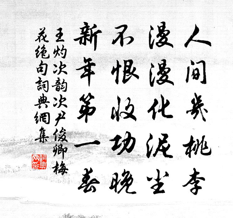 詩詞名句歷史字典書法欣賞書法字典國語詞典說文解字康熙字典古漢語字典標 題 作 者 詩 句 次韻次尹俊卿梅花絕句作者:王灼 朝代:宋代次韻次尹俊卿梅花絕句原文人間幾桃李,漫漫化泥塵。不恨收功晚,新年第一春。詩詞問答問:次韻次尹俊卿梅花絕句的作者是誰?答:王灼問:次韻次尹俊卿梅花絕句寫於哪個朝代?答:宋代王灼次韻次尹俊卿梅花絕句書法欣賞次韻次尹俊卿梅花絕句書法作品詩詞推薦小重山(己未六月十四日老香堂前月台玩月)吳潛〔宋代〕碧霄如水月如鉦。今宵知為我,特分明。冰壺玉界兩三星。清露下,漸覺濕衣輕。高樹點流螢。秋聲還又動,客心聲聲慢 揚州箏工沈生彈虞學士深遠溪沙,求張翥〔元代〕金鑾花學士,天花上歸來、花閉蘭舟小駐蕪城。供奉新詞,幾度慣賦鳴箏。相逢沉郎絕藝,為尊前、細寫余情。問題舒州山谷寺石牛洞泉穴王安石〔宋代〕水泠泠而北出,山靡靡而旁圍。欲窮源而不得,竟悵望以空歸。出京別崔學士黃滔〔唐代〕一從門館遍投文,旋忝恩知驟出群。不道鶴雞殊羽翼,許依龍虎借風雲。命奇未便乘東律,言重終期雪北軍。欲逐一路海棠正開陳普〔宋代〕入樵萬裏海棠林,花作雲霞樹作陰。莫笑道人行此路,卻懷程邵看花心。墾山叟陳造〔宋代〕雜木漫山誰所種,居不臨流多不用。九月霜風卷黃落,群山一昔皆班駮。遙看拖帔橫椽衣,農家刈粟山有畦。家家朝中措(生日生雙竹)沈瀛〔宋代〕論兵齒頰帶霜寒。清似碧琅玕。好是天然風韻,琳宮瑤館清閒。華筵初啟,小蠻二八,對影朱顏。便好添籌索笑,又海眼光贊釋了惠〔宋代〕玉腕指尖新,力能提萬鈞。上他籃子裹,未必是金鱗。次前韻二首司馬光〔宋代〕南園莫笑獨追尋,明日未知晴與陰。揮手一朝辭逆旅,滿堂安用累千金。元宵懷鄉二首董嗣杲〔宋代〕萬宇燈輝斂暗塵,幾年醉賞禁街春。良宵獨宿雙泉寺,負了吟風嘯月身。東湖第三溪戴表元〔宋代〕日晏霜濃十二月,林疏石瘦第三溪。雲沙有徑縈寒燒,松屋無人鳴書雞。幾聚衣冠塊作土,當年歌舞醉如泥。早知清明杜甫〔唐代〕著處繁花務是日,長沙千人萬人出。渡頭翠柳艷明眉,爭道朱蹄驕齧膝。此都好游湘西寺,諸將亦自軍中至。馬援懷嵩樓新開南軒與郡僚小飲歐陽修〔宋代〕繞郭雲煙匝幾重,昔人曾此感懷嵩。霜林落後山爭出,野菊開時酒正濃。解帶西風飄畫角,倚欄斜日照青松。會須周宣王時童謠佚名〔先秦〕檿弧箕服。實亡周國。南定樓晁公武〔宋代〕水接荊門陸控秦,臥龍陳跡久尤新。劍關驛外青山舊,錦里祠邊碧草春。更築飛樓瞰瀘水,擬將遺恨問洪鈞。南方酬和元九東川路詩十二首。夜深行白居易〔唐代〕百牢關外夜行客,三殿角頭宵直人。莫道近臣勝遠使,其如同是不閒身。對雪效樂天劉過〔宋代〕匣中雷吼一長劍,溪上月明多少舟。無賊可平間李愬,有人不訪倦王猷。銀杯縞帶從渠便,瑤樹瓊林得自由。衣敝春雪宋祁〔宋代〕遲旭收天宇,層陰糅雪英。傍階聊積玉,妝樹旋消瓊。越驛兼梅墜,章台代絮縈。風回飛自急,池暖白猶輕。曉溜雜曲歌辭。楊柳枝薛能〔唐代〕華清高樹出離宮,南陌柔條帶暖風。誰風輕陰是良夜,瀑泉聲畔月明中。洛橋晴影覆江船,羌笛秋聲濕塞煙。閒想代趙儀可挽劉叔丙蔡戡〔宋代〕此士不可得,鄉人今始思。迎賓多事日,教子廢科時。望屋訟自止,弄丸爭者誰。京華攜手處,憶著最傷悲。名句推薦為君之道,必須先存百姓。吳兢《貞觀政要·卷一·論君道》 杪秋霜露重,晨起行幽谷。柳宗元《秋曉行南谷經荒村》 雲壓西村茅舍重,怕他榾柮同燒。陳維崧《臨江仙·寒柳》 獨立小橋風滿袖,平林新月人歸後。馮延巳《鵲踏枝·誰道閒情拋擲久》 欲人之處高爵祿,則以讓賢也;多財則以分貧也。墨子《墨子·49章 魯問》 此地朝來餞行者,翻向此中牧征馬。孟浩然《高陽池送朱二》 風吹芳蘭折,日沒鳥雀喧。李白《送裴十八圖南歸嵩山二首》 精誠由中,故其文語感動人深。王充《論衡·卷十三·超奇篇》 記少年、駿馬走韓盧,掀東郭。辛棄疾《滿江紅·和范先之雪》 回樂烽前沙似雪,受降城外月如霜。李益《夜上受降城聞笛》