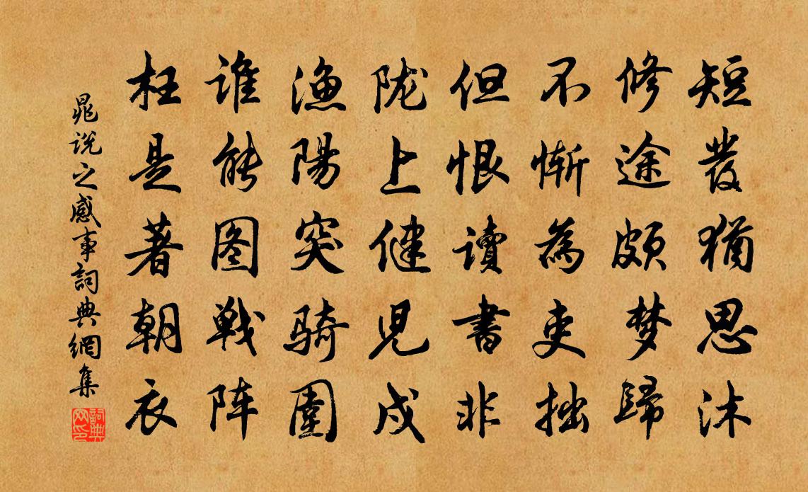 詩詞名句歷史字典書法欣賞書法字典國語詞典說文解字康熙字典古漢語字典標 題 作 者 詩 句 感事作者:晁說之 朝代:宋代感事原文短髮猶思沐,修途頗夢歸。不慚為吏拙,但恨讀書非。隴上健兒戍,漁陽突騎圍。誰能圖戰陣,枉是著朝衣。詩詞問答問:感事的作者是誰?答:晁說之問:感事寫於哪個朝代?答:宋代晁說之感事書法欣賞感事書法作品詩詞推薦和劉補闕秋園寓興之什十首朱慶餘〔唐代〕閒園清氣滿,新興日堪追。隔水蟬鳴後,當檐雁過時。雨余槐穟重,霜近藥苗衰。不以朝簪貴,多將野客期。誰言念奴嬌沈端節〔宋代〕嫩涼清曉,淡秋容、橫寫鮫綃十幅。山水光中參意味,不管人間榮辱。藜杖棕鞋,綸巾鶴氅,賓主俱遺俗。倚闌舒示梅山寧老二首趙蕃〔宋代〕八年再到仍沖暑,長愧堂中結夏僧。我欲松間借餘地,聽風聽雨發鬅鬙。送越僧元瑞項斯〔唐代〕靜中無伴侶,今亦獨隨緣。昨夜離空室,焚香淨去船。贈施大夫履鞋姚勉〔宋代〕漏院穿霜聽徹更,催班影踏禁花行。不須更待尚書諫,聽履先知有直聲。寓言九首其七王安石〔宋代〕鐘鼓非樂本,本末猶相因。仁聲入人深,孟子言之醇。如何貞觀君,從古同隋陳。風俗不粹美,惜哉世無臣。黎陽作詩曹丕〔魏晉〕千騎隨風靡。萬騎正龍驤。金鼓震上下。乾戚紛縱橫。白旄若素霓。丹旗發朱光。追思太王德。胥字識足臧。經歷賦鞏丈鸚鵡三首姜特立〔宋代〕隴汧歸路渺漫漫,且向金籠刷羽翰。院靜日長頻送語,時時圖得主翁看。夜歸陸游〔宋代〕疏鍾渡水來,素月依林上。煙火認茅廬,故倚船篷望。臨江仙彭元遜〔宋代〕自結床頭麈尾,角巾坐枕孤松。片雲承日過山東。起聽荷葉雨,行受芷花風。無客同羹蓴菜,有人為剝蓮蓬。東牆裴素明日帖贊岳珂〔宋代〕有王茂宏之筆勢,予非取其麗。從容而大肆,巧者以愧,尚庶古意。六代祖師畫像贊三祖監智禪師釋正覺〔宋代〕道無揀擇,宗非促延。死生外著,清白家傳。覓罪性空,廓然大同。妙盡亡能境,機回卻借功。虛明自照靡心識,中呂紅繡鞋佚名〔元代〕孤雁叫教人怎睡,一聲聲叫的孤淒。向月朋中和影一樣飛。你雲中聲嘹亮,我枕上淚雙垂。雁兒我你爭個甚的。挽徐居厚寺簿孫應時〔宋代〕始見偏何晚,新知不太深。書來渾一束,情厚有兼金。悄悄中宵別,哀哀萬古心。有懷終掛劍,雪涕獨難禁。春風樓況志寧〔宋代〕晴日遊絲拂畫欄,酒帘輕颺碧雲端。春風蝴蝶知何處,愁切江南曲已殘。中秋終日霧雨予還自都下宿分水嶺夜漏約七八喻良能〔宋代〕烏飯山邊白玉團,瑞光千丈溢清寒。斜穿逆旅茆茨室,正照先生苜蓿盤。聊向青天思太白,卻吟飛鵲憶曹瞞。今宵和此陽先生感興詩二十首劉黻〔宋代〕我聞封嬴秦氏,封威力橫封提封。北方封迤長城,中土鎖春風。阡陌鞅肆孽,簡編斯造凶。民命眇以墜,天勢巍且臘後送內大德從勖游天台皮日休〔唐代〕講散重雲下九天,大君恩賜許隨緣。霜中一缽無辭乞,湖上孤舟不廢禪。夢入瓊樓寒有月,行過石樹凍無煙。他時石孫偶中童科程弟有詩次韻方岳〔宋代〕衰暮安能六出奇,桐孫賴出嶧陽枝。九經庫謾無遺讀,千里駒寧不受羈。薄命久遭時俗熊,此心莫倚老天知。待歸送蕙坡趙富陽赴高郵元幕見次武衍〔宋代〕相逢客里便相嘆,握手真能出肺肝。買得酒尊曾共酌,帶來詩卷每容看。舊聞遊宦多知己,今喜公朝與好官。一片名句推薦日日雨不斷,愁殺望山人。賈島《望山》 一上高城萬里愁,蒹葭楊柳似汀洲。許渾《鹹陽城東樓 / 鹹陽城西樓晚眺 / 西門》 不要人夸好顏色,只留清氣滿乾坤。王冕《墨梅》 白雲映水搖空城,白露垂珠滴秋月。李白《金陵城西樓月下吟》 菊花何太苦,遭此兩重陽?李白《九月十日即事》 一時輕信人言語.自有明人話不平。馮夢龍《警世通言·卷四》 綠竹半含籜,新梢才出牆。杜甫《嚴鄭公宅同詠竹》 朝騁騖兮江皋,夕弭節兮北渚;屈原《九歌》 扣舷獨嘯,不知今夕何夕。張孝祥《念奴嬌·過洞庭》 恐是仙家好別離,故教迢遞作佳期。李商隱《辛未七夕》
