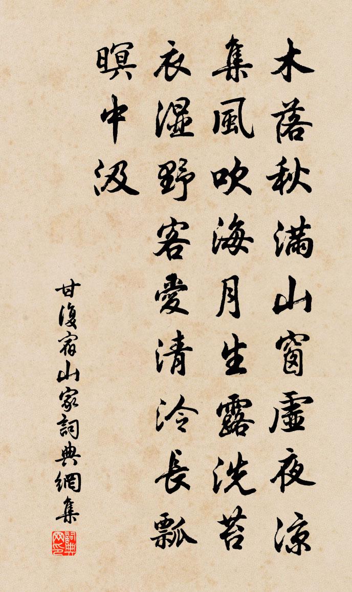 詩詞名句歷史字典書法欣賞書法字典國語詞典說文解字康熙字典古漢語字典標 題 作 者 詩 句 宿山家作者:甘復 朝代:元代宿山家原文木落秋滿山,窗虛夜涼集。風吹海月生,露洗苔衣濕。野客愛清泠,長瓢暝中汲。詩詞問答問:宿山家的作者是誰?答:甘復問:宿山家寫於哪個朝代?答:元代問:宿山家是什麼體裁?答:五古甘復宿山家書法欣賞宿山家書法作品注釋元詩別裁集詩詞推薦大梁送柳淳先入關孟郊〔唐代〕青山輾為塵,白日無閒人。自古推高車,爭利西入秦。王門與侯門,待富不待貧。空攜一束書,去去誰相親。致仕後即事陸游〔宋代〕清靜全勝欲界天,逍遙不減地行仙。眾中莫怪人嫌老,十五年前本命年。醜奴兒佚名〔宋代〕夜來子後披衣坐,心定神清。見個真人。臉似胭脂體似銀。壚中火焰炎炎起,紫氣騰騰。一粒丹成。管取飛升上帝二王后-明祖宗之意也白居易〔唐代〕二王后,彼何人,介公酅公為國賓,周武隋文之子孫。古人有言天下者,非是一人之天下。周亡天下傳於隋,隋人負薪行許宣平〔唐代〕負薪朝出賣,沽酒日西歸。路人莫問歸何處,穿入白雲行翠微。舟行早發廬陵郡郭寄滕郎中許渾〔唐代〕楚客停橈太守知,露凝丹葉自秋悲。蟹螯只恐相如渴,鱸鱠應防曼倩飢。風卷曙雲飄角遠,雨昏寒浪掛帆遲。離心硃砂庵江天一〔明代〕曲磴千盤盡,何曾任鑿穿。本來超色相,不假幻因緣。翠滴松稍雨,嵐開嶂外天。此中饒靜解,何事問棲禪。古剎七年春題府廳白居易〔唐代〕潦倒守三川,因循涉四年。推誠廢鉤距,示恥用蒲鞭。以此稱公事,將何銷俸錢?雖非好官職,歲久亦妨賢。春霽花萼樓南聞宮鶯楊凌〔唐代〕祥煙瑞氣曉來輕,柳變花開共作晴。黃鳥遠啼鳷鵲觀,春風流出鳳凰城。山村五絕蘇軾〔宋代〕竹籬茅屋趁溪斜,春入山村處處花。無象太平還有象,孤煙起處是人家。煙雨濛濛雞犬聲,有生何處不安生。但教謁金門·春欲去施紹莘〔明代〕春欲去,如夢一庭空絮。牆裡鞦韆人笑語,花飛撩亂處。無計可留春住,只有斷腸詩句。萬種消魂多寄與:斜陽天次韻徐何慊九日登高陳著〔宋代〕廣莫亭前秋氣清,招邀酒伴走庖兵。悠悠誰解知真意,樂只應須在太平。直到上峰饒獨步,盡收下界入雙明。滿頭長沙過賈誼宅劉長卿〔唐代〕三年謫宦此棲遲,萬古惟留楚客悲。秋草獨尋人去後,寒林空見日斜時。漢文有道恩猶薄,湘水無情吊豈知?寂寂游金地寺郭印〔宋代〕山行無近遠,絕頂是休程。度石籃輿怯,穿雲履屐輕。林篁當路迸,泉水落溪鳴。更宿招提夜,寥然一境清。後天易吟三十首方回〔宋代〕祖考精神散,子孫能聚之。淫祠祭非鬼,萃渙義何居。緣識宋太宗〔宋代〕出利祛煩惱,紅塵拂道衣。悟來持一念,尊大默玄機。詠史下晉武帝陳普〔宋代〕宮中擲戟又飛刀,謝玖兢兢命若毛。豈是君王輕社稷,天教熾業謝芳髦。送梁必大歸杭省親黎廷瑞〔宋代〕悠悠楚水,靄靄吳雲。孰作之合,胡然而分。豈無良朋,我獨子忻。於穆令德,有粲其文。麥飯熟邵定〔宋代〕麥飯熟,兒莫哭,阿爺搗麥麥煮粥。煨一蝦,配麥粥,飽兒腹。去年春梢鋪麥田,馱兒走竄青山顛。歸來破灶無晨白龍洞磨崖史少南〔宋代〕一自凌空降節飛,日瞻華表望翁歸。今猶香氣浮丹灶,時有仙韶殷翠微。青鳥山深藏宿霧,白猿洞敞納晨暉。榴房名句推薦白酒新熟山中歸,黃雞啄黍秋正肥。李白《南陵別兒童入京》 西望雷塘何處是?香魂零落使人愁,淡煙芳草舊迷樓王士禎《浣溪沙·紅橋》 石卵不敵。蛇龍不鬥。馮夢龍《警世通言·卷九》 昨夜江邊春水生,艨艟巨艦一毛輕。朱熹《活水亭觀書有感二首·其二》 秋風萬里動,日暮黃雲高。岑參《鞏北秋興寄崔明允》 芙蓉金菊斗馨香。天氣欲重陽。晏殊《訴衷情·芙蓉金菊斗馨香》 倚竹不勝愁,暗想江頭歸路王之道《如夢令·一晌凝情無語》 九日明朝酒香,一年好景橙黃。張可久《滿庭芳·客中九日》 修竹畔,疏簾里。歌余塵拂扇,舞罷風掀袂。謝逸《千秋歲·詠夏景》 明月照高樓,流光正徘徊。曹植《七哀》
