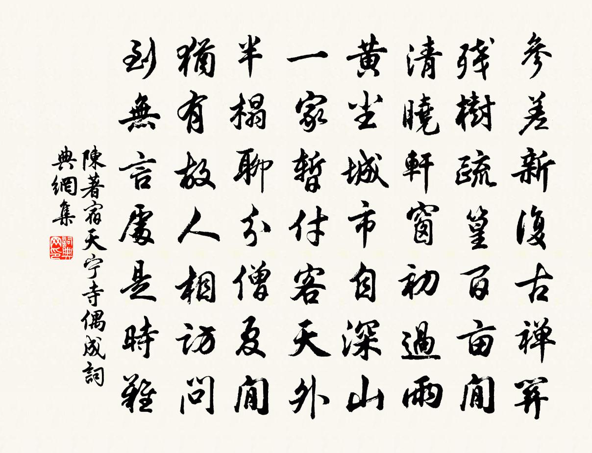 詩詞名句歷史字典書法欣賞書法字典國語詞典說文解字康熙字典古漢語字典標 題 作 者 詩 句 宿天寧寺偶成作者:陳著 朝代:宋代宿天寧寺偶成原文參差新復古禪關,殘樹疏篁百畝閒。清曉軒窗初過雨,黃塵城市自深山。一家暫付客天外,半榻聊分僧夏閒。猶有故人相訪問,到無言處是時難。詩詞問答問:宿天寧寺偶成的作者是誰?答:陳著問:宿天寧寺偶成寫於哪個朝代?答:宋代陳著宿天寧寺偶成書法欣賞宿天寧寺偶成書法作品詩詞推薦雜言寇準〔宋代〕我徒曠達由胸臆,恥學鯫生事文墨。蛟龍長欲趁風雷,騏驥焉能制銜勒。鏘金佩玉良有時,丐色諛言盡虛飾。功名閒吟四首邵雍〔宋代〕平生如仕官,隨分在風波。所損無紀極,所得能幾何。既乖經世慮,尚可全天和。樽中有酒時,且飲復且歌。醜奴兒慢盧祖皋〔宋代〕湘筠展夢,還是帶恨欹枕。對千頃、風荷涼艷,水竹清陰。半掩龜紗,幾回小語月華侵。娉婷何處,回首畫橋,朱再和胡寅〔宋代〕迥眺層台酒屢攜,千峰攢玉映瑤溪。南枝更有東風面,未減爭妍燦瓠犀。夜遊顧夢日〔宋代〕路轉歌聲杳,夜深雲露濃。美人行月下,秋水泛芙蓉。諸君用東坡玉堂觀郭熙畫詩韻題江山王君平遠陳文蔚〔宋代〕有客有客心地閒,樓外青林林外山。風煙出沒美無度,依約圖畫有無間。眼隨白鳥去邊遠,一聲漁唱江村晚。此時題鳳林橋高仁邱〔宋代〕一道長虹跨北河,往來憑此涉清波。帆從寶相叢中度,人向金鰲頂上過。此日高車題了少,昔年驅石敘功多。鳳凰句劉望之〔宋代〕便作稽山看,犀湖五月涼。絕句鄧允端〔宋代〕楚岸卸輕帆,停舟曲江曲。日暮塞鴻歸,春水平橋綠。游衡山徐照〔宋代〕衡山七十二,高是祝融峰。下界蠻方近,中天岳勢崇。四維皆佛占,絕頂正秋濃。翼宿平垂地,雷池暗起龍。簡書逢謝偃高適〔唐代〕紅顏愴為別,白髮始相逢。唯餘昔時淚,無復舊時容。與趙五話別釋斯植〔宋代〕送君無計路漫漫,玉笛聲悲遠戍間。自是行人多有恨,離情吹不到陽關。題丫頭岩曾豐〔宋代〕婀娜江南大小姑,大姑從兒小從夫。丫頭如許尚從母,學綰雲鬟撩月梳。諺謂女生俱外向,丫頭非有難婚相。來婿送劉祠部李新〔宋代〕漢苑何人侍翠輿,鏘鏘環佩雜璆璵。劉郎帶笑大誇客,此是予家千里駒。學無學頌一十五首釋印肅〔宋代〕昨夜三更日卓中,滿天星斗雨濛濛。三門佛殿相攜手,要去西天路不通。偈六首釋慧勤〔宋代〕去年今日時,紅爐片雪飛。今日去年時,曹娥讀夜碑。末後一句子,佛眼莫能窺。白蓮峰頂上,紅日繞須彌。鳥啄霜晴方回〔宋代〕霜晴暖意融,閒步日陰中。摘菊驚黃蝶,移葵墮碧蟲。不因機偶動,但見色俱同。天地詩人少,誰憐有此翁。武昌春色韓元吉〔宋代〕樊山宮殿已成陳,煙雨陰晴到處春。花柳不知興廢事,隔江相倚斗時親。即事曾幾〔宋代〕朝隨粥魚作,夕與棲鳥眠。中間復何事,野飯炊山田。摩腹步修廡,披襟坐南軒。薰爐郁佳氣,茶鼎浮輕煙。閒開論語絕句一百首張九成〔宋代〕富貴要之不可求,求之無不反招尤。何如且只從吾好,他若來時不自由。名句推薦紅板橋空,濺裙人去,依舊曉風殘月。納蘭性德《淡黃柳·詠柳》 甚獨抱清高,頓成淒楚。王沂孫《齊天樂·蟬》 君子周而不比,小人比而不周。孔子弟子《論語·為政篇》 柳垂江上影,梅謝雪中枝。晏幾道《臨江仙·身外閒愁空滿》 唯有門前鏡湖水,春風不改舊時波。賀知章《回鄉偶書二首》 若要俏,添重孝。馮夢龍《警世通言·卷三十五》 聖人終不為大,故能成其大。老子《老子·德經·第六十三章》 風煙俱淨,天山共色。吳均《與朱元思書》 雲想衣裳花想容,春風拂檻露華濃李白《清平調·其一》 苦心中常得悅心之趣;得意時便一失意之悲。洪應明《菜根譚·概論》