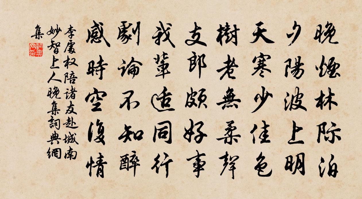 詩詞名句歷史字典書法欣賞書法字典國語詞典說文解字康熙字典古漢語字典標 題 作 者 詩 句 陪諸友赴城南妙智上人晚集作者:李處權 朝代:宋代陪諸友赴城南妙智上人晚集原文晚煙林際泊,夕陽波上明。天寒少佳色,樹老無柔聲。支郎頗好事,我輩適同行。劇論不知醉,感時空復情。詩詞問答問:陪諸友赴城南妙智上人晚集的作者是誰?答:李處權問:陪諸友赴城南妙智上人晚集寫於哪個朝代?答:宋代李處權陪諸友赴城南妙智上人晚集書法欣賞陪諸友赴城南妙智上人晚集書法作品詩詞推薦唐虞門虞舜周曇〔唐代〕進善懲奸立帝功,功成揖讓益溫恭。滿朝卿士多元凱,為黜兜苗與四凶。金剛隨機無盡頌莊嚴淨土分第十釋印肅〔宋代〕清淨自生心,心生三界沈。若心生住相,依舊入稠林。二月二十三日南雄解舟二首楊萬里〔宋代〕昨夜新雷九地鳴,今朝春漲一篙清。順流更借江風便,此去韶州只兩程。過吳江徐僑〔宋代〕北風獵獵送吾船,夜過吳江炯不眠。月色微明天覆水,倚看銀浪欲無邊。扇子詩李石〔宋代〕冷著松聲似雨,凍教井水成冰。猛火燒天燒地,清涼谷里閒僧。青玉峽洪咨夔〔宋代〕水繞河南阿李家,滿空飛雪響雷車。流將采石磯頭去,坐看浮梁壓浪花。奉和御製契丹出境將議回鑾五言六韻詩楊億〔宋代〕戎輅巡河右,天威讋鬼方。五營開細柳,三令凜飛霜。氛祲消千里,聲名耀八荒。靈旗風助順,黃道日呈祥。偃革庭竹李鹹用〔唐代〕嫩綠與老碧,森然庭砌中。坐銷三伏景,吟起數竿風。葉影重還密,梢聲遠或通。更期春共看,桃映小花紅。懷哉行薛據〔唐代〕明時無廢人,廣廈無棄材。良工不我顧,有用寧自媒。懷策望君門,歲晏空遲回。秦城多車馬,日夕飛塵埃。伐鼓齒脫姜特立〔宋代〕發白壯志凋,齒豁生意少。寒暑幾八旬,咀噍歲月久。請君視追蠡,血氣豈長好。吾祖仕進初,兩齒僅能有。此翁送關彥遠赴江西曾鞏〔宋代〕食蘗飲冰廉士操,敝衣穿履古人風。溪堂興足登臨後,騰閣今歸嘯傲中。一榻高懸賓閣峻,二龍俱化縣池空。因過西閣二首杜甫〔唐代〕巫山小搖落,碧色見松林。百鳥各相命,孤雲無自心。層軒俯江壁,要路亦高深。朱紱猶紗帽,新詩近玉琴。功名次韻賀葉運乾改官項安世〔宋代〕伊人匪□即東如,於我誰何伴退居。才到九門催引見,速來平地學追胥。雷轟古縣栽穠李,水滿芳塘泛碧渠。戲把送獨孤馬二秀才居明月山讀書賈島〔唐代〕濯志俱高潔,儒科慕冉顏。家辭臨水郡,雨到讀書山。棲鳥棕花上,聲鍾礫閣間。寂寥窗戶外,時見一舟還。送彥逢弟赴西興鹽場王之道〔宋代〕聞道西興去,全家共小舟。別離江北岸,懷抱海東頭。閃閃風帆遠,滔滔雪浪浮。苕溪在何許,應為故人留。詠石季倫李清〔唐代〕金谷繁華石季倫,只能謀富不謀身。當時縱與綠珠去,猶有無窮歌舞人。李白墓白居易〔唐代〕採石江邊李白墳,繞田無限草連雲。可憐荒壟窮泉骨,曾有驚天動地文。但是詩人多薄命,就中淪落不過君。汴水斗減舟不能進因寄彥國舍人梅堯臣〔宋代〕朝落幾寸水,暮長几寸沙。深灘鰲背出,淺浪龍鱗斜。秋風忽又惡,越舫嗟初閣。坐想掖垣人,猶如在寥廓。和彥時兄臘雪六首王之道〔宋代〕瑤林交映出風塵,便覺寒門氣象新。莫訝窗前群噪鵲,須憐江上有歸人。拋磚已喜來荊璞,斲堊無勞運郢斤。坐擁水仙子薛昂夫〔元代〕幾年無事傍江湖,醉倒黃公舊酒壚。人間縱有傷心處,也不到劉伶墳上土,醉鄉中不辨賢愚。對風流人物,看江山名句推薦泥融飛燕子,沙暖睡鴛鴦。杜甫《絕句二首》 榮非己莫恃,禍惟他勿縱。來俊臣《羅織經·瓜蔓卷第十二》 爐火照天地,紅星亂紫煙。李白《秋浦歌十七首》 萬里嬋娟,幾許霧屏雲幔。吳文英《玉漏遲·瓜涇度中秋夕賦》 勸君莫打枝頭鳥,子在巢中望母歸。白居易《鳥》 談虛語玄,不覺日之將夕; 登涉山水,不知老之將至。房玄齡《晉書·載記·第十四章》 漸紅濕杏泥,愁燕無語。吳文英《掃花游·西湖寒食》 若問相思甚了期,除非相見時。晏幾道《長相思·長相思》 故人入我夢,明我長相憶。杜甫《夢李白二首·其一》 嗚呼! 何時眼前突兀見此屋杜甫《茅屋為秋風所破歌》