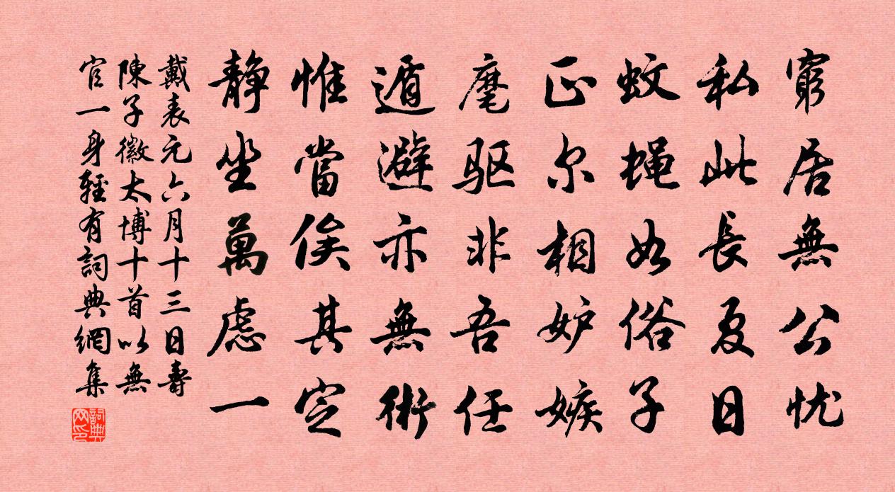 詩詞名句歷史字典書法欣賞書法字典國語詞典說文解字康熙字典古漢語字典標 題 作 者 詩 句 六月十三日壽陳子徽太博十首以無官一身輕有作者:戴表元 朝代:宋代原文窮居無公憂,私此長夏日。蚊蠅如俗子,正爾相妒嫉。麾驅非吾任,遁避亦無術。惟當俟其定,靜坐萬慮一。詩詞問答問:《六月十三日壽陳子徽太博十首以無官一身輕有》的作者是誰?答:戴表元問:該詩寫於哪個朝代?答:宋代書法欣賞六月十三日壽陳子徽太博十首以無官一身輕有書法作品詩文賞析【原題】:六月十三日壽陳子徽太博十首以無官一身輕有子萬事足為韻詩詞推薦書張必達詩詞卷首曾豐〔宋代〕詩寫水雲真,詞傳花柳神。溜脂松濯濯,凝粉竹津津。色者空中幻,聲其寂里塵。願言收視聽,其細入無倫。木犀五首味張明中〔宋代〕收拾西風點點金,旋煩玉杵搗香塵。松梢鼓吹湯翻鼎,酥蜜澆來絕逼真。覽明覺語釋雲岫〔宋代〕瀑雪一千餘丈白,洞庭七十二峰寒。當年若也收歸藏,此錄誰知是別傳。七寶玲瓏王哲〔元代〕人人每日,問人要求玄。你便待、做神仙。四四一十六個字,二十八字在眾賢。會得之時也未然。來俱不染,打破送柳郎中裴起居武元衡〔唐代〕望鄉台上秦人在,學射山中杜魄哀。落日河橋千騎別,春風寂寞旆旌回。秋懷十首趙蕃〔宋代〕情親骨肉均,未可一一數。君家蓋其人,進也邊城戍。肅儀雖近家,白首猶管庫。好歌歸去來,莫賦感不遇。富樞密妙高堂釋宗杲〔宋代〕妙高堂,隨所至。榜未懸,落第二。似猛焰,藏蚊蚋。擬隨當,生妄計。德雲師,安有作。在別峰,亦寬廓。住佛八月十一日晨興三首張耒〔宋代〕江上秋陰合,柯山曉雨來。貂裘欲辭篋,紈扇已生埃。落葉濕相藉,晚花寒未開。殷勤探 * ,九日泛清杯。次歐陽少逸韻呈雪庭禪師丘葵〔宋代〕吟得秋聲滿院涼,不知六月有驕陽。禪心已是空諸相,無奈瓶花故故香。讀李邕碑張栻〔宋代〕荒榛日莫倚筇時,嘆息危亭北海碑。後輩但知尊字畫,當年不得戍邊垂。豈關貝錦有成禍,只恐干將不自奇。杜老讀史宋祁〔宋代〕順諛要領絕,書罷付函封,隸子方求益,君非賣菜傭。侍宴華光殿曲水奉勑為皇太子作詩 三謝朓〔南北朝〕禮行郊社。人神受職。寶效山川。鱗羽變色。玄塞北靡。丹徼南極。浮毳駕風。非泳非陟。蕪湖感舊陳造〔宋代〕下帆同烏棲,掛帆逐雞起。但見蕪湖月,耿夜清如水。江左此壯縣,我昔舟屢艤。諸公各敬客,款曲豈今比。酒杯思文佚名〔先秦〕思文后稷,克配彼天。立我烝民,莫菲爾極。貽我來牟,帝命率育,無此疆爾界。陳常於時夏。致仕後寄白蓮然公晁說之〔宋代〕僧衣換卻朝衣盡,知悔知非恐不任。磬韻應憐持課罷,香銷當識坐禪深。芭蕉庭下三身正,蟋蟀床頭百慮侵。憶我夜過楊州二首楊萬里〔宋代〕秪今何許問迷樓,更有垂楊記御溝。除卻瓊花與紅藥,楊州不是古楊州。答文與可以六言詩相示因道濟南事作十首蘇轍〔宋代〕遠遊既為東魯,遷居又愛南山。齒髮自知將老,心懷且欲偷安。舜井溢流陌上,歷山近在城頭。羈旅三年忘去,故蒙知府寵示秋日郡圃佳制遂侍杖屨逍遙林水間陳與義〔宋代〕竹際笙簧起,回聽眾籟微。時陪物外賞,肯念日斜陽。草色違秋意,池光淨客衣。吟公清絕句,政爾不能肥。丙寅十月游南華朱翌〔宋代〕五年四轉入曹溪,飛蓋乾霄日為低。人定忽聞鐘不嗄,飲香休問水流西。桄榔子熟旒珠重,荳寇叢深扇羽齊。鬱郁同信道晚登古原陳與義〔宋代〕幽懷忽牢落,起望登古原。微吹度修竹,半林白翻翻。日暮紛物態,山空銷客魂。惜無一樽酒,與子醉中言。名句推薦山中無甲子,寒盡不知年。吳承恩《西遊記·第一回》 天覆吾,地載吾,天地生吾有意無。李泌《長歌行》 誰知道,斷煙禁夜,滿城似愁風雨劉辰翁《永遇樂·璧月初晴》 矜偽不長,蓋虛不久。韓非及後人《韓非子·難一》 故鄉今夜思千里,霜鬢明朝又一年。高適《除夜作》 行人悵望蘇台柳,曾與吳王掃落花。姜夔《姑蘇懷古》 不剪春衫愁意態。過收燈、有些寒在。史達祖《夜行船·正月十八日聞賣杏花有感》 鄂王墳上草離離,秋日荒涼石獸危。趙孟頫《岳鄂王墓》 沙上並禽池上暝。雲破月來花弄影。張先《天仙子·水調數聲持酒聽》 機不密,禍先行。馮夢龍《醒世恆言·卷二十》