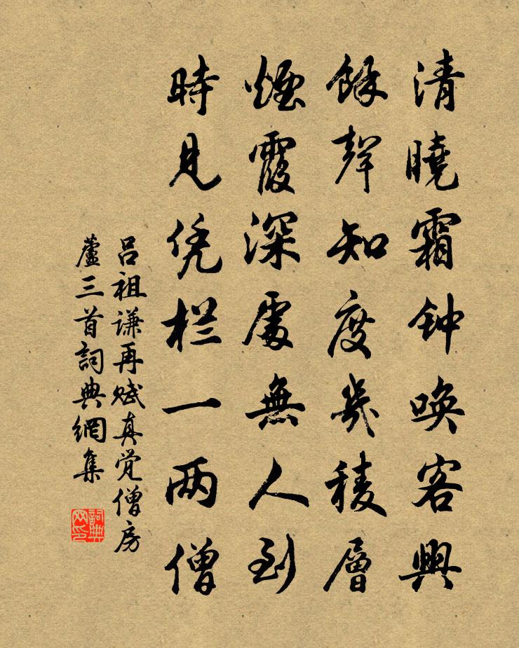 詩詞名句歷史字典書法欣賞書法字典國語詞典說文解字康熙字典古漢語字典標 題 作 者 詩 句 再賦真覺僧房蘆三首作者:呂祖謙 朝代:宋代再賦真覺僧房蘆三首原文清曉霜鍾喚客興,餘聲知度幾稜層。煙霞深處無人到,時見憑欄一兩僧。詩詞問答問:再賦真覺僧房蘆三首的作者是誰?答:呂祖謙問:再賦真覺僧房蘆三首寫於哪個朝代?答:宋代呂祖謙再賦真覺僧房蘆三首書法欣賞再賦真覺僧房蘆三首書法作品詩詞推薦挽黃助教四首舒邦佐〔宋代〕春歸平日館池中,想是園花三四紅。還有舊時王謝燕,喃喃來吊主人翁。朝會佚名〔宋代〕爰有嘉禾,含章自天。宛城洛書,粲若奎躋。珍符天著,靈意昭宣。永告洪業,時萬斯年。送薛奎殿院赴闕魏野〔宋代〕謫監陝郡滯賢才,清雪忻將紫詔開。緩步未親龍扆去,迴車願擁隼輿來。辭蒙得得過三徑,送合迢迢到柏台。秋霽句蕭德藻〔宋代〕稚子推窗窺過雁,數峰乘隙入西軒。宿牡羊二絕李流謙〔宋代〕古柳維舟帶暝陰,夜寒剪剪到衣棱。客中不覺年華換,小市人家已試燈。羅霄洞釋德最〔宋代〕江南三月春無邊,谿竹十里花爭妍。兒童且莫吹羌管,我欲臨流枕石眠。禽言黎廷瑞〔宋代〕萬疊青山,白云何處。行不得,哥哥哥。冥冥高飛憂網羅,煢煢孤往虞干戈。江湖蛟鱷憂,山谷虎狼多。行不得,曳杖歌先秦無名〔先秦〕泰山其頹乎。梁木其壞乎。哲人其萎乎。遣興七首李流謙〔宋代〕舞空三尺雪,笑指玉如泥。早日羞屠狗,窮途悔射鼷。掛心無妄念,省分有幽棲。舌在何須問,端憂愧老妻。同友人泛舟至仁王劉燾〔宋代〕青身出水細於鍼,嫩葉安裝齊綠未深。又是一年春欲盡,杖藜乘興足幽尋。守郡不能同憲使倉使游靈岩袁說友〔宋代〕秋風敲葉漾湖光,兩兩星華古寺傍。曉日一川迎使節,晚山十里送歸艎。風流我已非山簡,賓客公應念葛強。豈是看筍和潘養大韻陳傅良〔宋代〕兒童才丱角,兵衛忽森戟。十日不汝見,尋丈出咫尺。隱几觀物化,軒奮恣所極。褰裳欲從之,世事有繩墨。十月朝開爐偶書。余病歸二年,未能拜掃松楸范成大〔宋代〕圃芋今年紫,籬楓昨日丹。開爐修故事,聽雨說新寒。桔社重遊阻,楸行再拜難。此時西望眼,衰涕不勝彈。發光山孔武仲〔宋代〕搖搖春霜草頭白,冰如龍蛇當轍跡。天開日麗非偶然,昨夜滿山明月色。憶昨北走關山中,下坂還登百千尺。狂風訴衷情曾覿〔宋代〕晚妝初試蕊珠宮。隨步異香濃。檀槽緩垂鸞帶,纖指拈春蔥。鶯語巧,上林中。正嬌慵。暫教花下,簾影微開,多虞美人(題靈山廣禪院)葛勝仲〔宋代〕靈山法會何曾散。此地神光滿。丁公潭下百雷霆。疑是銀河挽下、一齊傾。高橋飛觀連雲起。檻外驚湍水。大磯才過沖寂觀蔣璨〔宋代〕兔井橋邊鷁首橫,過逢仍怯近鄉情。路人失喜交頭語,鄰犬何知掉尾迎。重到雲房驚落寞,直須金闕早崇成。百年已亥雜詩 285龔自珍〔清代〕嘉慶文風在目前,記同京兆鹿鳴筵。白頭相見冬山路,誰惜荷衣兩少年。李和廷老家會飲梅堯臣〔宋代〕四序豈常停,寒革春寖和。始愛衣裘輕,相與車馬過。車馬不畏遠,風埃不畏多。到門門有槐,槐上時鳥歌。時鳥菩薩蠻(梅)趙長卿〔宋代〕梅花枝上東風軟。朝來吹散真香遠。雅淡有餘清。客心和淚傾。美人臨別夜。月晃燈初灺。玉枕小屏山。眉尖曾細名句推薦花門樓前見秋草,豈能貧賤相看老。岑參《涼州館中與諸判官夜集》 長安故人別後,料征鴻聲里,畫闌憑偏。王月山《齊天樂·夜來疏雨鳴金井》 致人於死,莫逾構其反也;誘人以服,非刑之無得焉。來俊臣《羅織經·刑罰卷第十一》 軍中宜劍舞,塞上重笳音。張說《幽州夜飲》 笑漸不聞聲漸悄,多情卻被無情惱。蘇軾《蝶戀花·春景》 記得短亭歸馬,暮衙蜂鬧。吳文英《天香·蠟梅》 行到水窮處,坐看雲起時。王維《終南別業 / 初至山中 / 入山寄城中故人》 冰骨清寒瘦一枝。玉人初上木蘭時。吳文英《浣溪沙·題李中齋舟中梅屏》 此去經年,應是良辰好景虛設。柳永《雨霖鈴·寒蟬淒切》 欲吊沉累無所,但有漁兒樵子,哀此寫離憂。張孝祥《水調歌頭·過岳陽樓作》