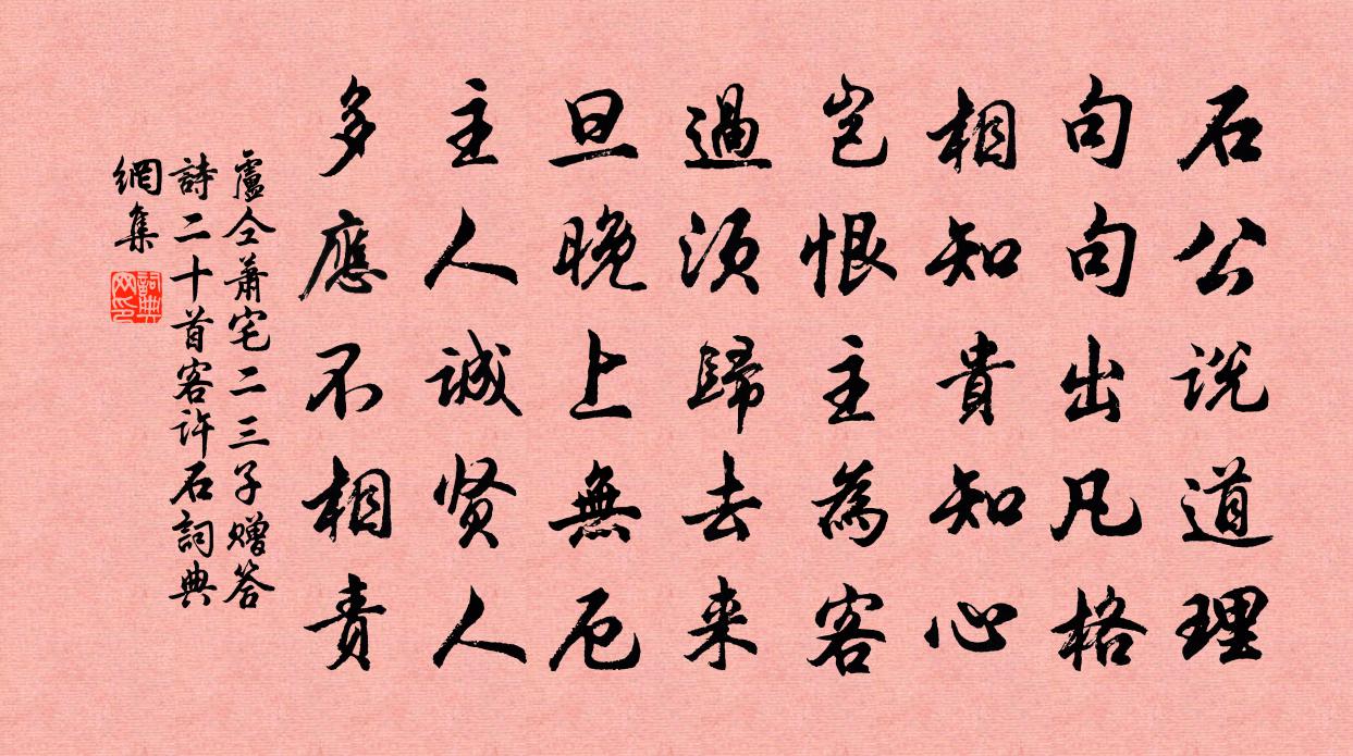詩詞名句歷史字典書法欣賞書法字典國語詞典說文解字康熙字典古漢語字典標 題 作 者 詩 句 蕭宅二三子贈答詩二十首客許石作者:盧仝 朝代:唐代原文石公說道理,句句出凡格。相知貴知心,豈恨主為客。過須歸去來,旦晚上無厄。主人誠賢人,多應不相責。詩詞問答問:《蕭宅二三子贈答詩二十首客許石》的作者是誰?答:盧仝問:該詩寫於哪個朝代?答:唐代書法欣賞蕭宅二三子贈答詩二十首客許石書法作品注釋全唐詩:卷387-39詩詞推薦長思仙馬鈺〔元代〕遇重陽。夢純陽。*起心香禮正陽。三師助我陽。煉陰陽。固元陽。五色霞光簇太陽。雲中子抱陽。齒落陸游〔宋代〕昔聞少陵翁,皓首惜墮齒。退之更可憐,至謂豁可恥。放翁獨不然,頑頓世無比,齒搖忽脫去,取視乃大喜。譬如留別龜山白禪老兼簡楊居士介賀鑄〔宋代〕汴尾望龜山,人煙了可數。長淮斷日風,浩若千里阻。舟無百石載,兩腋憂雙櫓。鷁首盪頹波,中流幾翔舞。維梢春日溪上示南正四首宋祁〔宋代〕春雲拂拂柳搖搖,盡日相望似見招。此意只應人未會,自持杯酒上溪橋。題趙大年奉議小景張舜民〔宋代〕渭曲山陰到者稀,浮休一見便開眉。客來不必多嗟賞,自古詞人是畫師。客自邵武來言王野使君平寇戴復古〔宋代〕太守自監軍,片膽大如身。立馬斬數賊,犒軍捐萬緡。威行千里外,手活一城民。孰謂書生怯,書生中有人。宣和御筆二扇面艾性夫〔宋代〕紈扇輕盈寶月輪,鶯花點染玉園春。憑誰為障西風起,萬里黃塵竟污人。水龍吟吳文英〔宋代〕望中璇海波新,泛槎又幣銀河轉。金風細裊,龍枝聲奏,鈞簫秋遠。南極飛仙,夜來催駕,祥光重見。紫霄承露掌奉和聖制幸韋嗣立山莊應制張說〔唐代〕西京上相出扶陽,東郊別業好池塘。自非仁智符天賞,安能日月共回光。海棠石揚休〔宋代〕化工裁翦用功專,濯錦江頭價最偏。酷愛幾思憑畫手,難題渾覺挫詩權。艷凝絳纈深深染,樹認紅綃密密連。因想次韻徐贊府蜚英八首方回〔宋代〕摩拊惸嫠達下情,領州作縣總書生。清詩要自清心出,比自新安水更清。緣識宋太宗〔宋代〕寂靜人歌詠,愚情豈易知。但求心自樂,不怕面相欺。枉直回邪滅,顛狂道德持。高明常鑒照,方寸欲何之。心泉蒲壽宬〔宋代〕來尋萬古意,聊結此生緣。久視都無物,中間只見天。靈根何處覓,露液曉初鮮。白髮今如此,捫松憶少年。蛙聲王炎〔宋代〕官蛙不問雨兼晴,閣閣無端聒耳鳴。對客自誇聞鼓吹,稚圭此語豈真情。避賊張嵲〔宋代〕避賊入深谷,乘桴復悠悠。四顧江上山,群峰如薺稠。是時雪霜霽,林壑氛霧收。茂樹蔭石壁,澄潭深不流。蓧盪晦日呈諸判官韓滉〔唐代〕晦日新晴春色嬌,萬家攀折渡長橋。年年老向江城寺,不覺春風換柳條。李季允侍郎舟中戴復古〔宋代〕憶昨楓橋既語離,何期千里又相隨。太湖不見鴟夷子,秋浦同尋杜牧之。燈火船窗深夜話,江山客路早冬詩。人間蕭鄲草書歌顧況〔唐代〕蕭子草書人不及,洞庭葉落秋風急。上林花開春露濕,花枝濛濛向水垂,見君數行之灑落,石上之松松下鶴。若把草丁謂〔宋代〕葭茁迎春早,山芮得地高。堪書同細帶,入詠似青袍。弱力綿綿葛,微香蓼蓼莪。王孫何處在,楚思遍江皋。端午次韻懷古或疑屈原曹娥死非正命是不知殺林景熙〔宋代〕葵榴入眼明,得酒慰衰齒。胡為浪自悲,懷古淚紛季。湘江沈忠臣,越江沈孝子。沈骨不沈名,清風兩江水。或雲名句推薦一時勸人以口,百世勸人以書。袁黃《了凡四訓·積善之方》 我家洗硯池邊樹,朵朵花開淡墨痕。王冕《墨梅》 不知江月待何人,但見長江送流水。張若虛《春江花月夜》 荻花秋,瀟湘夜,橘洲佳景如屏畫。李珣《漁歌子·荻花秋》 松下問童子,言師採藥去。賈島《尋隱者不遇 / 孫革訪羊尊師詩》 為之而欲人不知,言之而欲人不聞,此猶捕雀而掩目,盜鐘而掩耳者吳兢《貞觀政要·卷五· * 平》 蓮渚收香,蘭皋浮爽,涼思頓欺班扇。王月山《齊天樂·夜來疏雨鳴金井》 狎浪兒童,橫江士女,笑指漁翁一葉輕。吳偉業《沁園春·觀潮》 兒童強不睡,相守夜歡嘩。蘇軾《守歲》 涼風起天末,君子意如何。杜甫《天末懷李白》