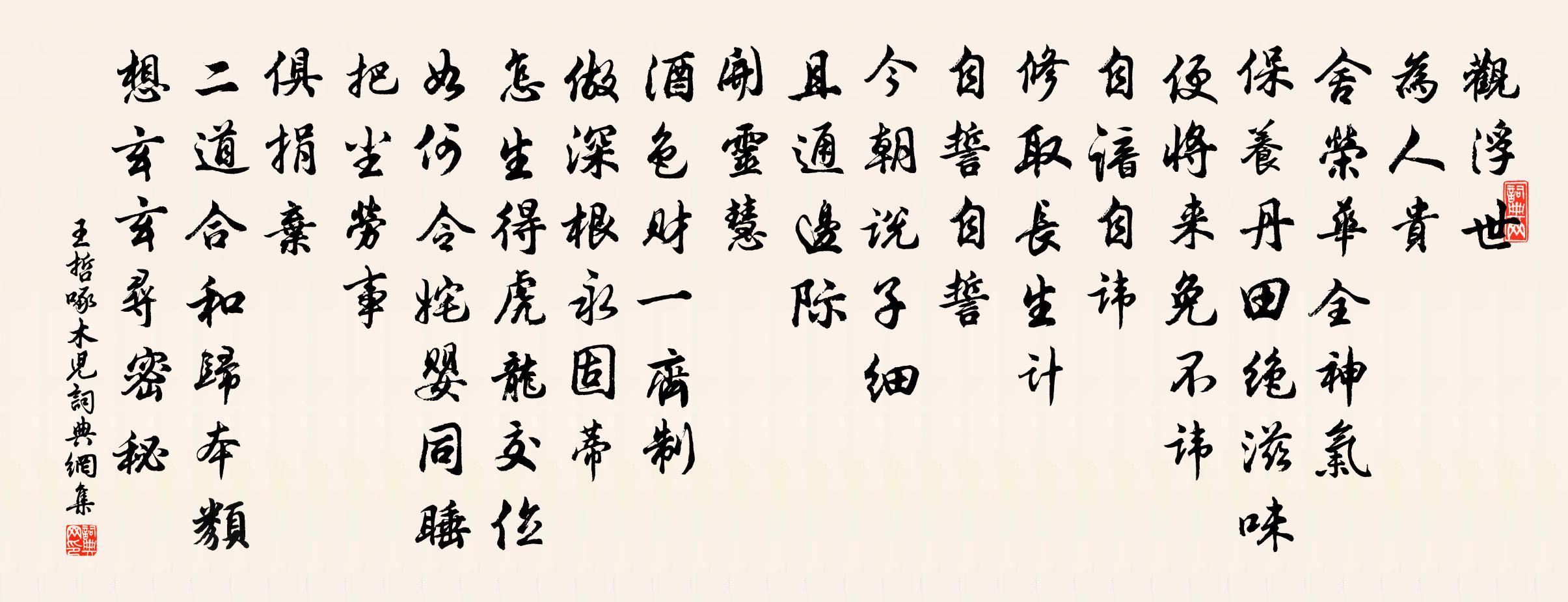 詩詞名句歷史字典書法欣賞書法字典國語詞典說文解字康熙字典古漢語字典標 題 作 者 詩 句 啄木兒作者:王哲 朝代:元代啄木兒原文觀浮世。為人貴。舍榮華、全神氣。保養丹田絕滋味。便將來、免不諱。自諳自諱。修取長生計。自誓自誓。今朝說子細。且通邊際。開靈慧。酒色財一齊制。做深根、永固蒂。怎生得、虎龍交位。如何令、奼嬰同睡。把塵勞事。俱捐棄。二道合和歸本類。想玄玄、尋密秘。詩詞問答問:啄木兒的作者是誰?答:王哲問:啄木兒寫於哪個朝代?答:元代問:啄木兒是什麼體裁?答:詞王哲啄木兒書法欣賞啄木兒書法作品詩詞推薦看惲家牡丹花戲贈李二十白居易〔唐代〕香勝燒蘭紅勝霞,城中最數令公家。人人散後君須看,歸到江南無此花。和盧推官中秋遇雨釋文珦〔宋代〕秋中唯此夕,雨蔽月圓時。握管沉幽思,臨軒失舊期。孤燈花謾落,長會信成虧。宋玉悲潛長,安仁鬢亦衰。檐聲登城陸游〔宋代〕我登少城門,四顧天地接。大風正北起,號怒撼危堞。九衢百萬家,樓觀爭岌嶪。臥病氣壅塞,放目意頗愜。永懷雜詩李復〔宋代〕高松懷正氣,挺特入空碧。短棘無直枝,千鉤未成尺。松生倚雲岡,棘散傍道側。道側侵行人,牽衣去不得。絲蔓省題泰帝鼓瑟王洋〔宋代〕雅樂聞琴瑟,相因泰昊前。朱絲疑雜奏, * 減哀弦。破竹符終全,分魚目不全。所餘裁五五,再續未綿綿。損益孟子乍見入井陳普〔宋代〕乍見無從那處生,非思非勉出天真。苟無物慾相攻奪,人性如何有不仁。宮詞效王建五首張耒〔宋代〕簾外微明燭下妝,殿門放鑰待君王。玉階地冷羅鞋薄,眾里偷身倚御床。寒食日歸吳興寄魯山仲並〔宋代〕風雲雖不定,日雨亦易乾。殘春猶凜凜,助我朝食寒。想見芳野田,士女游班班。去者日以疏,更為來者歡。青紅偈頌二百零五首釋正覺〔宋代〕途中久客憶家山,一線蹊通入翠寒。望處霽雲收青練,跨門殘月墮金盤。十虛俱殞眼方闊,三世齊吞肚覺寬。變化次頌符術致雨之韻汪炎昶〔宋代〕術乃轟雷電,時方切榮雩。感通渠自諉,造化本無拘。翻想匙明雪,量同斛糶珠。天公應有語,爾力不從吾。江館秋思因成自勉李中〔唐代〕江邊候館幽,汀鳥暝煙收。客思雖悲月,詩魔又愛秋。聲名都是幻,窮達未能憂。散逸憐漁父,波中漾小舟。旅中歲除邵雍〔宋代〕比到明年無數刻,且令芳酒更斟回。星杓建醜晦將盡,歲箭射人春又來。不用物情閒作梗,大都心緒已成灰。浮名改唱佚名〔唐代〕張公吃酒李公顛,盛六生兒鄭九憐。舍下雄雞失一足,街頭小福拉三拳。寺壁偶題陸游〔宋代〕斷山支徑得行吟,度澗穿林不厭深。雉挾兩雌飛谷口,鳥將數子下牆陰。前三喜接高人語,方寸寧容俗慮侵?少待題王制機新樓戴復古〔宋代〕綠雲圖上新輪奐,彈壓江山氣勢豪。手拍危欄拂星斗,目窮滄海見波濤。人間何處望不到,天下有樓無此高。俯視偈頌一百零一首釋慧性〔宋代〕祖禰不了,兒孫遭累。祝著磕著,無處迴避。不辭禮拜燒香,也要遞相鈍置。六月二日乙丑濫溪大雷雨岳珂〔宋代〕人言龜夏月雨甲龜子,赤地千里真旱祥。今年六月天久亢,平疇龜坼田禾秧。農夫慟哭眼滴血,郡邑奔走焚巫尫。班師呂定〔宋代〕紫塞回來雪正晴,王師百萬擁連營。馬嘶大地山河壯,旗卷長空日月明。龍虎台高千嶂聳,鳳皇城近五雲生。聖顏蓬溪道中所見李新〔宋代〕筠輿百曲豀灣,潤麥催款花小雨慳。鶗鴃弄聲知境靜,鞦韆垂影見春閒。一生瘦骨幾隨鶴,萬事無心卻愛山。為濯題友人云母障子(時年十五)王維〔唐代〕君家雲母障,時向野庭開。自有山泉入,非因采畫來。名句推薦牛群食草莫相觸,官家截爾頭上角。李涉《牧童詞》 藍橋何處覓雲英。只有多情流水、伴人行。蘇軾《南歌子·寓意》 憑高眺遠,見長空萬里,雲無留跡。蘇軾《念奴嬌·中秋》 人生天地之間,若白駒之過隙,忽然而已。莊子《莊子·外篇·知北游》 明月松間照,清泉石上流。王維《山居秋暝》 修身以敬,勿托以尊。房玄齡《晉書·列傳·第八章》 小樓一夜聽春雨,深巷明朝賣杏花。陸游《臨安春雨初霽》 霰淅瀝而先集,雪粉糅而遂多。謝惠連《雪賦》 小雨濕黃昏。重午佳辰獨掩門。李之儀《南鄉子·端午》 不可同日而語畢沅《續資治通鑑·宋紀·宋紀七十三》