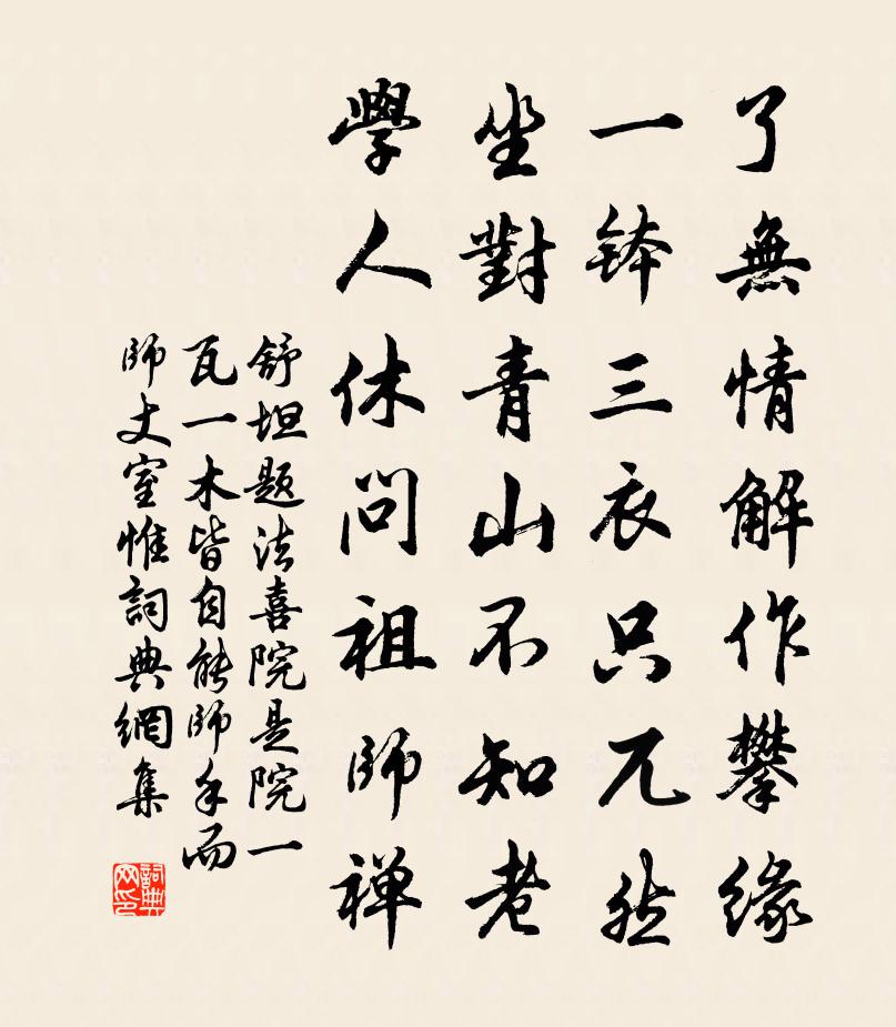 詩詞名句歷史字典書法欣賞書法字典國語詞典說文解字康熙字典古漢語字典標 題 作 者 詩 句 題法喜院是院一瓦一木皆自能師手而師丈室惟作者:舒坦 朝代:宋代原文了無情解作攀緣,一缽三衣只兀然。坐對青山不知老,學人休問祖師禪。詩詞問答問:《題法喜院是院一瓦一木皆自能師手而師丈室惟》的作者是誰?答:舒坦問:該詩寫於哪個朝代?答:宋代書法欣賞題法喜院是院一瓦一木皆自能師手而師丈室惟書法作品詩文賞析【原題】:題法喜院是院一瓦一木皆自能師手而師丈室惟布衾木枕無復長物即之坐龐眉皓頂泊然似不能言者無乃真有道者耶詩詞推薦滿庭芳 贈范明叔王處一〔元代〕寸步西流,沖開牛斗,清風皓月容光。滿寬空眾,把我好相將。俯賜鸞驂鳳駕,獻金鼎、丹藥馨香。天河轉,星壇次雪峰空老韻二首曾幾〔宋代〕雪峰僧中龍,此道誰與共。蕭然兩伽陀,不舉似大眾。獨貽茶山老,以當蒲塞供。岩花與澗草,信手拈來用。題趙信國墨梅後書宋廣平賦仇遠〔宋代〕素衣喜不污緇塵,貞女江頭見似人。桃李門牆零落盡,江南猶有一枝春。連日酷暑異常攄悶而作晁說之〔宋代〕寒暑平分,東南之徼,何多暍哉。遠望炎洲,近觀火井,相與朝燼而夕灰。名曰冰紈霜練,服之一縷如十襲,而信送嶺南盧判官罷職歸華陰山居許渾〔唐代〕曾事劉琨雁塞空,十年書劍任飄蓬。東堂舊屈移山志,南國新留煮海功。還掛一帆青海上,更開三徑碧蓮中。關西題戴溪亭林東〔宋代〕溪亭故事幾年華,來值秋霖眺望賒。雲障山巒多少處,雨埋煙火兩三家。水肥去馬行高阪,汀沒閒鷗上淺沙。誰是洞仙歌(趙史君送紅梅)陳造〔宋代〕蝶狂風鬧,不到凝香地。誰見飛瓊巧梳洗。厭孤標冷艷,不入時宜,銀燭底,酒沁冰肌未睡。東君憐索寞,分寄寒和主司王起(一作和主司酬周侍郎)李潛〔唐代〕文學宗師心秤平,無私三用佐貞明。恩波舊是仙舟客,德宇新添月桂名。蘭署崇資金色重,蓮峰高唱玉音清。羽毛頌一百則釋重顯〔宋代〕了事衲僧消一箇,長連床上展腳臥。夢中曾說悟圓通,香水洗來驀面唾。癸酉元日吳錫疇〔宋代〕一聲爆竹又驚春,荼壘中間寫此心。忽忽行年周六甲,便便痴腹擬三壬。酒泉郡里寧甘飲,飯顆山頭尚苦吟。強健贈奭山人薛師石〔宋代〕何人養道得如君,房接高樓半入雲。山地栽梅寒蕊瘦,瓦爐留火夜香熏。看經尋義心逾靜,默坐觀身耳不聞。莫道答仲肅梅洪咨夔〔宋代〕巡檐索笑為疏花,便未開花亦自佳。帶月折歸香在手,鬧觀塞破路三丫。御街行·街南綠樹春饒絮晏幾道〔宋代〕街南綠樹春饒絮,雪滿遊春路。樹頭花艷雜嬌雲,樹底人家朱戶。北樓閒上,疏簾高卷,直見街南樹。闌乾倚盡猶夏夜上谷宿開元寺賈島〔唐代〕詩成一夜月中題,便臥松風到曙雞。帶月時聞山鳥語,郡城知近武陵溪。黃檗寺一首劉克莊〔宋代〕猶記垂髫到此山,重遊客鬢已雕殘。寺經水後增輪奐,僧比年時減缽單。絕壑雲興潭影黑,疏林霜下葉聲乾。平生送韓嶼秀才南遊趙湘〔唐代〕楊柳一蟬清,關河九日行。卻來時未熟,此去雨初晴。仆懶嫌書重,驢幽喜骨輕。還因得新句,山寺遍題名。和劉卿材十詠溪橋黃庶〔宋代〕憶得別離日,鄉橋柳腳斜。讀君詩一轉,全似到吾家。水調歌頭(鞏采若壽)辛棄疾〔宋代〕泰岳倚空碧,汶□捲雲寒。萃茲山水奇秀,列宿下人寰。八世家傳素業,一舉手攀丹桂,依約笑談間。賓幕佐儲副程伊川贊陳長方〔宋代〕道如皎日,絲毫不隔。人自迷之,轉南為北。寥寥千載,{角戢}{角戢}百家。精罷力憊,言多道遐。惟吾夫子菩薩蠻趙令畤〔宋代〕長淮渺渺寒煙白。憑闌人是霜台客。詩句妙春豪。風雲不啻高。樽前人已老。餘恨連芳草。一麯酒醒時。梧桐月欲名句推薦故音樂者,所以動盪血脈,通流精神而和正心也。司馬遷《史記·樂書》 伯牙鼓琴,志在高山佚名《伯牙鼓琴/伯牙絕弦》 參軍春思亂如雲,白髮題詩愁送春歐陽修《春日西湖寄謝法曹歌》 道傍榆莢仍似錢,摘來沽酒君肯否。岑參《戲問花門酒家翁》 人面不知何處去,桃花依舊笑春風。崔護《題都城南莊》 處事要代人作想,讀書須切己用功。王永彬《圍爐夜話·第五則》 正江令恨別,庾信愁賦劉辰翁《蘭陵王·丙子送春》 見而不見,聞而不聞,知而不知。韓非及後人《韓非子·主道》 明月青山夜,高天白露秋。李嶠《同賦山居七夕》 過眼年華,動人幽意,相逢幾番春換。王沂孫《法曲獻仙音·聚景亭梅次草窗韻》