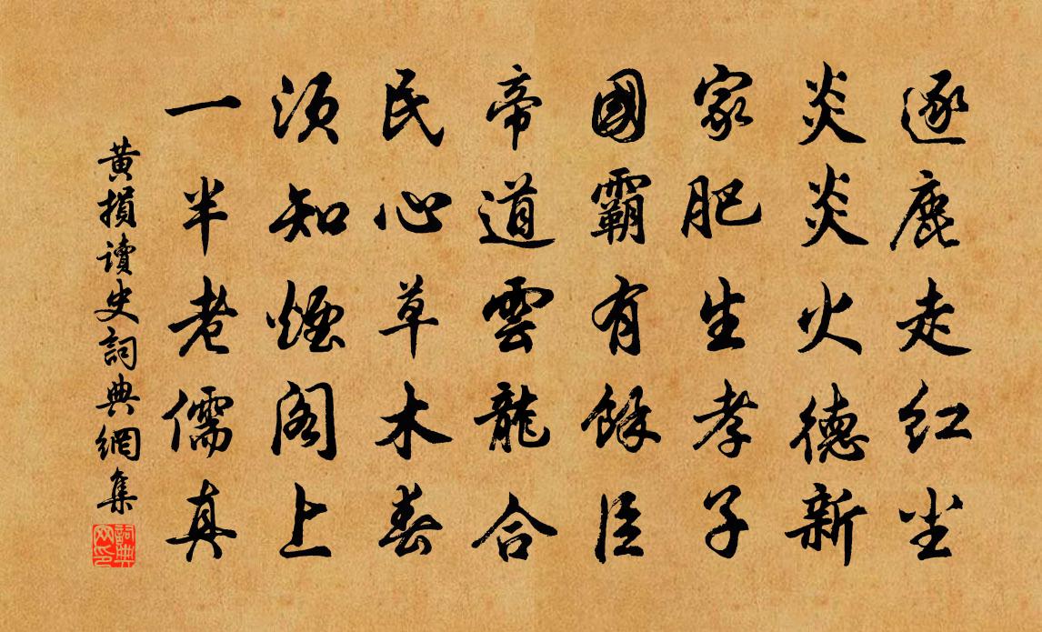 詩詞名句歷史字典書法欣賞書法字典國語詞典說文解字康熙字典古漢語字典標 題 作 者 詩 句 讀史作者:黃損 朝代:唐代讀史原文逐鹿走紅塵,炎炎火德新。家肥生孝子,國霸有餘臣。帝道雲龍合,民心草木春。須知煙閣上,一半老儒真。詩詞問答問:讀史的作者是誰?答:黃損問:讀史寫於哪個朝代?答:唐代問:讀史是什麼體裁?答:五律黃損讀史書法欣賞讀史書法作品注釋全唐詩:卷734-15詩詞推薦贈蔡俊民挾雷法妝眼科北行陳杰〔宋代〕乖龍捲雨焦土山,妖蟆蝕晴長夜漫。安得霹靂鞭龍起,取光還天磔蟆死。寥落風霆道術空,坐看短世入盲聾。南人點絳唇 詠海棠張弘范〔元代〕醉臉勻紅,向人無語夸顏色。一枝春雪。猶染嵬坡血。庭院黃昏,燕子來時節。芳心折。露垂香頰。羞對開元月。洛陽春吟邵雍〔宋代〕四方景好無如洛,一歲花奇莫若春。景好花奇精妙處,又能分付與閒人。病中偶書劉應時〔宋代〕老來懶與俗浮沉,何況厭厭病日侵。身外閒愁總餘事,世間無藥勝安心。雨余秋色悽然冷,風弄晚雲晴復陰。習氣送天童普和尚釋重顯〔宋代〕迢迢別海涯,帆掛杪秋時。島樹落寒葉,人誰訪祖師。浪開游象急,天闊過鴻遲。早晚歸林下,千徒不共知。玉樓春(五之五·大石調)柳永〔宋代〕閬風歧路連銀闕,曾許金桃容易竊。烏龍未睡定驚猜,鸚鵡能言防漏泄。匆匆縱得鄰香雪,窗隔殘煙簾映月。別來紹興祀太社太稷十七首佚名〔宋代〕[南呂為羽]國主社稷,時祀有常。肅若舊典,報本不忘。粢盛豐潔,歌吟青黃。尊神倏來,百物賓將。擬王右丞瓜園宋祁〔宋代〕荷鋤往瓜田,煙蔓紛廣疇。植杖未及憇,有客眷林丘。騶哄羅戶前,冠蓋蔭道周。進客北堂上,藉以氍毺柔。持盃寄大洪和尚釋正覺〔宋代〕飲茶作別出蘿門,相送猶懷握手溫。斷雁幾時歸綴字,浮萍隨處臥生根。秋風窗外擁蘆雪,夢冷床頭墮月魂。麈柄四月解官渡海陸出北流置舟在南雄又陸出擬小曾豐〔宋代〕歸心如矢路知弓,坐兀輕車又短篷。百爾動搖山特立,千斯窒礙水旁通。往載火倒西流影,行矣霜回北至風。細數山中四絕句趙蕃〔宋代〕武夷仙伯定能詩,解賞仙人張湛詞。更誦人間可哀曲,飄飄亦復動人思。和姜邦傑贈別葉翥〔宋代〕研席當時輩,凋零隻兩翁。榮歸會面喜,話舊此心同。景物詩篇富,交情古道隆。明朝斟別酒,問訊付郵筒。呈陳介叔陳宗遠〔宋代〕青帝東來駕彩韉,燒燈過後少晴天。逢春已辦穿花屐,阻雨先尋載酒船。但覺野雲生樹外,不知溪水漲灘前。落梅陳梅隱求詩朱南傑〔宋代〕旱歲走江湖,那堪又歲除。隱梅非活計,行李盍寧居。自有珠璣集,不攜朝貴書。酬君無好語,索笑謾躊躇。仙遊潭五首馬融石室蘇轍〔宋代〕扶風貴公子,早歲伴山家。吹笛墮秋葉,讀書隨曉鴉。業成心自叛,學苦我長嗟。石室非人住,窮山雪似沙。續韋蟾句武昌妓〔唐代〕悲莫悲兮生別離,登山臨水送將歸。武昌無限新栽柳,不見楊花撲面飛。晚眺二首林季仲〔宋代〕病與老相守,慵思靜自便。故園三徑菊,歸路一蓑煙。高下雲連谷,縱橫水護田。淒涼千古事,簇簇夕檐前。夏中雜興陸游〔宋代〕心慕羲農世,躬行黃老言。采椽聊築舍,橫木即為門。短髮冠龜屋,空床枕竹根。從來薄世味,染指肯嘗黿?掛金索高道寬〔元代〕萬萬餘車,白面一和。調餅圓成,彷似天來大。混沌蒸熟,恰好則一個。順手拈來,看是誰嚼破。題李都畫枯木李石〔宋代〕毫端看運斤,筆老木亦老。莫盡春風枝,秋來厭枯槁。名句推薦藥醫不死病,佛度有緣人。馮夢龍《醒世恆言·卷十》 待人寬一分是福,利人實利己的根基。洪應明《菜根譚·概論》 拔劍擊大荒,日收胡馬群。杜甫《後出塞五首》 罪不自招,密而舉之則顯。來俊臣《羅織經·問罪卷第十》 朗月清風,濃煙暗雨,天教憔悴度芳姿。李清照《多麗·詠白菊》 願得此身長報國,何鬚生入玉門關。戴叔倫《塞上曲二首·其二》 富貴易生禍端,必忠厚謙恭,才無大患王永彬《圍爐夜話·第六三則》 志不可不高,志不高,則同流合污,無足有為矣王永彬《圍爐夜話·第三十則》 興盡晚回舟,誤入藕花深處。李清照《如夢令·常記溪亭日暮》 曉戰隨金鼓,宵眠抱玉鞍。李白《塞下曲六首·其一》