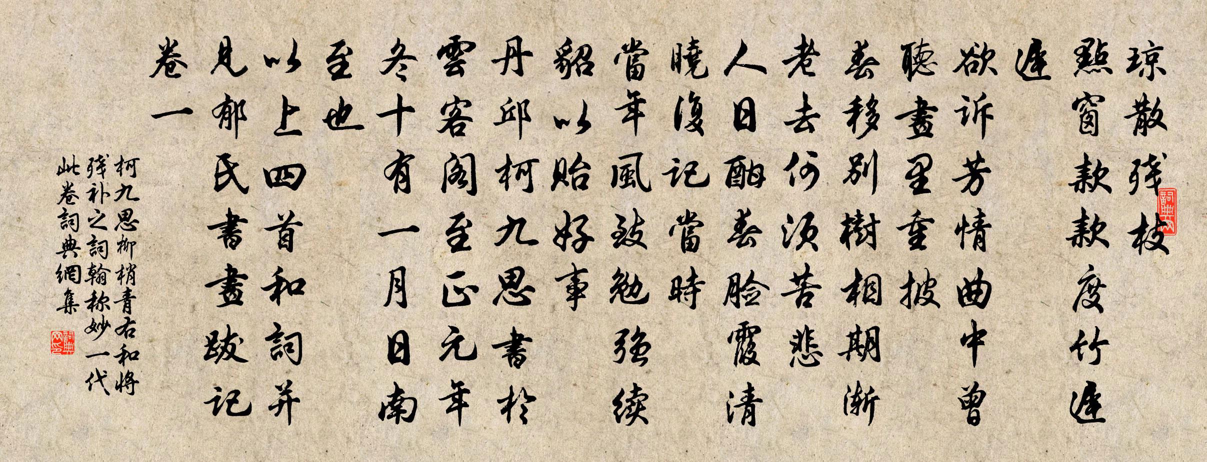 詩詞名句歷史字典書法欣賞書法字典國語詞典說文解字康熙字典古漢語字典標 題 作 者 詩 句 柳梢青 右和將殘補之詞翰,稱妙一代,此卷作者:柯九思 朝代:元代原文瓊散殘枝。點窗款款,度竹遲遲。欲訴芳情,曲中曾聽,畫裡重披。春移別樹相期,漸老去、何須苦悲。人日酣春,臉霞清曉,復記當時。當年風致,勉強續貂,以貽好事。丹邱柯九思書於雲客閣,至正元年冬十有一月日南至也。以上四首和詞並見郁氏書畫跋記卷一。詩詞問答問:《柳梢青 右和將殘補之詞翰,稱妙一代,此卷》的作者是誰?答:柯九思問:該詩寫於哪個朝代?答:元代問:該詩是什麼體裁?答:詞書法欣賞柳梢青 右和將殘補之詞翰,稱妙一代,此卷書法作品詩詞推薦坐池上看水偶成五絕句宋庠〔宋代〕橋腳時依樹,階唇便作河。初無心可洗,誰作洗心歌。寒夜袁枚〔清代〕寒夜讀書忘卻眠,錦衾香盡爐無煙。美人含怒奪燈去,問郎知是幾更天!山居詩釋延壽〔宋代〕焦翼枯鱗成底事,分明可驗莫愁哉。君恩只可量功受,世利應須任運來。豈信敗從成處得,誰知榮是辱邊媒。但看念奴嬌 孝陵鄭燮〔清代〕東南王氣,掃偏安舊習,江山整肅。老檜蒼松盤寢殿,夜夜蛟龍來宿。翁仲衣冠,獅麟頭角,靜鎖苔痕綠。斜陽斷禺山方信孺〔宋代〕禺山何事作番山,空有陂陀跡已漫。今日升堂聽絲竹,沉香不見舊闌乾。鷓鴣天(中秋後一夕宴修成之、富正甫作)郭應祥〔宋代〕萬里澄空沒點雲。素娥依舊駕冰輪。自緣人意看承別,未必清輝減一分。傾白墮,擁紅裙。不知誰主復誰賓。更籌岳鍾琪入覲詩以賜之乾隆〔清代〕劍佩歸朝矍鑠翁,番巢單騎志何雄!功志淮蔡無慚李,翼奮澠池不獨馮。早建奇勳能鼓勇,重頒上爵特褒忠。西南句邵伯溫〔宋代〕秀近亭邊回首處,郡城高插水雲間。半山寺汪宗臣〔宋代〕往事空求佛,當年誤買鄰。悠悠思舐犢,煙雨暗松筠。正紀用暮春韻見貽復和三章郭印〔宋代〕自得無為理,行藏異世人。片雲塵外侶,流水洞中賓。思慮何勞遣,形神已覺親。超然閱眾甫,陵谷幾回新。禽言丘葵〔宋代〕春泥滑滑雨瀟瀟,田父力作收墜樵。歸來不敢道姑惡,我自忘卻婆餅焦。去年冬旱無麥熟,阿婆餅焦難再得。門前壽陽王花燭圖(一作沈佺期詩)宋之問〔唐代〕仙媛乘龍日,天孫捧雁來。可憐桃李樹,更繞鳳凰台。燭照香車入,花臨寶扇開。莫令銀箭曉,為盡合歡杯。清明釋文珦〔宋代〕客路驅馳足自憐,壯懷消歇在花先。暖床寂寞聽風雨,孤負清明又一年。讓皇帝廟樂章奠幣李紓〔唐代〕惟帝時若,去而上仙。祀用商武,樂備宮懸。白璧加薦,玄纁告虔。子孫拜後,承茲吉蠲。布袋贊釋祖欽〔宋代〕一笑生春風,雙瞳湛秋水。日月拄杖頭,乾坤布袋裡。彌勒忽然下生,何處尋你。次韻山居胡仲弓〔宋代〕夕陽漏影射疎林,三兩人家桑柘陰。鶻過桚開歸鳥路,鐘敲撞碎野猿心。常因境勝甘忘食,不為家貧輒廢吟。說與河中孫學士以詩見寄因次本韻繼和三章用為酬魏野〔宋代〕入居蘭省歸群望,出守薄關自聖知。清禁乍辭仙漏遠,白樓閒上彩牋隨。伯夷廟下停金勒,大舜門中亞繡旗。遙想西江月 以上二首見紙舟先生全真直指,注謂紙舟先生〔元代〕光徹虛空上下,人人具足無虧。全真真里露真機。實證無為不二。掃去閒名野字,胸中莫滯些兒。七真五祖只如斯題清蘿翁雙泉耿湋〔唐代〕側弁向清漪,門中夕照移。異源生暗石,疊響落秋池。葉擁沙痕沒,流回草蔓隨。泠泠無限意,不獨遠公知。如夢令 饒德明學士收疏齊詠竹二首,求和許有壬〔元代〕誰把清風領受。尋得歲寒心友。霜月玉亭亭,恰似老夫詩瘦。詩瘦。詩瘦。無柰碧雲懷舊。名句推薦大直若屈,大巧若拙,大辯若訥。老子《老子·德經·第四十五章》 止謗莫如修身徐幹《中論·上卷·虛道》 良醫之門多病人。荀子《荀子·法行》 一晌凝情無語,手捻梅花何處。王之道《如夢令·一晌凝情無語》 始知鎖向金籠聽,不及林間自在啼。歐陽修《畫眉鳥》 孔雀東南飛,五里一徘徊。佚名《孔雀東南飛 / 古詩為焦仲卿妻作》 停船暫借問,或恐是同鄉。崔顥《長干行·君家何處住》 白雁亂飛秋似雪,清露生涼夜。吳西逸《清江引·秋居》 遠看山有色,近聽水無聲王維《畫》 先生名利比塵灰,綠竹青鬆手自栽。王汝舟《詠歸堂隱鱗洞》