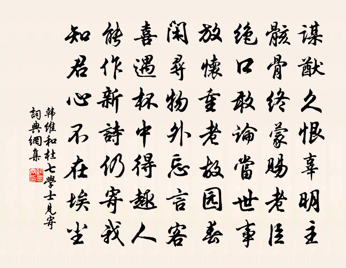 詩詞名句歷史字典書法欣賞書法字典國語詞典說文解字康熙字典古漢語字典標 題 作 者 詩 句 和杜七學士見寄作者:韓維 朝代:宋代和杜七學士見寄原文謀猷久恨辜明主,骸骨終蒙賜老臣。絕口敢論當世事,放懷重老故園春。閒尋物外忘言客,喜遇杯中得趣人。能作新詩仍寄我,知君心不在埃塵。詩詞問答問:和杜七學士見寄的作者是誰?答:韓維問:和杜七學士見寄寫於哪個朝代?答:宋代韓維和杜七學士見寄書法欣賞和杜七學士見寄書法作品詩詞推薦贈海上觀音院文依上人李中〔唐代〕煙霞海邊寺,高臥出門慵。白日少來客,清風生古松。虛窗從燕入,壞屐任苔封。幾度陪師話,相留到暮鍾。蓬萊客 勸回馬鈺〔元代〕休急急。儒家本是蓬瀛客。蓬瀛客。謫居塵世,香花相隔。數船網罟焚無測。度仙橋上難沈溺。難沈溺。濟人道路辛亥二月望祭齋公因游甘園朱繼芳〔宋代〕山入湖光碧四圍,棋枰零落葑田稀。蒲芽短短鴛鴦冷,惟有漁師幾綱歸。大雪約程以忠不至次日以詩問之方回〔宋代〕禦寒時著火文武,等醉豈拘杯聖賢。土潤春應萌有日,塵清野更潔於天。誰呵凍筆詩能畫,獨上高崗意欲仙。剩有廬山愛蓮堂觀雨陳宓〔宋代〕秀色真香先自清,更將輕雨出芳明。蕭蕭打葉雖堪聽,爭似時時瀉水聲。上竺真辯師趙企〔宋代〕一別支公僅兩年,山房高隱尚恬然。心清已澈靈泉奧,行峻應磨峭壁堅。俗眼不來青障里,孤峰誰認白雲邊。更期楊柳枝 贈雲中子蘇鉉馬鈺〔元代〕猛棄榮華兒女妻。悟玄機。騰騰兀兀任無為。做憨痴。雲水不游芳草徑,內行持。功成行滿獨何之。赴瑤池。詩李嶠〔唐代〕都尉仙鳧遠,梁王駟馬來。扇中紈素制,機上錦紋回。天子三章傳,陳王七步才。緇衣久擅美,祖德信悠哉。和何季崇簽判三首曹勛〔宋代〕羈思登臨已怯秋,紫萸 * 更添愁。海光不動暮山紫,人在天涯空倚樓。句湖州士子〔宋代〕可憐載工部,獨樹不成林。覽鏡喻良能〔宋代〕平生壯夫志,老去未消磨。其奈青銅里,蕭蕭雙鬢何。從沈文伯乞娑羅樹碑芮燁〔宋代〕楚州淮陰娑羅樹,霜露榮悴今何如。能令草木死不朽,當時為有北海書。荒碑雨侵澀苔蘚,尚想墨本傳東吳。勸農和孟大監韻朱宗強〔宋代〕祥開龍角應三農,小隊旌旗獵獵風。秧馬趣行田陌外,檣烏飛送櫓聲中。穰翁預喜甌窶滿,饁婦毋憂杼軸空。觀稼送張如瑩強至〔宋代〕柏城親見五雲飛,歸奏嚴宸侍玉墀。重待三長專筆削,新遷八座總綱維。卻緣關輔初通屬,便向齋壇去把麾。暫使與毛茶乾趙司法游東湖四首任希夷〔宋代〕才雋真龍種,官閒似馬曹。班揚趨後勝,李杜漫殘膏。阿閣宜巢鳳,詞林合跨鰲。未應久留滯,湖海只詩豪。題招提院靜照堂王益柔〔宋代〕構堂幽僻斷塵蹤,靜照為名我所通。一室可知天下事,十方齊見定心中。清朝雲散層峰出,後夜潮回漲海空。槜李病中即事三首王炎〔宋代〕附火膚革燥,遠火寒慘慘。坐臥置湯婆,稍覺兩足暖。抓搔不停手,苛癢殊未減。飲食固多忌,所幸能強飯。客至秋熱王安石〔宋代〕火騰為虐不可摧,屋窄無所逃吾骸。織蘆編竹繼檐宇,架以松櫟之條枚。豈惟賓至得清坐,因有餘地蘇陪台。愆陽和夔峽張憲白帝城懷古邵雍〔宋代〕不憤曹公跨許昌,苟非梁益莫爭王。三分區宇風雷惡,橫截西南氣勢強。行客往來閒指點,史官褒貶浪文章。後人挽王遠叔文天祥〔宋代〕孟嘗生五日,白首嘆遭逢。燈火殘編雨,虀鹽短褐風。八天下鵰鶚,半水偃蛟龍。原上諸生哭,黃花衰草中。名句推薦四時有不謝之花,八節有長青之草。李汝珍《鏡花緣·第一回》 莫辭酒味薄,黍地無人耕。杜甫《羌村三首·其三》 歲寒,然後知松柏之後凋也。孔子弟子《論語·子罕篇》 求之有道,得之有命,是求無益於得也,求在外者也。孟子《孟子·盡心章句上·第三節》 雨里雞鳴一兩家,竹溪村路板橋斜。王建《雨過山村》 香聞流水處,影落野人家。道源《早梅》 願妾身為紅菡萏。年年生在秋江上。歐陽修《漁家傲·近日門前溪水漲》 獨抱濃愁無好夢,夜闌猶剪燈花弄。李清照《蝶戀花·暖雨晴風初破凍》 雨色秋來寒,風嚴清江爽。李白《酬裴侍御對雨感時見贈》 月出驚山鳥,時鳴春澗中。王維《鳥鳴澗》