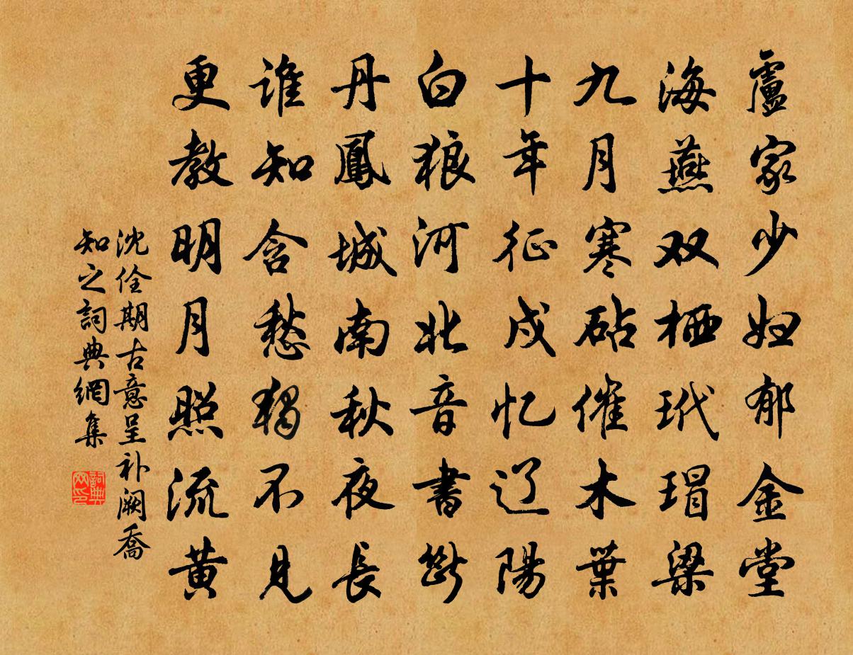 首聯“盧家少婦鬱金堂,海燕雙棲玳瑁梁 ”,敘述簡練,比興自然。盧家少婦,名莫愁,是南朝民歌《河中之水歌》里的人物,後用作少婦的代稱。起句借用《河中之水歌》的意境,言簡意賅、精妙入微地介紹了思婦的身世和處境 。她的家庭環境華麗溫馨,她的生活卻冷落淒清 。“海燕雙棲玳瑁梁 ”,一句反襯 ,興起了全篇無限綿綿的愁思。她寂然獨居空閨,哪裡比得上相親相愛雙棲於樑上的燕子呢?