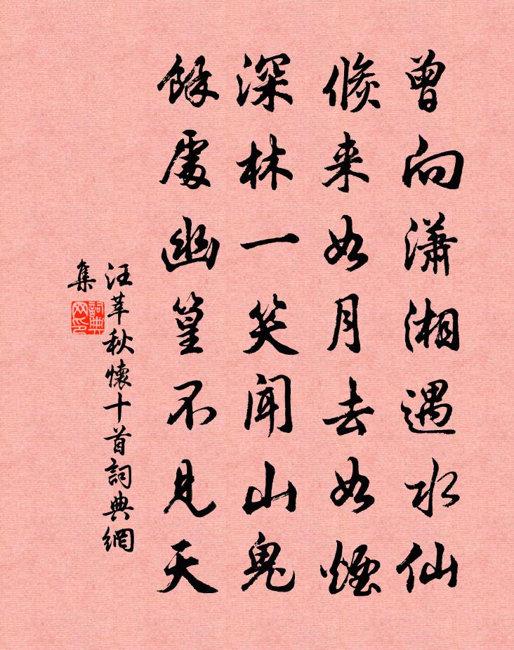 詩詞名句歷史字典書法欣賞書法字典國語詞典說文解字康熙字典古漢語字典標 題 作 者 詩 句 秋懷十首作者:汪莘 朝代:宋代秋懷十首原文曾向瀟湘遇水仙,倏來如月去如煙。深林一笑聞山鬼,余處幽篁不見天。詩詞問答問:秋懷十首的作者是誰?答:汪莘問:秋懷十首寫於哪個朝代?答:宋代汪莘秋懷十首書法欣賞秋懷十首書法作品詩詞推薦寄題曹大夫棲真堂韓維〔宋代〕聞君初欲掛冠纓,便構茲堂不日成。桐檜茂陰歸後得,煙霞高興坐中生。禪心皎月通宵靜,詩思寒泉徹底清。十五夏州道中黃滔〔唐代〕隴雁南飛河水流,秦城千里忍回頭。征行渾與求名背,九月中旬往夏州。十喻詩 幻詩蕭衍〔南北朝〕揮霍變三有。恍惚隨六塵。蘭園種五果。雕案出八珍。對見不可信。熟視事非真。空生四岳想。徒勞七識神。著幻挽鄧知縣友龍廖行之〔宋代〕別向巴丘去,歸從浙水來。絕憐三益友,高臥九泉台。清會成陳跡,明時失茂才。無因陪祖奠,風壑寄余哀。七夕楊朴〔宋代〕未會牽牛意若何,須邀織女織金梭。年年乞與人間巧,不道人間巧已多。挽奚公彥章承奉詩虞儔〔宋代〕已識嵇中散,誰慚王濬沖。鴻飛嗟目斷,鶴化駭群空。懶作金門客,寧為鐵面翁。後園花木在,回首又春風。吐蕃別館月夜呂溫〔唐代〕三五窮荒月,還應照北堂。回身向暗臥,不忍見圓光。歷代詩西周楊簡〔宋代〕后稷文王世幾傳,武王方得天下全。成康昭穆及共懿,孝夷之後厲兼宣。幽王見殺平王立,以上凡經四百年。倪尚書生祠華岳〔宋代〕聞說先生入建都,一年民樂吏清癯。四廂夜月封朱戶,兩院春風鎖翠蕪。一旦有書追駟馬,萬冤無計徹群烏。焚香句秦觀〔宋代〕斷霞一抹海天低。次韻王適春雪二首蘇轍〔宋代〕江南春候寒猶劇,細雨風吹作雪花。中夜窗扉初晃漾,平明草木半低斜。潤催江柳排金線,光雜山茶點絳葩。老病梅初破蕊陳著〔宋代〕朔風驚曉雪花乾,盡力尋梅不道寒。萬事不如初見好,一枝全勝滿園看。次韻蔡仲平察院中秋葛立方〔宋代〕不是銀河隱半輪,滿天散彩絕埃塵。幽懷想得如羅隱,耿耿相看似故人。題東山玩月圖黃庚〔宋代〕斜陽紅盡暮雲碧,一片天光涵水色。海濤擁出爛銀盤,千里嬋娟共今夕。主人鄰客登東山,踏碎寒光看秋液。星河朝天門城角仇遠〔宋代〕颯颯秋風起白榆,山前吹徹小單于。行人便作邊城聽,忘卻杭州是故都。最高樓(散後)毛滂〔宋代〕微雨過,深院芰荷中。香冉冉,繡重重。玉人共倚闌乾角,月華猶在小池東。入人懷,吹鬢影,可憐風。分散去、楊信伯郎中挽章二首呂祖謙〔宋代〕並舍游從舊,同朝分義深。時時墜書札,得得到山林。北去先移棹,南來後盍簪。死生離合地,搔首一悲吟。關山五首孔武仲〔宋代〕山溪百轉水泠泠,栽插新秧次第成。風趕綠茸無斷處,他時粒粒是香粳。導引佚名〔宋代〕重親萬壽,八帙衍新元。禮典備文孫。溫溫和氣迎長日,寶冊煥瑤琨。徽音顯號自堯門。德行已該存。更期昌算齊轉調定風波(和答海南統領陳康時)胡銓〔宋代〕從古將軍自有真。引杯看劍坐生春。擾擾介鱗何足掃。談笑。綸巾羽扇典刑新。試問天山何日定。佇聽。雅歌長嘯名句推薦疑行無成,疑事無功。商鞅《商君書·更法》 吳王好劍客,百姓多創瘢;楚王好細腰,宮中多餓死。司馬光《資治通鑑·漢紀·漢紀三十八》 清鏡無雙影,窮泉有幾重。顧況《酅公合祔輓歌》 今日漢宮人,明朝胡地妾。李白《王昭君二首》 亦知合被才名折,二十三年折太多。白居易《醉贈劉二十八使君》 殘燈明滅枕頭欹,諳盡孤眠滋味。范仲淹《御街行·秋日懷舊》 北風其涼,雨雪其雱。佚名《北風》 應無所住而生其心。鳩摩羅什譯《金剛經·莊嚴淨土》 造物無言卻有情,每於寒盡覺春生。張維屏《新雷》 正西望長安,下見江水流。李白《秋浦歌十七首》