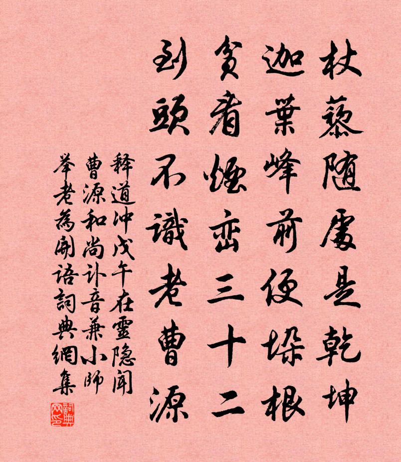 詩詞名句歷史字典書法欣賞書法字典國語詞典說文解字康熙字典古漢語字典標 題 作 者 詩 句 戊午在靈隱聞曹源和尚訃音兼小師舉老為開語作者:釋道沖 朝代:宋代原文杖藜隨處是乾坤,迦葉峰前便垛根。貧看煙巒三十二,到頭不識老曹源。詩詞問答問:《戊午在靈隱聞曹源和尚訃音兼小師舉老為開語》的作者是誰?答:釋道沖問:該詩寫於哪個朝代?答:宋代書法欣賞戊午在靈隱聞曹源和尚訃音兼小師舉老為開語書法作品詩文賞析【原題】:戊午在靈隱聞曹源和尚訃音兼小師舉老為開語錄詩詞推薦哭橋陵何夢桂〔宋代〕百年弓劍入橋陵,豈料三泉化劫塵。空有魚燈照荒土,忍將玉軸問遺民。蒼梧日落啼丹雀,金粟雲深臥石麟。寒食寓故里大中寺值朱起蔡同宿數夜陳藻〔宋代〕壯遊初到鄭公鄉,與子吟喔古佛旁。老去同時人死盡,那知來此話僧房。新竹元稹〔唐代〕新篁才解籜,寒色已青蔥。冉冉偏凝粉,蕭蕭漸引風。扶疏多透日,寥落未成叢。惟有團團節,堅貞大小同。詠黃鶯(一作鄭愔詩,又作鄭縉)孫處玄〔唐代〕欲囀聲猶澀,將飛羽未調。高風不借便,何處得遷喬。三代門平王周曇〔唐代〕犬戎西集殺幽王,邦土何由不便亡。宜臼東來年更遠,川流難絕信源長。迎暉閣舒清國〔宋代〕藹藹復依依,朝暉以夕暉。岩花寒不落,檐鳥靜忘飛。僧自眠黃葉,人多夢翠微。雲邊時見鹿,飲水近禪扉。洴溪橋趙渥〔宋代〕油井小聚,洴溪之濱。夏秋雨集,溝澮皆盈。眾水所匯,實病於行。誰作斯橋,龐君守真。寧瘠一已,而利他人。石鐘山記蘇軾〔宋代〕《水經》云:“彭蠡之口有石鐘山焉。”酈元以為下臨深潭,微風鼓浪,水石相搏,聲如洪鐘。是說也,人常疑之馬伏波請征蠻據鞍矍鑠時年六十一陸鴻漸景陵鄭剛中〔宋代〕去年寥落征鞍急,矍鑠殊非馬伏波。今此有緣希陸羽,暮途求佛又何如。宮詞一百首岳珂〔宋代〕折檻朱雲諫未休,一封曾斬佞臣頭。猶憐不入先朝議,遺恨山河繞雍州。余壬戌春校試進士同事者五十五人至戊子歲因吳芾〔宋代〕校試群才一日中,當時五十五人同。二十七年零落盡,只存我與二三公。元日詞其三內廷晏殊〔宋代〕池冰初解雪初消,十二重城曉日高。颯颯和風繞珠樹,千年春色在蟠桃。率庵歌釋梵琮〔宋代〕三間茅屋堪投老,草草生涯隨分好。月池當戶鏡光寒。竹逕繞檐通大道。風吹葉葉自成堆,信手拈來一莖草。賤如趙月堂來問比日何似答曰陳著〔宋代〕欲死不死命相若,此心何心誰得知。湖海逢人借問我,為說如醉如盲痴。與耿天騭會話王安石〔宋代〕邯鄲四十餘年夢,相對黃粱欲熟時。萬事只如空鳥跡,怪君強記尚能追。和丁使君八詠樓姜特立〔宋代〕八詠詩成沈隱侯,樓中風月盡兼收。三千題里無新語,七百年間有勝流。領客登臨聊一快,舉杯相屬更無憂。令威十一月二日與陸明府陳廣文黃使君吳都曹江廣喻良能〔宋代〕菊色猶黃處,梅花未發天。三山千里客,一笑六同年。公等多朱紱,予方乏坐氈。清談仍痛飲,應作畫圖傳。水調歌頭汪莘〔宋代〕寄語山阿子,何日出幽篁。蘭衣蕙帶,為我獨立萬尋岡。頭上青天蕩蕩,足下白雲靄靄,和氣自悠揚。一陣東風至華清詞(一作華清宮詞)劉禹錫〔唐代〕日出驪山東,裴回照溫泉。樓台影玲瓏,稍稍開白煙。言昔太上皇,常居此祈年。風中聞清樂,往往來列仙。翠華暮歸陸游〔宋代〕意行無所之,偶傍陂頭立。空村犬吠豪,高樹蟬嘒急。風塵一身老,海宇萬感集。還家日已暮,草露青鞋濕。名句推薦還作一段相思,冷波葉舞愁紅,送人雙槳。吳文英《解蹀躞·醉雲又兼醒雨》 以少總多,情貌無遺矣。劉勰《文心雕龍·物色》 且趁閒身未老,盡放我、些子疏狂。蘇軾《滿庭芳·蝸角虛名》 谷不熟為飢,蔬不熟為饉,果不熟為荒,仍飢為薦。佚名《爾雅·釋天》 淇水昨送淚沾巾,紅妝宿昔已應新蕭子顯《春別詩四首·其三》 遙知未眠月,鄉思在漁歌。杜荀鶴《送人游吳》 何日請纓提銳旅,一鞭直渡清河洛。岳飛《滿江紅·登黃鶴樓有感》 床前明月光,疑是地上霜。李白《靜夜思》 以我獨沉久,愧君相見頻。司空曙《喜外弟盧綸見宿》 往年同在鸞橋上,見倚朱闌詠柳綿。韓偓《寒食日重遊李氏園亭有懷》