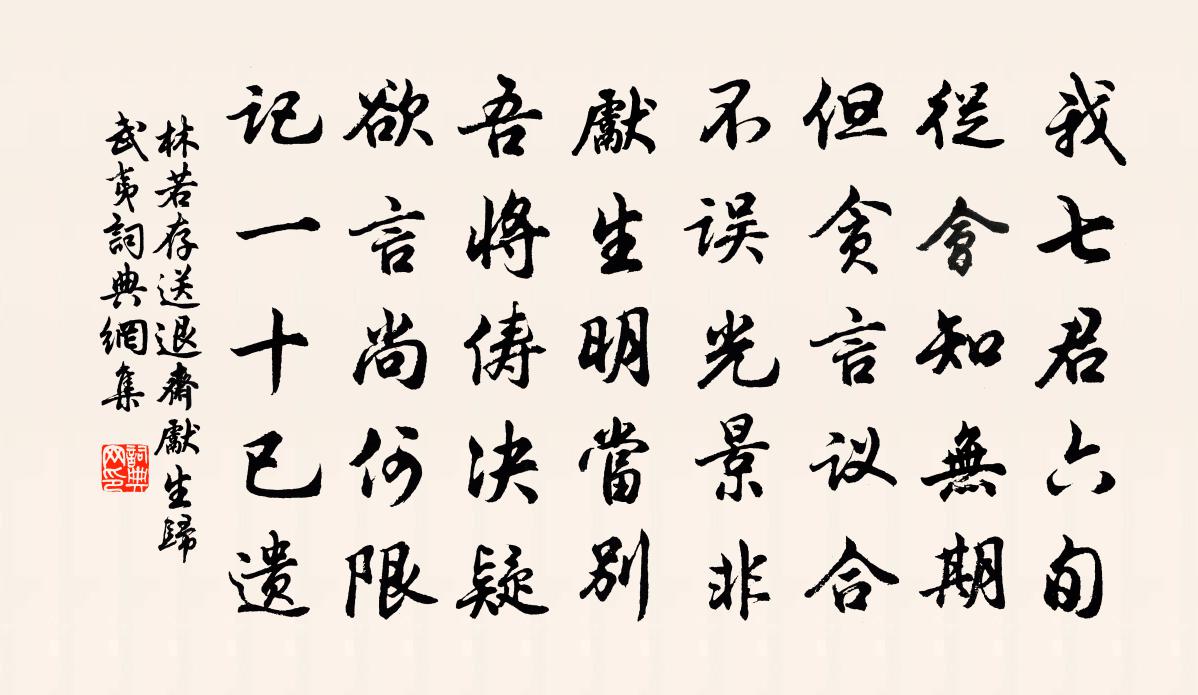 詩詞名句歷史字典書法欣賞書法字典國語詞典說文解字康熙字典古漢語字典標 題 作 者 詩 句 送退齋先生歸武夷作者:林若存 朝代:宋代送退齋先生歸武夷原文我七君六旬,從會知無期。但貪言議合,不誤光景非。先生明當別,吾將儔決疑。欲言尚何限,記一十已遺。詩詞問答問:送退齋先生歸武夷的作者是誰?答:林若存問:送退齋先生歸武夷寫於哪個朝代?答:宋代林若存送退齋先生歸武夷書法欣賞送退齋先生歸武夷書法作品詩詞推薦別李將軍李鹹用〔唐代〕一拜虬髭便受恩,宮門細柳五搖春。男兒自古多離別,懶對英雄淚滿巾。水調歌頭(送趙閬州希異之官)魏了翁〔宋代〕凍雨洗煩濁,烈日霽威光。逸人去作太守,旗志倍精芒。莎外馬蹄香濕,柳下旟陰晨潤,景氣踏蒼蒼。夾道氣成霧謝劉憲惠龍眼詩朱翌〔宋代〕龍目秋成亦一奇,略無瘴霧損瑤肌。荔枝韻勝村誰亞,益智名同性即非。俠士從禽攜彈去,鮫人探海得珠歸。不須句吳沆〔宋代〕挑燈倦夜羞黃裹,置筆窮年結白間。和同官問耳疾六首曹勛〔宋代〕袁宏方詠史,江總得隨時。歸興連天去,文盟落筆知。雨多移蟻垤,花過靜蜂兒。賴有西齋友,薰風正入詩。讀項羽傳二首釋智圓〔宋代〕發歡虞姬拋已窮,烏江此夕喪英雄。當時若也知天命,佐漢應居第一功。失題胡仲弓〔宋代〕謫居姜相庸奚損,貧殺無英直是清。風月分來無著處,摩挲海眼看長鯨。送程德孺赴江西張耒〔宋代〕程侯治楚我獨知,去時民作嬰兒啼。歸來明光見天子,還把一節來江西。年來屢下寬大詔,赤子未免寒與飢。恩如游東山圖劉克莊〔宋代〕亭樹縹緲無點塵,竹樹蒼翠溪粼粼。寶釵導前瑤簪後,三君高屐華陽巾。頎然錦衣者誰氏,道韞諸姑姊長妹。當時送章通判劉克莊〔宋代〕半刺已官尊,常時讀魯論。身居恭叔里,心在晦翁門。貧士來遮路,詩人送出村。君能齊得喪,何必戀華軒。八月初三日五更夢覺追記舒岳祥〔宋代〕林下青衫卸,尊前白髮欹。少年行樂事,暮景感傷時。鍊藥嫌長懶,觀書悔已遲。惜花心性在,時復一吟詩。雨竹圖唐寅〔明代〕解筆淋漓寫竹枝,分明風雨滿天時。此中意恐無人會,更向其間賦小詩。春思方岳〔宋代〕菸草茸茸匝岸齊,晴天鳧浴喜清溪。一春造化花開盡,大欠渠詩共品題。晏成續太祝遺雙井茶五品茶具四枚近詩六十篇梅堯臣〔宋代〕始於歐陽永叔席,乃識雙井絕品茶。次逢江東許子春,又出鷹爪與露芽。鷹爪斷之中有光,蹍成雪色浮乳花。晏公郁山主贊釋智遇〔宋代〕日暖跨驢出,溪橋款步行。因思遭攧處,寸草不曾生。偈頌一百二十三首釋祖欽〔宋代〕斷臂立雪,負石踏實碓。取人心肝,克由尀耐。護聖遮里,使不得你露面作竊,且退且退。送程公辟郎中知洪州二首強至〔宋代〕君王從此不南憂,善付名郎第一州。笳鼓出嚴千騎從,旌麾坐制九諸侯。城巔觀閣屏間見,江底乾坤鏡里浮。門下信府同知黃侯名其讀書之室曰廣居戴表元〔宋代〕隘夫護藩畛,得少便有餘。達士心曠然,清明如太虛。海岳東鼎俎,羲駕走軒車。唯諾無不行,尚懷豚與魚。嗟茲和蔡生遷居二首蔡學佛故用杜老與贊公故事蔡胡寅〔宋代〕浮生何處不蘧廬,且喜飄然乍卜居。一室未應忘灑掃,四鄰聊復認親疎。荔蕉餉客還堪飽,筍蕨登盤莫原余。有意陳正卿示蛤蜊解嘲之作因次來韻吳芾〔宋代〕夫君雅志知誰會,身在寰中心物外。平生初不入州縣,一任傍人驚且怪。日來杖屨忽相過,為我踏破松陰碎。亹亹名句推薦輕解羅裳,獨上蘭舟。李清照《一剪梅·紅藕香殘玉簟秋》 橫笛驚征雁,嬌歌落塞雲。岑參《奉陪封大夫九日登高》 綠蓑江上秋聞笛,紅袖樓頭夜倚欄。曹雪芹《香菱詠月·其三》 萬事不由人做主,一心難與命爭衡。羅貫中《三國演義·第一百十三回》 欲知悵別心易苦,向暮春風楊柳絲。李白《下途歸石門舊居》 紅豆不堪看,滿眼相思淚。牛希濟《生查子·新月曲如眉》 反古者未必可非,循禮者未足多是也。商鞅《商君書·更法》 不入虎穴,焉得虎子。程登吉《幼學瓊林·卷四·鳥獸》 強整繡衾,獨掩朱扉,枕簟為誰鋪設。阮逸女《花心動·春詞》 閒來無事不從容,睡覺東窗日已紅。程顥《秋日》