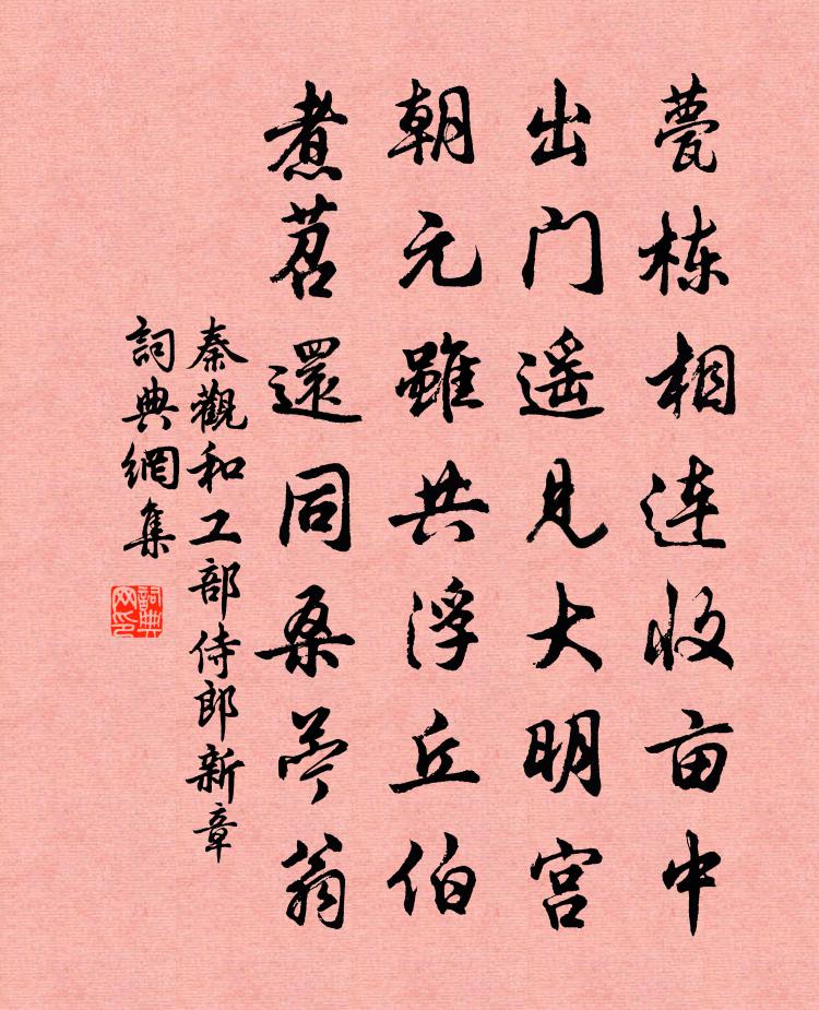 詩詞名句歷史字典書法欣賞書法字典國語詞典說文解字康熙字典古漢語字典標 題 作 者 詩 句 和工部侍郎新章作者:秦觀 朝代:宋代和工部侍郎新章原文甍棟相連收畝中,出門遙見大明宮。朝元雖共浮丘伯,煮苕還同桑薴翁。詩詞問答問:和工部侍郎新章的作者是誰?答:秦觀問:和工部侍郎新章寫於哪個朝代?答:宋代問:秦觀的名句有哪些?答:秦觀名句大全秦觀和工部侍郎新章書法欣賞和工部侍郎新章書法作品詩詞推薦再送正仲梅堯臣〔宋代〕擬君杜鵑花,發當杜鵑時。朱袍照白日,光彩生路岐。自比青鼠爪,中心如亂絲。絲亂復不理,況復遠別離。傾觴退居後以二偈示預環二禪者釋子淳〔宋代〕水最為清月最圓,月光含水水涵天。混融不落威音世,到此如何語正偏。謁金門陳克〔宋代〕春漏促。誰見兩人心曲。罨畫屏風銀蠟燭。淚珠紅蔌蔌。懊惱歡娛不足。只許夢中相逐。今夜月明何處宿。畫橋春池西亭白居易〔唐代〕朱欄映晚樹,金魄落秋池。還似錢唐夜,西樓月出時。次韻和岳醵飲西峰寺分韻成詩十四首見寄陳著〔宋代〕遊了南山山外山,北山下住更幽閒。消磨永日何妨睡,受用清風不用還。答和鄰幾元夕聖俞及予過之韓維〔宋代〕天衢十二大樹春,樓前結彩移嵩岷。遊人袞袞去不已,街頭雪泥踏作塵。駘它館中好古士,紛華過眼輕浮雲。早休浣溪沙蘇軾〔宋代〕麻葉層層苘葉光,誰家煮繭一村香。隔籬嬌語絡絲娘。垂白杖藜抬醉眼,捋青搗買麨軟飢腸。問言豆葉幾時黃。夢館宿二首劉克莊〔宋代〕罡風誤送到蓬萊,昔種琪花今已開。僮鶴來迎俱嘆息,老仙又老仙前回。春日雜書林之奇〔宋代〕昨日為雨備,今晨天乃風。障風謹自保,通夕雪迷空。備一常失計,盡備力不供。因之置不為,拱手受禍凶。當為偈頌一百零一首釋慧性〔宋代〕一葉落,天下秋。一塵起,大地收。明明祖師意,明明百草頭。相頭賣帽,看樓打樓。更嫌何處不風流。又和洪咨夔〔宋代〕終朝聒得耳神飛,東舍西鄰盡販機。百樣攀花無我分,慣將簾作後堂衣。金處士歌楊維楨〔元代〕蘇州古隱君,實始虞仲,隱居放言,中乎清與權。次曰澹臺氏,言不枝,行不徑,未嘗匐走諸侯前。五噫之夫,將水龍吟(丁經之用韻詠園亭,次韻以謝)張榘〔宋代〕近家添得園亭,曉山時看飛雲過。擁石栽梅,疏池傍竹,剪除蕪污。更喜南牆,杏腮桃臉,含羞微露。算鶯花世界玉樓春劉秉忠〔元代〕翠微掩映農家住。水滿玉溪花滿樹。青山隨我入門來,黃鳥背人穿竹去。煙霞隔斷紅塵路。試問功名知此趣。一壺題松汀驛張祜〔唐代〕山色遠含空,蒼茫澤國東。海明先見日,江白迥聞風。鳥道高原去,人煙小徑通。那知舊遺逸,不在五湖中。西江月(瑞香)張掄〔宋代〕翦就碧雲鬧葉,刻成紫玉芳心。淺春不怕峭寒侵。曖徹薰籠瑞錦。花里清芬獨步,尊前勝韻難禁。飛香直到玉杯深自和山房十詠李曾伯〔宋代〕禪房寂寂夜昏昏,相對長明一點燈。舉似新詩共僧話,笑儂綺語污溪藤。金縷曲(和龔竹卿客中韻)劉辰翁〔宋代〕何處從頭說。但傾尊、淋漓醉墨,疏疏密密。看取兩輪東西者,也是樊籠中物。這光景、年來都別。白髮道人隆中寄金山普衲鄭元祐〔元代〕金鰲背上郁藍天,長有神龍衛法筵。午夜江聲推月上,浪花如雪寺門前。金陵雜興二百首蘇泂〔宋代〕青帝言歸速駕忙,荼醾架底靜年芳。輕風乍染陰陰綠,微月低籠淡淡香。名句推薦有一言,無一行,胃(謂)之誣。佚名《黃帝四經·十大經·雌雄節》 春風試手先梅蕊,頩姿冷艷明沙水。趙令畤《菩薩蠻·春風試手先梅蕊》 歷覽前賢國與家,成由勤儉破由奢。李商隱《詠史二首·其二》 小男供餌婦搓絲,溢榼香醪倒接罹。李郢《南池》 繁華事散逐香塵,流水無情草自春。杜牧《金谷園》 關河底事空留客?歲月無情不貸人。于謙《立春日感懷》 君不見,高堂明鏡悲白髮,朝如青絲暮成雪。李白《將進酒》 十月江南天氣好,可憐冬景似春華。白居易《早冬》 西山白雪三城戍,南浦清江萬里橋。杜甫《野望》 若升高,必自下,若陟遐,必自邇。佚名《尚書·商書·太甲下》