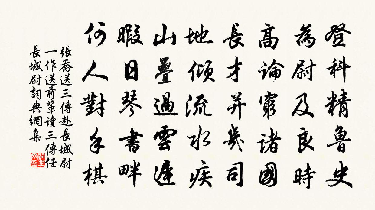 詩詞名句歷史字典書法欣賞書法字典國語詞典說文解字康熙字典古漢語字典標 題 作 者 詩 句 送三傳赴長城尉(一作送前輩讀三傳任長城尉)作者:張喬 朝代:唐代原文登科精魯史,為尉及良時。高論窮諸國,長才並幾司。地傾流水疾,山疊過雲遲。暇日琴書畔,何人對手棋。詩詞問答問:《送三傳赴長城尉(一作送前輩讀三傳任長城尉)》的作者是誰?答:張喬問:該詩寫於哪個朝代?答:唐代書法欣賞送三傳赴長城尉(一作送前輩讀三傳任長城尉)書法作品詩詞推薦御街行(聖壽·二之一·雙調)柳永〔宋代〕燔柴煙斷星河曙。寶輦回天步。端門羽衛簇雕闌,六樂舜韶先舉。鶴書飛下,雞竿高聳,恩霈均寰寓。赤霜袍爛飄食苦筍釋文珦〔宋代〕老去居山樂最真,盤蔬日日富前陳。愛嘗苦筍疏甜筍,似進忠臣遠佞臣。飯為韻清常倍食,酒因味爽或添巡。美芹次韻寄陳主管陳造〔宋代〕軺軿七十曉相追,記得張園敘拜時。香襯蕙蘭來北里,雲隨笙鶴燕仇池。朋簪重蓋寧人力,貧仕居卑聽化兒。只冀張氏曲江高翥〔宋代〕一曲澄江兩派分,滿山修竹綠齊雲。矮窗風月侵帆腹,小徑煙霞隱屐痕。白鷺夜依花影宿,清猿時共艫聲聞。主人題尤使君郡圃十二詩靜鎮堂李庚〔宋代〕海邦本淳古,山民亦顓蒙。汝不探赤丸,我無為缿筩。熙熙樵與牧,藹藹春風中。何必師齊相,虛堂舍蓋公。登烏江泊子岡懷潘景仁賀鑄〔宋代〕驅車柏子岡,引首東南望。孤戍帶寒日,長江流大荒。故人越五嶺,旅雁留三湘。好待春風暖,相隨還北鄉。錢唐吟姚勉〔宋代〕錢唐家家重生女,自小無人識機杼。教成歌舞十二三,花燕身材柳鶯語。去年學得琵琶成,今年學得彈秦箏。豪家【雙調】殿前歡_里西瑛號懶喬吉〔元代〕里西瑛號懶雲窩自敘有作奉和懶雲窩,石床苔翠暖相和。不施霖雨為良佐,遁跡岩阿。林泉夢引台,風月詩分破,同方景嚴謁介庵墓趙蕃〔宋代〕又過餘干縣,來瞻馬鬣墳。侯芭今白首,李漢舊多聞。采若溪頭屋,騎鯨海上雲。生存零落句,三復涕紛紛。酬樂天得微之詩知通州事因成四首元稹〔唐代〕茅檐屋舍竹籬州,虎怕偏蹄蛇兩頭。暗蠱有時迷酒影,浮塵向日似波流。沙含水弩多傷骨,田仰畬刀少用牛。知得合肥懷古三首吳資〔宋代〕合肥一都會,世號征戰地。我來值明時,不識兵革事。婦女之孝二十首辟司徒妻林同〔宋代〕君父今安在,諄諄免矣乎。可憐齊女子,不問辟司徒。冬夜讀書有感陸游〔宋代〕一指頭禪用不窮,一刀匕藥去凌空。汗牛充棟成何事,堪笑迂儒錯用功。搗練子譚處端〔元代〕風人唱,破迷歌。回心與我見彌陀。*哩*,哩**。十搗練,要調和。恩 * 愛是冤魔。*哩*,哩**。憶秦娥曾覿〔宋代〕暗空碧。吳山染就丹青色。丹青色。西風搖落,可堪悽惻。世情冷暖君應識。鬢邊各自侵尋白。侵尋白。江南江北惜春白玉蟾〔宋代〕薄倖東風者,無心半點春。桃花吹滿地,片片似魚鱗。蝶戀花方千里〔宋代〕翠浪藍光新雨後。整整斜斜,高下籠窗牖。萬斛深傾重碧酒。量愁知落何人手。櫳霧梳煙晴色透。照影迴風,一段依韻和沖卿槐花韓維〔宋代〕翠葆連陰直,黃金布蕊齊。流塵一開眼,急節重含淒。蝶冷相攜去,蟬清無數嘶。翻風隨御水,帶雨落秋泥。自喜題靈岩各景漣漪洞元勛〔宋代〕畏心恐靈居,空渺不可際。奇石墜驚雲,涼坐得少憩。何曾落花流,自隔人間世。頌一百則釋重顯〔宋代〕虛堂雨滴聲,作者難酬對。若謂曾入流,依前還不會。會不會,南山北山轉滂霈。名句推薦福在積善,禍在積惡。黃石公《素書·安禮》 天地之道,可一言而盡也。其為物不貳,則其生物不測。子思《中庸·第二十六章》 西風稍急喧窗竹,停又續,膩臉懸雙玉。閻選《河傳·秋雨》 樓倚霜樹外,鏡天無一毫。杜牧《長安秋望》 民之無良,相怨一方,受爵不讓,至於己斯亡。荀子《荀子·儒效》 柳條折盡花飛盡,借問行人歸不歸?佚名《送別詩》 白骨如山忘姓氏,無非公子與紅妝。曹雪芹《紅樓夢·第八回》 溪谷少人民,雪落何霏霏!曹操《苦寒行》 砌下落花風起,羅衣特地春寒。馮延巳《清平樂·雨晴煙晚》 寂寂柴門村落里,也教插柳記年華。趙鼎《寒食》