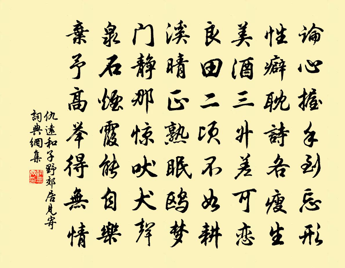 詩詞名句歷史字典書法欣賞書法字典國語詞典說文解字康熙字典古漢語字典標 題 作 者 詩 句 和子野郊居見寄作者:仇遠 朝代:宋代和子野郊居見寄原文論心握手到忘形,性癖耽詩各瘦生。美酒三升差可戀,良田二頃不如耕。溪晴正熟眠鷗夢,門靜那驚吠犬聲。泉石煙霞能自樂,棄予高舉得無情。詩詞問答問:和子野郊居見寄的作者是誰?答:仇遠問:和子野郊居見寄寫於哪個朝代?答:宋代仇遠和子野郊居見寄書法欣賞和子野郊居見寄書法作品詩詞推薦薛九公期請賦山水字詩梅堯臣〔宋代〕薛君堂懸山水字,請我試作山水詩。呼童磨墨慰君意,強作安得有好辭。昔年曾是杜陵客,東城水上橫此碑。字方和謝吏部鐵字韻三十四首自敘三首鄧肅〔宋代〕萬物紛紛一馬耳,百川不同均一水。不將彼是作殊觀,坐使須彌納芥子。李白高視空無人,審言更作牙官嗔。可憐金國賀會應聖節使人到闕集英殿宴致語口號崔敦詩〔宋代〕良月欣臨震夙辰,恩涵雨露燕群臣。遙連漢岳三呼應,徐聽虞韶九奏淳。仙篆縈風浮廣殿,卿雲擎日護嚴宸。奉觴再游蔣山李流謙〔宋代〕江南春晚見芳菲,雪白梨花照客衣。步步求來諸佛記,塵塵全現祖師機。不禁戰作山河老,猶說經綸俎豆非。共飲張伯永折梅走筆謝之趙蕃〔宋代〕歲晚梅花未經眼,自嗟枉作近南官。忽來數朵驚初識,已是先生覓句殘。謝鄭廣文和韻鄭清之〔宋代〕春工漚絲呈巧力,紅日如梭萬花織,愛花盪子不愛命,郊花驪姬似荀息。草木搖落天地閉,賢哉梅也眾不識。靈根詠馬鞭高適〔唐代〕龍竹養根凡幾年,工人截之為長鞭,一節一目皆天然。珠重重,星連連。繞指柔,純金堅。繩不直,規不圓。把向贈張軒民贊善王安石〔宋代〕潮打空城寂寞回,百年多病獨登台。誰人得似張公子,有底忙時不肯來。范真傳侍御累有寄,因奉酬十首鮑溶〔唐代〕昨日新花紅滿眼,今朝美酒綠留人。更宜明月含芳露,憑杖蕭郎夜賞春。白雪翦花朱蠟蒂,折花傳笑惜春人。請君暮春王安石〔宋代〕無限殘紅著地飛,溪頭煙樹翠相圍。楊花獨得東風意,相逐晴空去不歸。焚香晝睡比覺香猶未散戲作陸游〔宋代〕燕梁寂寂篆煙殘,偷得勞生數刻閒。三疊秋屏護琴枕,臥遊忽到瀼西山。庵居釋仲皎〔宋代〕啼切孤猿曉更哀,柴門半掩白雲來。山童問我歸何晚,昨夜梅花一半開。無地卓錐生計難,且空雙手到林間。猥隨次韻漕使張守二首陳造〔宋代〕政績新皇眷,功名舊壯懷。人才雙立玉,筆勢各排淮。鵬路天惟咫,鯫生骨未埋。行看仲淹弼,接武冠堯階。歲晚家居自勉宋祁〔宋代〕朝陽濃澹雪雲垂,湯沐餘閒似標枝。藥有不龜聊擊絮,管無窺豹任□碁。垣陰剝紫迷寒蘚,池溜含光結晚澌。飲取答仲章別後見寄韓維〔宋代〕會合非素期,追歡得同好。旅情忘郁約,春事入吟嘯。子行反崤鞏,我去旁嵩少。悵望洛陽花,金樽不同倒。聽夜泉劉得仁〔唐代〕靜裡層層石,潺湲到鶴林。流回出幾洞,源遠歷千岑。寒助空山月,清兼此夜心。幽人聽達曙,相和蘚床吟。和顏長官百詠空門朱繼芳〔宋代〕白蓮有社一經過,會意由來不在多。滿目廬山青未了,聞鍾歸去意云何。聲聲慢侯善淵〔元代〕賢愚間異,曲直叢林,清濁事急難分。多少無知,開口信意胡葷。*呼為斥*,把靈椿、喚作朝菌。便假饒,是雜詠一百首馬援劉克莊〔宋代〕土室不堪處,其如瘴毒何。莫年款段馬,有愧少游多。滿江紅 為張右丞壽二首魏初〔元代〕梁甫孤吟,已認得、真龍頭角。記當日、江山如畫,一時英略。立馬便談天下事,鳳池十倍揚州鶴。更詩書萬卷豁名句推薦居而安,動而變,可以佐王矣。王通《中說·卷七·述史篇》 春衫著破誰針線,點點行行淚痕滿。黃公紹《青玉案·年年社日停針線》 銅壺漏報天將曉,惆悵佳期又一年。羅隱《七夕》 月兒彎彎照九州,幾家歡樂幾家愁。佚名《月兒彎彎照九州》 生無一日之歡,死有萬世之名。列子及其弟子《列子·楊朱》 滿目山河空念遠,落花風雨更傷春,不如憐取眼前人。晏殊《浣溪沙·一向年光有限身》 雪月最相宜,梅雪都清絕。張孝祥《卜運算元·雪月最相宜》 碧毯線頭抽早稻,青羅裙帶展新蒲。白居易《春題湖上》 九月九日望鄉台,他席他鄉送客杯。王勃《蜀中九日 / 九日登高》 滾滾長江東逝水,浪花淘盡英雄。楊慎《臨江仙·滾滾長江東逝水》