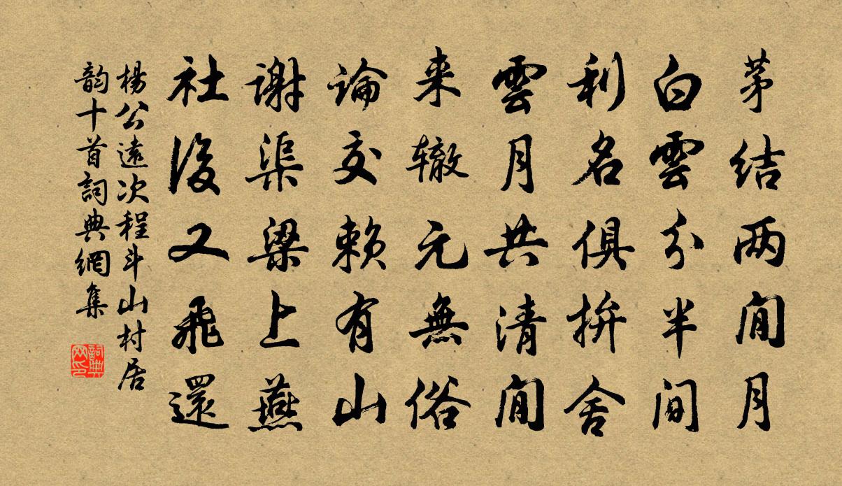 詩詞名句歷史字典書法欣賞書法字典國語詞典說文解字康熙字典古漢語字典標 題 作 者 詩 句 次程斗山村居韻十首作者:楊公遠 朝代:宋代次程斗山村居韻十首原文茅結兩閒月,白雲分半間。利名俱拚舍,雲月共清閒。來轍元無俗,論交賴有山。謝渠樑上燕,社後又飛還。詩詞問答問:次程斗山村居韻十首的作者是誰?答:楊公遠問:次程斗山村居韻十首寫於哪個朝代?答:宋代楊公遠次程斗山村居韻十首書法欣賞次程斗山村居韻十首書法作品詩詞推薦青玉案元好問〔金代〕熙春台下花無數。紅紫映桃溪路。蝶往蜂來知幾許。翠筠亭外,綠楊堤畔,時聽嬌鶯語。綺筵羅列開尊俎。總是神題傳記范成大〔宋代〕莫將彩筆寄朝雲,紅淚羅巾隔路塵。說與東風無限恨,倩風吹斷去年春。山中吟釋文珦〔宋代〕偶為山中游,遂作山中住。猿鶴盡相忘,不記山前路。架有古仙書,立言談信去。往往賾其玄,頗有會心處。乃知次敬叔韻二首裘萬頃〔宋代〕玉鑒冰壺一段清,鐵中誰與斗錚錚。眼看萬里雲霄路,不信驊騮地上行。雪中雪坡十憶姚勉〔宋代〕冰襟玉袖幾交遊,儘自風流勝子猷。有興可乘應不盡,定無門外便回舟。清心鏡 贈荔菲大隱馬鈺〔元代〕修行人,休失錯。仔細尋思,外樂不如內樂。常清淨、自有清歡,本來真踴躍。無憂愁,無染著。自在逍遙,氣神次韻知郡賈蕃大夫思歸蘇轍〔宋代〕江城漂泊最多時,邂逅誰令長者期。得坎浮槎應有命,投林驚鵲且安枝。何年笑語還留客,終日勤勞數問兒。鈴閣明月陳杰〔宋代〕載脂我車,載秣我馬。煌煌於徵,明月在下。自貽吟邵雍〔宋代〕六十有七歲,生為世上人。四方中正地,萬物備全身。天外更無樂,胸中別有春。念奴嬌(次韻張仲遠,是日醉甚,逃席)張綱〔宋代〕論思厭久,動蓴鱸清興,輕辭丹極。佩玉腰金歸故里,光照湖山秋色。八座儀刑,九重尊寵,才大今詞伯。漢家豪春雨白玉蟾〔宋代〕柳色煙光正斗青,桃花落盡杏花驚。風從窗眼空中入,雨在檐前滴到明。答方俊甫投贈二首劉克莊〔宋代〕抽還手板把隨如,甘向三家村卜居。晚有絕詩題白下,早為選禮倡黃初。難從楊子通奇字,卻羨祁公學草書。國語和王衢見寄魏野〔宋代〕久向東郊住,漸同麋鹿情。游山岐路熟,見客禮儀生。藜杖新仍重,荷衣破轉輕。身猶為外物,詩亦是虛名。自愛春日戴復古〔宋代〕淫滯江湖久,蹉跎歲月新。客愁茅店雨,詩思柳橋春。秣馬尋歸路,騎鯨問故人。山林與朝市,何處著吾身。蝶戀花張掄〔宋代〕碧海靈桃花朵朵。阿母□□,□□□□□。作夜海風吹玉顆。分明□□□□□。□□□□苞已破。散液流□,馥郁句楊炎正〔宋代〕扶筇向水村。春暮思平泉雜詠二十首潭上紫藤李德裕〔唐代〕故鄉春欲盡,一歲芳難再。岩樹已青蔥,吾廬日堪愛。幽溪人未去,芳草行應礙。遙憶紫藤垂,繁英照潭黛。參政瞿公之孫東廣機宜德遠惠收若詩以能問於曾豐〔宋代〕高廟中興初十年,大參內制余百篇。心聲之發動夷夏,手澤所存傳子孫。得其傳者孫之嫡,參自道根至枝葉。一元送鄭少府入遼,共賦俠客遠從戎駱賓王〔唐代〕邊烽警榆塞,俠客度桑乾。柳葉開銀鏑,桃花照玉鞍。滿月臨弓影,連星入劍端。不學燕丹客,空歌易水寒。寄華春娘徐君亮〔宋代〕自從瞥見如花面,曉夜相思腸欲斷。分明咫尺遠如天,何似同心作方便。名句推薦池上柳依依,柳邊人掩扉。左緯《春晚》 憶年十五心尚孩,健如黃犢走復來。杜甫《百憂集行》 愛人利人者,天必福之;惡人賊人者,天必禍之。墨子《墨子·04章 法儀》 金風細細。葉葉梧桐墜。晏殊《清平樂·金風細細》 惆悵東欄一株雪,人生看得幾清明。蘇軾《東欄梨花》 深山畢竟藏猛虎,大海終須納細流。佚名《增廣賢文·上集》 中州遺恨,不知今夜幾人愁。辛棄疾《水調歌頭·和馬叔度游月波樓》 今年游寓獨游秦,愁思看春不當春。杜審言《春日京中有懷》 客行野田間,比屋皆閉戶。姚合《莊居野行》 不可以一時之得意,而自誇其能;亦不可以一時之失意,而自墜其志。馮夢龍《警世通言·卷十七》