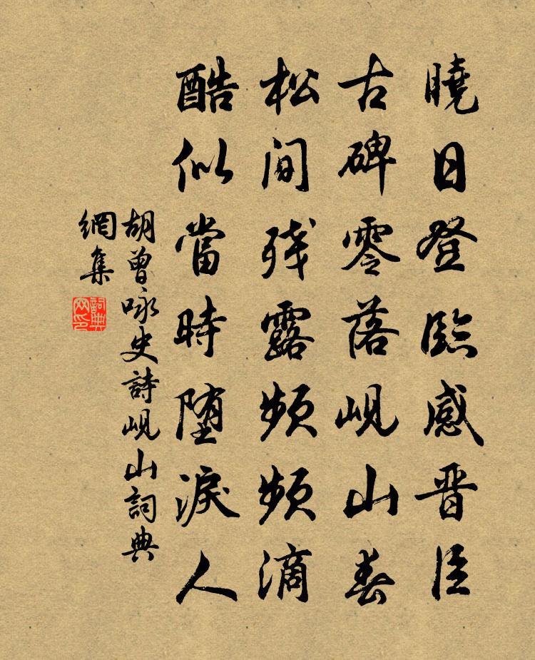 詩詞名句歷史字典書法欣賞書法字典國語詞典說文解字康熙字典古漢語字典標 題 作 者 詩 句 詠史詩峴山作者:胡曾 朝代:唐代詠史詩峴山原文曉日登臨感晉臣,古碑零落峴山春。松間殘露頻頻滴,酷似當時墮淚人。詩詞問答問:詠史詩峴山的作者是誰?答:胡曾問:詠史詩峴山寫於哪個朝代?答:唐代問:詠史詩峴山是什麼體裁?答:七絕胡曾詠史詩峴山書法欣賞詠史詩峴山書法作品注釋全唐詩:卷647-94詩詞推薦羅子琳來就廣漕試予以檄出至西江峽口懷古感曾豐〔宋代〕摹寫閒泉石,雕鎪病肺肝。得無縻歲月,終不補饑寒。上固詔求上,誰將詩得官。何如經學熟,隨計上長安。西江月張孝祥〔宋代〕冉冉寒生碧樹,盈盈露濕黃花。故人玉節有光華。高會仍逢戲馬。萬事只今如夢,此身到處為家。與君相逢更天涯上張水部朱慶餘〔唐代〕出入門闌久,兒童亦有情。不忘將姓字,常說向公卿。每許連床坐,仍容並馬行。恩深轉無語,懷抱甚分明。頌石頭和尚草庵歌釋印肅〔宋代〕不居南北與東西,萬法無生何所疑。岩樹庭莎標妙相,猿啼鵲噪應真機。梅鄭剛中〔宋代〕斷橋斜路水聲平,茅舍疏籬月色新。千里故人如念我,不妨早寄一杖春。賦西淙瀑布得斷字劉克莊〔宋代〕蒼山七百畝,主人新買斷。於時積霧開,素瀑掛青漢。泠泠瑟初鏗,璀璀珠乍貫。久晴雨瓢翻,忽暖冰柱泮。恍如西江月(次韻林茂南博士杞泛溪)葛勝仲〔宋代〕山外半規殘日,雲邊一縷餘霞。滿城飛雪散苕花。萬頃溪連罨畫。柳惲風流舊國,鶴齡瀟灑人家。肯嗟流落在天涯遍地錦佚名〔宋代〕萊州武觀是吾鄉。因遇先生號長生。穿街柳巷也無妨。不染塵埃性月更漏子趙崇嶓〔宋代〕玉搔頭,金約臂。嬌重不勝殘醉。留粉黛,暈胭脂。淺寒生玉肌。待歸來,渾未準。疑殺那回書信。春又好,思無滕達道輓詞秦觀〔宋代〕江南江北奉周旋,合散如雲二十年。春邵勝游花散馬,夜山清話雨連天。共驚萬里長城壞,獨把千金寶劍懸。平日古興常建〔唐代〕漢上逢老翁,江口為殭屍。白髮沾黃泥,遺骸集烏鴟。機巧自此忘,精魄今何之。風吹釣竿折,魚躍安能施。白水月台夜坐二首楊萬里〔宋代〕日落片時許,星才數點明。須臾玉棋子,遍滿碧瑤枰。向晚垂垂雨,通霄得得晴。秋蛩伴儂語,苦底是誰聲。題鳴山祠韓彥古〔宋代〕自系牛昌隱,威風震海寰。待吾謀用日,同共掃完顏。姑熟雜詠丹陽湖李赤〔唐代〕湖與元氣通,風波浩難止。天外賈客歸,雲間片帆起。龜游蓮葉上,鳥宿蘆花里。少女棹舟歸,歌聲逐流水。次韻陳鈞甫郊行鄧林〔宋代〕黃塵敗素意,出門愜郊行。野鞠含冷焰,岩鬆起寒聲。高山唐業崇,流水晉時清。拾薪歸底用,石鼎待彌明。十月菊張鎡〔宋代〕幽芳何事獨開遲,寂寞寒金照短籬。老子樽罍方欠此,春風景物最相宜。要隨得暖南枝發,肯趁登高九日悲。翻笑寒食夜偶題宋祁〔宋代〕前塵露氣壓輕埃,風漾花陰聚復開。苦恨浮雲心不淨,月中時汙太清來。雜興顧逢〔宋代〕異鄉飄泊暫歸來,獨上蕪城望一回。三十年前人已往,樓台不是舊樓台。次韻李判官見贈李石〔宋代〕須髯殘雪兀陳編,煬者何由更避煙。榮宦君方收晚歲,論交我亦得忘年。佐州相與營杯水,有路從今出瓮天。一日贈劉賢良陳元晉〔宋代〕十二書言天下事,氣如賁直語加遒。誰當心恥四郊壘,子獨眉攢國愁美。刺手拔鯨何倜儻,劇談捫虱自風流。悠然名句推薦嗚呼!楚雖三戶能亡秦,豈有堂堂中國空無人陸游《金錯刀行》 鍥而舍之,朽木不折;鍥而不捨,金石可鏤。荀子《荀子·勸學》 虎踞龍蟠何處是,只有興亡滿目。辛棄疾《念奴嬌·登建康賞心亭呈史致道留守》 樹陰滿地日當午,夢覺流鶯時一聲。蘇舜欽《夏意》 青林翠竹,四時俱備。陶弘景《答謝中書書》 秦中已久烏頭白,卻是君王未備知。李商隱《人慾》 過而能改者,民之上也。左丘明《國語·魯語·季文子論妾馬》 高山安可仰,徒此揖清芬李白《贈孟浩然》 重唱梅邊新度曲,催發寒梢凍蕊。吳文英《金縷歌·陪履齋先生滄浪看梅》 方慚不耕者,祿食出閭里。韋應物《觀田家》