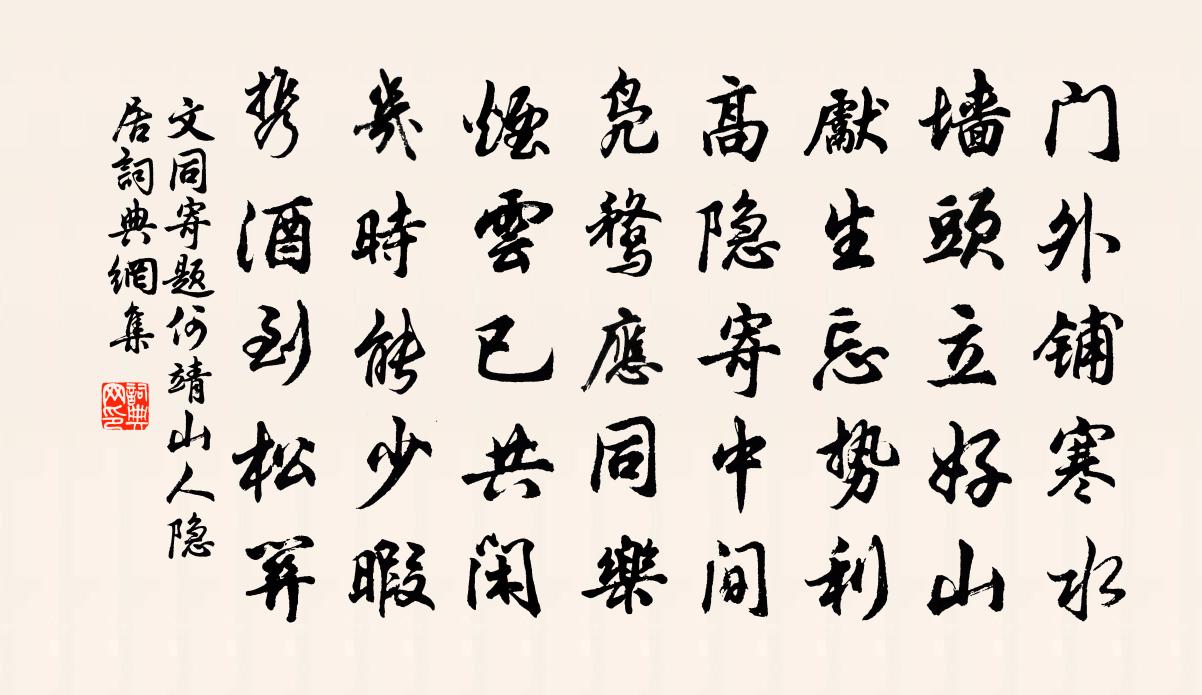 詩詞名句歷史字典書法欣賞書法字典國語詞典說文解字康熙字典古漢語字典標 題 作 者 詩 句 寄題何靖山人隱居作者:文同 朝代:宋代寄題何靖山人隱居原文門外鋪寒水,牆頭立好山。先生忘勢利,高隱寄中間。鳧鶩應同樂,煙雲已共閒。幾時能少暇,攜酒到松關。詩詞問答問:寄題何靖山人隱居的作者是誰?答:文同問:寄題何靖山人隱居寫於哪個朝代?答:宋代文同寄題何靖山人隱居書法欣賞寄題何靖山人隱居書法作品詩詞推薦五更仇遠〔宋代〕醜夜方向寅,被衾冷如鐵。江南貧者多,奈此霜加雪。寄公擇兼問訊季益二首趙蕃〔宋代〕近與李商叟,共談韓季蕭。舊氈余翰墨,幽寺樂簞瓢。問友多冥漠,須君慰寂寥。雲胡又相失,於此亦何聊。贈周季隱項安世〔宋代〕鐵面蒼髯士,金魚玉帶家。園林閒富貴,花竹老生涯。世上名何用,尊中酒幸嘉。向來張長史,佳句足堪夸。禽言四首黎廷瑞〔宋代〕麥飯熟快活,半年忍飢待此麥,問汝快活能幾時。更有五月六月飢亦所不辭,且願休王師。和周南吉二絕王炎〔宋代〕舊遊追記岳陽城,莫惜經過憩旆旌。容易別離難會合,為君重酌聖人清。送封太守王維〔唐代〕忽解羊頭削,聊馳熊首轓。揚舲發夏口,按節向吳門。帆映丹陽郭,楓攢赤岸村。百城多候吏,露冕一何尊。秋夜對月錢惟演〔宋代〕顥氣中秋正,明河左界長。桂孤香易散,蚌冷淚先汪。飛蓋傾蘭坂,鳴琴厭燭房。玉盤浮浩露,素綆冰寒漿。浪白鷓鴣天辛棄疾〔宋代〕一片歸心擬亂雲。春來諳盡惡黃昏。不堪向晚檐前雨,又待今宵滴夢魂。爐燼冷,鼎香氛。酒寒誰遣為重溫。何人暮冬送何秀才毗陵伍喬〔唐代〕匹馬嘶風去思長,素琴孤劍稱戎裝。路塗多是過殘歲,杯酒無辭到醉鄉。雲傍水村凝冷片,雪連山驛積寒光。毗陵送歐陽平仲起胡林教官樂雷發〔宋代〕快把詩書洗瘴茅,雕題墨齒盡同胞。天涯那得隨衿佩,試借升堂講義鈔。望淮山硤石寺予幼年過此今十載矣張耒〔宋代〕十年落泊竟何成,人事紛紛幾廢興。今日扁舟淮上去,青山似與客相迎。寒食寓懷梁顥〔宋代〕明日一百五,春風余幾何。愁隨新火出,病憶故人多。草色牆陰合。花香宿雨和。耿懷殊不寐,終夕扣壺歌。送王以通之官金陵釋永頤〔宋代〕芳辰早失意兼衰,不擬君來重舉杯。雲暗月牆花氣重,蠟殘風幕鳥聲催。醉鄉人有江東役,乘船從闕下回。明日沙送李侍御入蕃朱慶餘〔唐代〕遠使隨雙節,新官屬外台。戎裝非好武,書記本多才。移帳依泉宿,迎人帶雪來。心知玉關道,稀見一花開。海丁謂〔宋代〕積潤容零露,無涯任酌蠡。浮空長浴日,表聖不揚波。江漢源流眾,蕃夷島嶼多。客槎如可泛,咫尺是星河。憶業師劉夫子趙必蒸〔宋代〕嚴風砭肌骨,{左木右術}然起遐思。哲人已久萎,誰可作聖儀。吾虞劉夫子,日維百世師。秉直疾邪佞,是非無夜遊宮·春語鶯迷翠柳吳文英〔宋代〕春語鶯迷翠柳,煙隔斷、晴波遠岫。寒壓重簾幔拖繡。袖爐香,倩東風,與吹透。花訊催時候。舊相思、偏供閒晝偈頌六十七首釋原妙〔宋代〕大海無魚,大地無草。大富無糧,大悟無道。比日宋祁〔宋代〕比日投簪隱,盂峰列舍椽。值岩因作牖,仍磵即疏泉。斧爛仙棋路,花飛佛雨天。諫帷他夜夢,猶在翠微巔。江行望秣陵作陳維崧〔清代〕輕舟夜剪秋江,西風鱗甲生江面。瓦官閣下,方山亭外,驚濤雪片。一帶蔣州,千尋鐵鎖,等閒燒斷。只波間皓月名句推薦一別都門三改火,天涯踏盡紅塵。蘇軾《臨江仙·送錢穆父》 存亡在虛實,不在於眾寡。韓非及後人《韓非子·安危》 相思一夜窗前夢,奈個人、水隔天遮。王沂孫《高陽台·和周草窗寄越中諸友韻》 紙灰飛作白蝴蝶,淚血染成紅杜鵑。高翥《清明日對酒》 三杯吐然諾,五嶽倒為輕。李白《俠客行》 今人嗤點流傳賦,不覺前賢畏後生。杜甫《戲為六絕句》 別離還有經年客,悵望不如河鼓星。徐凝《七夕》 雲想衣裳花想容,春風拂檻露華濃李白《清平調·其一》 清明過了,不堪回首,雲鎖朱樓。朱淑真《眼兒媚·風日遲遲弄輕柔》 不知何日始工愁。記取那回花下一低頭。王國維《虞美人·弄梅騎竹嬉遊日》