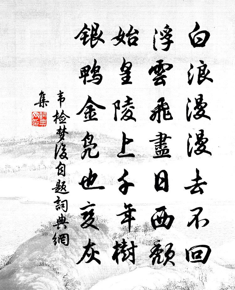 詩詞名句歷史字典書法欣賞書法字典國語詞典說文解字康熙字典古漢語字典標 題 作 者 詩 句 夢後自題作者:韋檢 朝代:唐代夢後自題原文白浪漫漫去不回,浮雲飛盡日西頹。始皇陵上千年樹,銀鴨金鳧也變灰。詩詞問答問:夢後自題的作者是誰?答:韋檢問:夢後自題寫於哪個朝代?答:唐代問:夢後自題是什麼體裁?答:七絕韋檢夢後自題書法欣賞夢後自題書法作品注釋全唐詩:卷866-51詩詞推薦伍員吳偉業〔清代〕投金瀨畔敢安居?覆楚亡吳數上書。手把蜀鏤思往事,九原歸去愧包胥。呼雞林之奇〔宋代〕雞呼雞來前,犬嗾犬至止。夫豈必可召,役以食乃爾。今吾曷為悲,人而雞犬為。自計無自存,西山謝夷齊。漢南使君數以公醪見問宋祁〔宋代〕江上春陰柳萬條,離人無處不無憀。阮生塊壘胸中極,故待兵廚著酒澆。杜山自遣戴復古〔宋代〕世事茫茫心事灰,眾人爭處我驚回。閉門不管花開落,避俗唯通燕往來。富貴在天求不得,光陰轉地老相催。平生和唐壽隆上元五首胡寅〔宋代〕名章絡繹走陪台,得對春風一笑開。樓外未知明月出,袖中疑有夜光來。秀如王子登門竹,味勝曹公止渴梅。已向句嚴陵士人〔宋代〕大柄如歸手,蚊虻莫浪飛。逍遙吟邵雍〔宋代〕吾道本來平,人多不肯行。得心無後味,失腳有深坑。若未通天地,焉能為死生。向其間一事,須是自誠明。偈頌一百六十首釋宗杲〔宋代〕一不成只,兩不成雙。劍號巨闕,珠稱夜光。送谷準羊肩賀伯溫陳藻〔宋代〕曲江宴罷注官旋,親舊肥家有酒舡。我老學農雖未遂。谷分一石準羊肩。泛湖釋紹嵩〔宋代〕六月西湖錦繡鄉,新詩滿眼費平章。移舟水濺差差綠,吹面輕風與送香。和門下侍郎東台夜直見寄蘇頌〔宋代〕五年班綴望夔龍,曾托帡幪庇雨風。末路自矜黃髮老,平時曾識黑頭公。升沈不改交情見,出處雖殊趣舍同。謾叩送人之官池州樓鑰〔宋代〕春空吹雨作余寒,去去扁舟不可扳。伊昔曾游三大水,到今獨記九華山。想君脈脈征途遠,屬我悠悠夢境閒。回首與慶伯廣聲別後有懷趙蕃〔宋代〕萬壑分爭洶洶來,扁舟寸上亦難哉。晚晴只有山堪看,望極還憂遠思哀。儀真雍生見和因再用韻兼懷儀真劉宰〔宋代〕外客憐之子,寒窗幾晦明。羈禽戀鄉國,來雁尚邊聲。事去雲成狗,時來草化螢。未須論得失,把酒謾忘情。病酒述懷陸游〔宋代〕閒處天教著放翁,草廬高臥筰橋東。數莖白髮悲秋後,一醆青燈病酒中。李廣射歸關月墮,劉琨嘯罷塞雲空。古人奉和滁州九詠九首歸雲洞曾鞏〔宋代〕野草山花夾亂流,橋邊旌旆影悠悠。即應要地無人見,可忍開時不出遊。石門小泊張鎡〔宋代〕近村非少茂林枝,十二烏巢一樹棲。應恐此間難覓句,預先留作我詩題。同諸友山行分袂言別五首程公許〔宋代〕羅家隔香積,天國近花坪。何日同搜覽,題詩索載賡。蓮浦謠溫庭筠〔唐代〕鳴橈軋軋溪溶溶,廢綠平煙吳苑東。水清蓮媚兩相向,鏡里見愁愁更紅。白馬金鞭大堤上,西江日夕多風浪。荷心遠山平野釋行海〔宋代〕雲山影影接暗沙,頻見回鵰打暮鴉。曾是吳王弦管地,春風吹草不吹花名句推薦一朵芙蕖,開過尚盈盈。蘇軾《江神子·江景》 林臥愁春盡,開軒覽物華。孟浩然《清明日宴梅道士房 / 宴梅道士山房》 去年東武今夕,明月不勝愁。蘇轍《水調歌頭·徐州中秋》 漢家天子今神武,不肯和親歸去來。王之渙《涼州詞二首》 賈傳自憐多感慨,東門何意泥孤虛。王惲《送姬仲實隱士北還》 薊庭蕭瑟故人稀,何處登高且送歸。王之渙《九日送別》 流芳未及歇,遺掛猶在壁。潘安《悼亡詩三首》 黃雲連白草,萬里有無間。王鎡《塞上曲》 我軍青坂在東門,天寒飲馬太白窟。杜甫《悲青坂》 有理而無益於治者,君子弗言;有能而無益於事者,君子弗為。尹文《尹文子·大道上》
