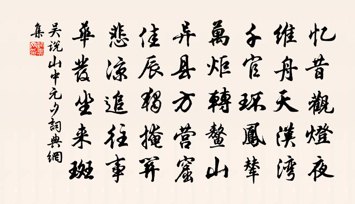詩詞名句歷史字典書法欣賞書法字典國語詞典說文解字康熙字典古漢語字典標 題 作 者 詩 句 山中元夕作者:吳說 朝代:宋代山中元夕原文憶昔觀燈夜,維舟天漢灣。千官環鳳輦,萬炬轉鰲山。異縣方營窟,佳辰獨掩關。悲涼追往事,華發坐來斑。詩詞問答問:山中元夕的作者是誰?答:吳說問:山中元夕寫於哪個朝代?答:宋代吳說山中元夕書法欣賞山中元夕書法作品詩詞推薦句陶弼〔宋代〕簫鼓不分憂樂事,衣冠難辨吉凶人。挽去華主簿侄二首劉克莊〔宋代〕子美尤稱位,昌黎若惜滂。色空融佛性,冰炭置吾腸。未審生何國,猶疑在我傍。一條勝謝傅,老不廢期喪。送強甫赴惠安六言十首劉克莊〔宋代〕巽以行權亦可,方於事上未然。或迎使者負弩,或為刺史挽船。陳文懿公輓詞樓鑰〔宋代〕珍館徑歸鄞,人猶望秉鈞。郵傳千里訃,哀動五州民。躃踴森賢嗣,攀號感路人。公乎不忘矣,袞袞看簪紳。即事陸游〔宋代〕禿尾驢嘶小市門,側蓬帆過古城村。此生感慨知何限?斗酒新豐不足論。城北青蓮院方丈壁間有畫燕子者過客多題詩予陸游〔宋代〕一雙掠水燕來初,萬點飛花社雨余。辛苦成巢君勿笑,從來吾亦愛吾廬。游霍童陳嘉官〔宋代〕藤上老猿欲墮,松間野鹿相隨。苔蘚綠埋丹灶,桃花紅染金錘。延平粹廳十詠擁雲陳宓〔宋代〕寂寂萬山底,晴嵐晏猶氛。馳心惟魏闕,玉帝捧黃雲。夢得墨四片一差短戲呈廷玉仇遠〔宋代〕昔賢曾夢筆,夢墨定何如。應使山中隱,重研世上書。磨人驚老大,飲汁笑空疏。長短無庸較,三螺已有餘。游韶州廣界寺宋之問〔唐代〕影殿臨丹壑,香台隱翠霞。巢飛銜象鳥,砌蹋雨空花。寶鐸搖初霽,金池映晚沙。莫愁歸路遠,門外有三車。婦嘲李新〔宋代〕歲晚隨君色色無,嫁時我自有瓊琚。借令值客休捫虱,幸未詩勿中專驢。寧與漁樵安舊隱,莫言封禪著新書。夜寒唐律寄呈父鳳山提舉十首汪元量〔宋代〕黃帽催人急放舟,荻花楓葉共颼颼。天公作惡雲翻手,河伯為妖風打頭。接翅野鴉圍古堞,斷行孤雁落中州。吳山和淵明祠釋道璨〔宋代〕一寸歸心酒得知,門前官道是危機。道傍也有人歸去,不似先生真箇歸。和人游白雲莊二首之一賀鑄〔宋代〕原野正春風,登臨一醉同。陰晴時未定,今古思何窮。山勢落還起,溪流噎復通。隱君方自得,可羨爾冥鴻。郊廟歌辭。梁郊祀樂章。慶熙張袞〔唐代〕哲後躬享,旨酒斯陳。王恭無斁,嚴祀惟寅。皇祖以配,大孝以振。宜錫景福,永休下民。望龍山懷道士許法棱劉長卿〔唐代〕心惆悵,望龍山。雲之際,鳥獨還。懸崖絕壁幾千丈,綠蘿裊裊不可攀。龍山高,誰能踐。靈原中,蒼翠晚。嵐煙還何學士詩集魏野〔宋代〕魏野非商也,微言豈易窮。看雖許朋友,寫不倚兒童。合在龍圖上,難留蝸舍中。因思投納處,還浦與珠同。四塊玉馬致遠〔元代〕酒旋沽,魚新買,滿眼雲山畫圖開。清風明月還詩債。本是個懶散人,又無甚經濟才,歸去來。漁家傲 訪華雪嚴不遇許有壬〔元代〕水落寒林山骨瘦。湘江風細波紋皺。何處攜琴何處酒。惆悵久。亂鴉啼斷煙中柳。茅屋蕭蕭連瓮牖。半檐寒旭閒清次韻師厚病間十首黃庭堅〔宋代〕貝錦不足歌,請陳江漢詩。美人出江漢,窈窕世未窺。折蘭不肯佩,告我以蠶飢。獨歸豈憚遠,三危露如飴。名句推薦涉江采芙蓉,蘭澤多芳草。佚名《涉江采芙蓉》 人之過誤宜恕,而在己則不可恕洪應明《菜根譚·概論》 天入平湖晴不風,夕帆和雁正浮空。陳與義《登岳陽樓》 只有精忠能報國,更無樂土可為家。 * 《元旦口占用柳亞子懷人韻》 明朝且做莫思量,如何過得今宵去。周紫芝《踏莎行·情似遊絲》 發言玄遠,口不臧否人物。房玄齡《晉書·列傳·第十九章》 俯飲一杯酒,仰聆金玉章。韋應物《郡齋雨中與諸文士燕集》 死生驚懼不入乎其胸,是故忤物而不懾。列子及其弟子《列子·黃帝》 長江一帆遠,落日五湖春。劉長卿《餞別王十一南遊》 回鞭指長安,西日落秦關。李白《登敬亭北二小山余時送客逢崔侍御並登此地》