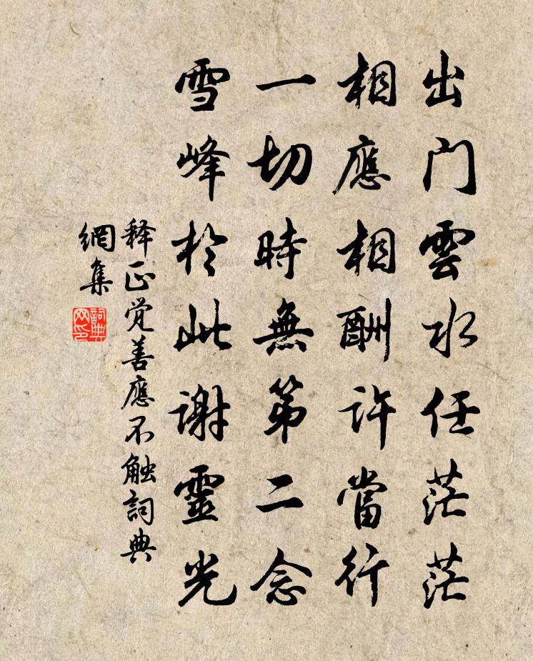 詩詞名句歷史字典書法欣賞書法字典國語詞典說文解字康熙字典古漢語字典標 題 作 者 詩 句 善應不觸作者:釋正覺 朝代:宋代善應不觸原文出門雲水任茫茫,相應相酬許當行。一切時無第二念,雪峰於此謝靈光。詩詞問答問:善應不觸的作者是誰?答:釋正覺問:善應不觸寫於哪個朝代?答:宋代釋正覺善應不觸書法欣賞善應不觸書法作品詩詞推薦謁江華曾百里劉過〔宋代〕鬢髮已皤非故吾,依然破帽老騎驢。江邊遊了斷腸句,漢殿逐臣流涕書。父祖松楸三世冢,弟兄桑梓百年居。狐丘重過鴻儀寺晃沖之〔宋代〕秋色遽如許,寒林奈若何。客行傷老大,野次記經過。廢圃猶殘菊。枯池但折荷。吾生與物態,天意豈蹉跎。句李兌〔宋代〕高鳥翔雲外。和南劍水閣趙希逢〔宋代〕莫把鉛刀比莫邪,匣藏文采鎖煙霞。可憐建水蹤猶梗,因憶洛陽酒與花。寸念空勞馳北聞,真經早合誦南華。幾回丈亭登舟有感釋紹嵩〔宋代〕未厭長為客,孤舟趁夜行。不唯山水樂,頗覺夢魂清。風緩帆舒捲,雲行月送迎。勞生誰獨免,空復嘆勞生。即事陶夢桂〔宋代〕桂花香處麝臍破,楓葉丹時錦帳開。天遣年華隨水去,山將野色入簾來。鑷殘白髮愁無跡,割盡黃雲酒有材。不歲熊主簿示梅花十絕詩至梅花已過因觀海棠輒次劉克莊〔宋代〕暮雨廉纖似入梅,一春花月欠攀陪。草生後圃深三尺,也道身為縣令來。賀蛟峰先生得孫方逢振〔宋代〕翁年六十九,大郎才得孫。五行不孤亢,停當乾與坤。於焉觀於穆,孝悌天已根。賢愚一任汝,鞠育推予恩。我觀賦里人亭前三立石周南〔宋代〕昔人藏巧拙,收拾收亭雲。雨溜漫天鑿,年侵見石心。支撐非爾力,秉執儼如臨。亦有渾渾氣,唯嗟骨未任。慶侍郎趙孟僖〔宋代〕不戀持荷侍玉皇,再從均燕似山堂。世間何物侔清節,照水梅花傲雪霜。風嘆呂溫〔唐代〕青海風,飛沙射面隨驚蓬。洞庭風,危牆欲折身若空。西馳南走有何事,會須一決百年中。婦女之孝二十首鄭義宗妻林同〔宋代〕抵死侍姑側,寧知有妾身。若懷 * 顧,尚得謂之人。題三生圖曾豐〔宋代〕閒去閒來自在嬉,故人不記問於誰。都來一個真訊息,安用頻更為漏為。朱槿花李紳〔唐代〕瘴煙長暖無霜雪,槿艷繁花滿樹紅。每嘆芳菲四時厭,不知開落有春風。下途歸石門舊居李白〔唐代〕吳山高,越水清,握手無言傷別情。將欲辭君掛帆去,離魂不散煙郊樹。此心郁悵誰能論,有愧叨承國士恩。雲物踏莎行譚處端〔元代〕屢勸聰明,聰明不悟。尋常相付留詞句。詞中唯是勸回修,何曾詞里依他做。早悟輪迴,速尋出路。二輪催促朝還路傍草於鄴〔唐代〕春至始青青,香車碾已平。不知山下處,來向路傍生。每歲有人在,何時無馬行。應隨塵與土,吹滿洛陽城。斜谷郵亭玩海棠花顧非熊〔唐代〕忽識海棠花,令人只嘆嗟。艷繁惟共笑,香近試堪夸。駐騎忘山險,持杯任日斜。何川是多處,應繞羽人家。謁金門程垓〔宋代〕風陣陣。吹落楊花無定。酒病厭厭三月盡。花檀紅自隱。新綠軒窗清潤。月影又移牆影。手拈青梅無處問。一春長春詞二首張嵲〔宋代〕莽莽暄風吹九州,春來何處不消憂。林間鳥語隨時好,花里風光映日流。名句推薦經一失長一智馮夢龍《警世通言·卷三》 十五彩衣年,承歡慈母前。孟浩然《送張參明經舉兼向涇州覲省》 七夕今宵看碧霄,牽牛織女渡河橋。林傑《乞巧》 探其懷,奪之威。主上用之,若電若雷。韓非及後人《韓非子·揚權》 棠梨花映白楊樹,儘是死生別離處。白居易《寒食野望吟》 猶有遺簪,不展秋心,能卷幾多炎熱。張炎《疏影·詠荷葉》 爽口物多終作疾,快心事過必為殃。馮夢龍《喻世明言·卷三》 年年送客橫塘路,細雨垂楊系畫船。范成大《橫塘·南浦春來綠一川》 但見淚痕濕,不知心恨誰。李白《怨情》 屋漏在上,知者在下。王充《論衡·卷十一·答佞篇》