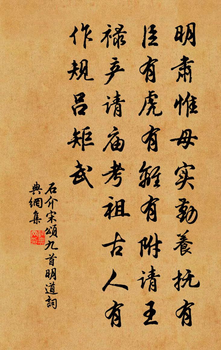 詩詞名句歷史字典書法欣賞書法字典國語詞典說文解字康熙字典古漢語字典標 題 作 者 詩 句 宋頌九首明道作者:石介 朝代:宋代宋頌九首明道原文明肅惟母,實勤養撫。有臣有虎,有離有附。請王祿產,請廟考祖。古人有作,規呂矩武。詩詞問答問:宋頌九首明道的作者是誰?答:石介問:宋頌九首明道寫於哪個朝代?答:宋代石介宋頌九首明道書法欣賞宋頌九首明道書法作品詩詞推薦示化士釋慧遠〔宋代〕身如椰子膽如天,喝道來參栗棘禪。按下雲頭輕領過,口皮元只在唇邊。禪人並化主寫真求贊釋正覺〔宋代〕顛發山雪,眶瞳水秋。月白濯河漢,霽寒摩鬥牛。韶意千華里,光風百草頭。如幻三昧兮,妙得優遊。偈八首釋明辯〔宋代〕黃龍頭角從來異,不與今時歲月爭。復妙回途何處去,月明終夜照虛堂。送僧方及南謁柳員外劉禹錫〔唐代〕昔事廬山遠,精舍虎溪東。朝陽照瀑水,樓閣虹霓中。騁望羨游雲,振衣若秋蓬。舊房閉松月,遠思吟江風。古寺題蘇虞叟岩壑隱居陸游〔宋代〕蘇子飄然古勝流,平生高興在滄州。千岩萬壑舊卜築,一馬二僮時出遊。香斷鍾殘僧閣晚,鯨吞鼉作海山秋。極知秋日程伯玉攜詩見過次韻孫應時〔宋代〕秋聲入梧桐,落葉驚瓮牖。菊叢生細香,安排作重九。幽子曳杖吟,蓬門獨搔首。故人惠然來,新詩出瓊玖。歡言滿庭芳馬鈺〔元代〕家緣猛棄,更不疑惑。辨認陰魂陽魄。咄出屍蟲,屏盡氣財酒色。好事先人後己,做憨憨、有似彌勒。修大道,處哭蘇眉州崔司業二公沈佺期〔唐代〕渙汗天中發,伶俜海外旋。長沙遇太守,問舊幾人全。國寶亡雙傑,天才喪兩賢。大名齊弱歲,高德並中年。禮樂垂虹亭李洪〔宋代〕十年滄海慣騎{左馬右京},秋入垂虹豁眼明。雲氣蓬萊底難到,洞天林屋沒多程。漁歌三唱客愁破,雁字一行秋小重山·碧幕霞綃一縷紅陳亮〔宋代〕碧幕霞綃一縷紅。槐枝啼宿鳥,冷煙濃。小樓愁倚畫闌東。黃昏月,一笛碧雲風。往事已成空。夢魂飛不到,楚王次韻孫推官朴見寄二首蘇轍〔宋代〕蒙慍未能憂悄悄,得閒時復醉昏昏。知君亦學無言語,豈悟維摩不二門。病懶近來全廢學,宦遊唯是苦思鄉。粗知頌古三十九首釋道樞〔宋代〕大地是個解脫門,三世諸佛一口吞。將為雪峰有奇特,卻來謾我好兒孫。奉同原甫鄆州樂郊韓維〔宋代〕詩人歌樂郊,以政不以游。太守名是地,豈非為民謀。下車布條教,惠愛春風柔。丹筆平枉訟,赭衣息奸偷。政和盧奉御自上都回見訪汪元量〔宋代〕詩人騎馬接官回,解後居庸懷抱開。冷地不禁風聒聒,炎天長見雪堆堆。昨宵我夢中南去,今日君從直北來。說盡挽高孺人劉克莊〔宋代〕泝源高適譜,作媲鄭虔家。賢子搴丹桂,高才補白華。病猶觀冕輅,沒不待笄珈。阡表堪傳遠,何須挽誄加。五月二十四日宿永睦將口香積院僧軒東望甚遠張嵲〔宋代〕峰巒綿亘幾千里,半霽半陰輕靄中。僧房借榻睡初足,滿谷笙篁松檜風。句宋祁〔宋代〕雲路舊扶黃道日,霞觴新映六符天。句高似孫〔宋代〕最覺黃花如有意,卻憐豪蟹欲相疏。詠史下孫權陳普〔宋代〕不信張昭未是奇,賊來送死又何疑。一生諂事欺孤操, * 猶臣不士丕。送簡壽玉主簿之官臨桂二首楊萬里〔宋代〕蘭溪傾蓋杏風殘,桂嶺離裾菊露寒。聽子新詩過夜半,吹儂秋思入雲端。往吟平地千蒼玉,還憶孤舟一釣竿。四海名句推薦少無適俗韻,性本愛丘山。陶淵明《歸園田居·其一》 知道自家是何等身份,則不敢虛驕矣王永彬《圍爐夜話·第三六則》 將順其美,匡救其惡,故上下能噲親也司馬遷《史記·管晏列傳》 龜言此地之寒,鶴訝今年之雪。庾信《小園賦》 悔既往之失,亦要防將來之非。洪應明《菜根譚·概論》 興天下之利,除天下之害。墨子《墨子·12章 尚同(中)》 燈火紙窗修竹里,讀書聲。陳繼儒《浣溪沙·初夏夜飲歸》 飛花兩岸照船紅,百里榆堤半日風。陳與義《襄邑道中》 風回雲斷雨初晴,返照湖邊暖復明。白居易《南湖早春》 賈傳自憐多感慨,東門何意泥孤虛。王惲《送姬仲實隱士北還》