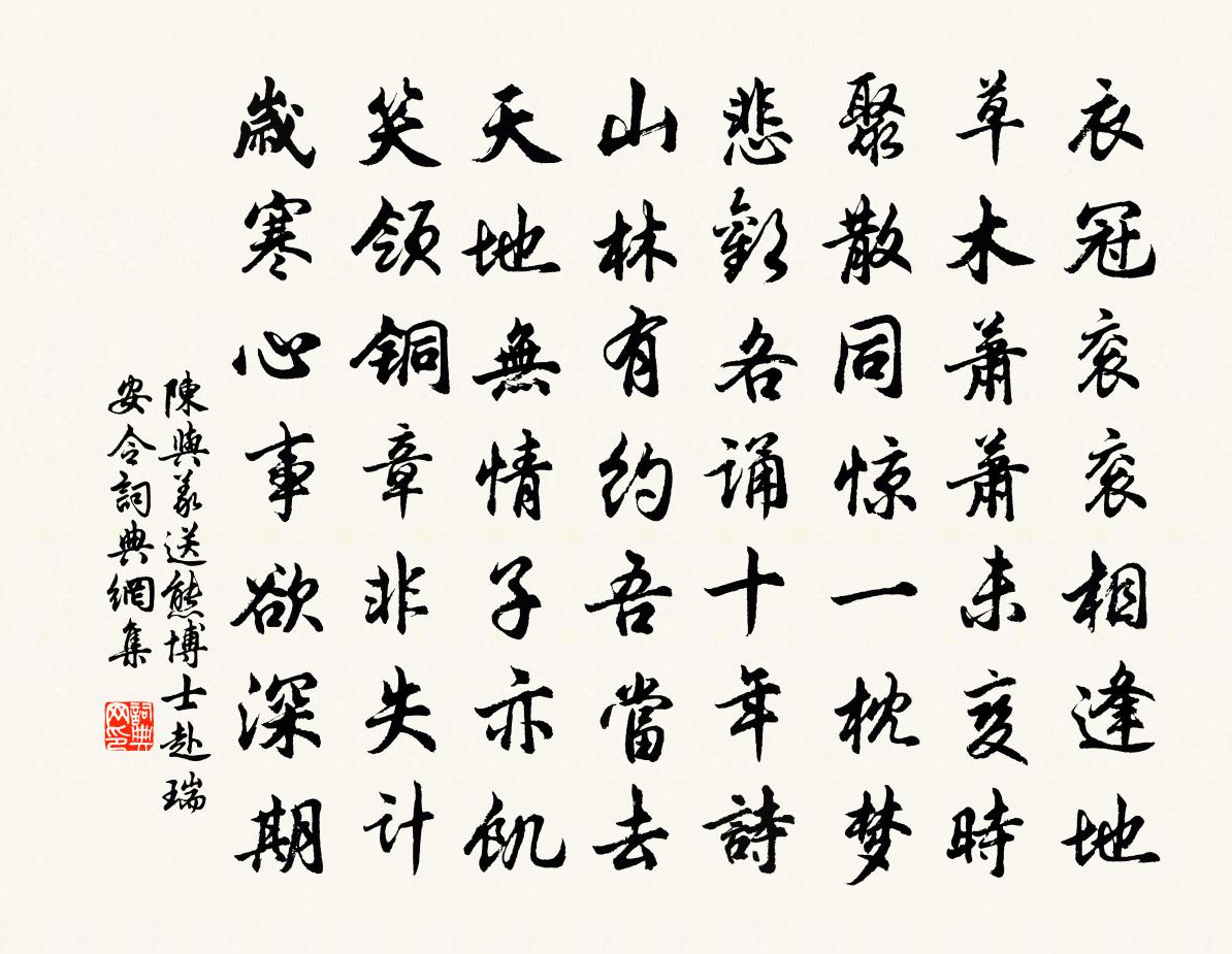 詩詞名句歷史字典書法欣賞書法字典國語詞典說文解字康熙字典古漢語字典標 題 作 者 詩 句 送熊博士赴瑞安令作者:陳與義 朝代:宋代送熊博士赴瑞安令原文衣冠袞袞相逢地,草木蕭蕭未變時。聚散同驚一枕夢,悲歡各誦十年詩。山林有約吾當去,天地無情子亦飢。笑領銅章非失計,歲寒心事欲深期。詩詞問答問:送熊博士赴瑞安令的作者是誰?答:陳與義問:送熊博士赴瑞安令寫於哪個朝代?答:宋代問:陳與義的名句有哪些?答:陳與義名句大全陳與義送熊博士赴瑞安令書法欣賞送熊博士赴瑞安令書法作品詩詞推薦贈任懶夫林逋〔宋代〕未肯求科第,深坊且隱居。勝游攜野客,高臥看兵書。點藥醫閒馬,分泉灌晚蔬。漢廷無得意,誰擬薦相如。謝朱常侍寄貺蜀茶剡紙二首崔道融〔唐代〕瑟瑟香塵瑟瑟泉,驚風驟雨起爐煙。一甌解卻山中醉,便覺身輕欲上天。百幅輕明雪未融,薛家凡紙漫深紅。不應浪淘沙·雲氣壓虛欄蔣春霖〔清代〕雲氣壓虛欄,青失遙山,雨絲風絮一番番。上巳清明都過了,只是春寒。 華發已無端,何況花殘?飛來蝴蝶又方響歌李沇〔唐代〕敲金扣石聲相凌,遙空冷靜天正澄。寶瓶下井轆轤急,小娃弄索傷清冰。穿絲透管音未歇,迴風繞指驚泉咽。季倫斬蛇佚名〔宋代〕皇統承堯運,朱旗啟漢家。未誅秦始鹿,先斬沛中蛇。和炅法師游昆明池詩 二庾信〔南北朝〕秋光麗晚天。鷁舸泛中川。密菱障浴鳥。高荷沒釣船。碎珠縈斷菊。殘絲繞折蓮。落花催斗酒。棲烏送一弦。宮詞王珪〔唐代〕簾旌風卷綠波流,繡扇紅鸞五彩樓。撮角茶床金釘校,暗花香印錦紋頭。探春慢姜夔〔宋代〕惟姊弟之愛,沔之父老兒女子,亦莫不予愛也。丙午冬,千岩老人約予過苕霅,歲晚乘濤載雪而下。顧念依依,殆贈祁門不老山高法師汪莘〔宋代〕鰲山萬仞峙璇霄,上有高真道寂寥。拔足壯能軒物表,洗心清不渾塵囂。洞天別有風光異,人世那知宇宙遙。雲覆送英州推官胡寅〔宋代〕素業平生筆硯交,粗官何事管榜敲。自傷放逐生中熱,時對清風解外膠。掞藻更窺青玉案,分甘常記綠羅袍。扁舟常山孫令見過仆未起孫題壁而去作絕句寄之毛滂〔宋代〕醉鄉冉冉夢遊閒,一夜涼風喚未還。可是應門無稚子,雙鳧仙去定誰攀。舞鶴四絕岳珂〔宋代〕一川翠毯淺蕪平,上有鶯簧百囀聲。萬里煙霄看鷺振,一池鼓吹謾蛙鳴。佺上人遊方薛嵎〔宋代〕燕鴻來去盡,蕭索此時心。杖錫投何寺,風霜別故林。夜床煨葉炎,朝谷應樵音。往往長松下,看山坐獨吟。立秋後病作此寫懷強至〔宋代〕臥病喜秋至,昏煩庶以平。清風不少濟,宿疢仍相攖。涼葉猶未振,陰蛩已先鳴。四時順萬物,奚獨戕吾生。夜聞杜鵑釋紹嵩〔宋代〕竹塢無塵水檻清,一更更盡到三更。杜鵑不管人殘夢,雨外飛來頭上聲。苦熱釋智圓〔宋代〕平湖日炙沸如煮,庭樹色乾鳥渴死。何人萬里驅徵車,紅塵漲天方入市。柳下聞蟬徐照〔宋代〕晚涼多處聽蟬聲,齊女當年變化成。不合著身楊柳上,也令千古動離情。義榮見示禪月山居詩盥讀數過六根洒然但余素鄭剛中〔宋代〕不曾貪進不曾休,俯仰人間今白頭。一切有為皆妄幻,十方無礙足浮游。誰言學佛須披衲,頗笑求仙唯造樓。只有和懷英雪詩李處權〔宋代〕縱賞鉤簾面遠山,蟹螯誰復問尖團。飛花空自嫌春晚,折竹應當念歲寒。句法一如冰柱險,書齋坐怪玉壺寬。固知題弟子問晁說之〔宋代〕人物昭陵一代傾,墨莊夫子著書成。我生既晚復何恨,解叩青霜鍾大鳴。名句推薦記得年時臨上馬,看人眼淚汪汪。劉彤《臨江仙·千里長安名利客》 少事長,賤事貴,不肖事賢,是天下之通義也。荀子《荀子·仲尼》 少小雖非投筆吏,論功還欲請長纓。祖詠《望薊門》 不才明主棄,多病故人疏。孟浩然《歲暮歸南山 / 歸故園作 / 歸終南山》 明者防於無形,治者制其未亂魏徵《隋書·列傳·卷四》 自是荷花開較晚,孤負東風。幼卿《浪淘沙·極目楚天空》 他鄉共酌金花酒,萬里同悲鴻雁天。盧照鄰《九月九日玄武山旅眺》 鐘山抱金陵,霸氣昔騰發。李白《登梅岡望金陵贈族侄高座寺僧中孚》 行吟坐嘯獨悲秋,海霧江雲引暮愁。陳子龍《秋日雜感(十首選一)》 勞苦之事則爭先,饒樂之事則能讓。荀子《荀子·修身》