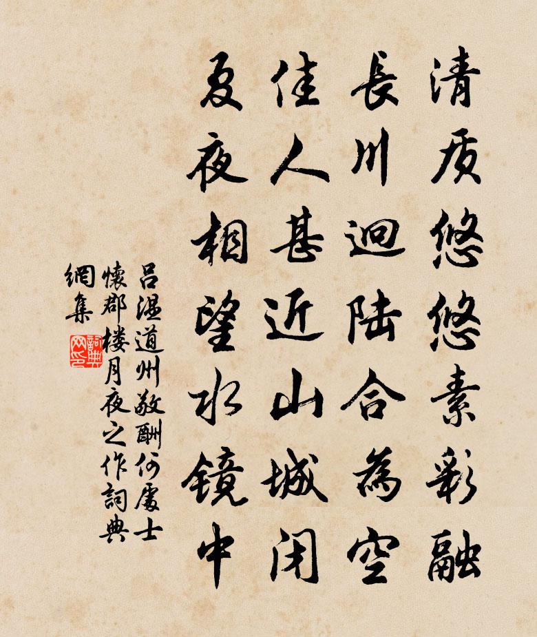 詩詞名句歷史字典書法欣賞書法字典國語詞典說文解字康熙字典古漢語字典標 題 作 者 詩 句 道州敬酬何處士懷郡樓月夜之作作者:呂溫 朝代:唐代原文清質悠悠素彩融,長川迥陸合為空。佳人甚近山城閉,夏夜相望水鏡中。詩詞問答問:《道州敬酬何處士懷郡樓月夜之作》的作者是誰?答:呂溫問:該詩寫於哪個朝代?答:唐代問:該詩是什麼體裁?答:七絕書法欣賞道州敬酬何處士懷郡樓月夜之作書法作品注釋全唐詩:卷370-25詩詞推薦舟次嚴陵方岳〔宋代〕人語山相應,舟行岸自移。魚因寒越雋,鷺到晚猶飢。歲盡難為客,江晴易得詩。渺予煙水闊,何以此行為。孟子由仁義行陳普〔宋代〕聖心仁義相為一,行動無非個裹來。已自不思並不勉,曷嘗著意為安排。踏莎行辛棄疾〔宋代〕萱草齊階,芭蕉弄葉。亂紅點點團香蝶。過牆一陣海棠風,隔簾幾處梨花雪。愁滿芳心,酒潮紅頰。年年此際傷離海漫漫-戒求仙也白居易〔唐代〕海漫漫,直下無底傍無邊。雲濤煙浪最深處,人傳中有三神山。山上多生不死藥,服之羽化為天仙。秦皇漢武信此同兒輩賦未開海棠元好問〔金代〕枝間新綠一重重,小蕾深藏數點紅。愛惜芳心莫輕吐,且教桃李鬧春風。詠史下關羽四首陳普〔宋代〕北人更欲生關羽,猶倚糜芳信士仁。曹操雄心懷白馬,董昭空自弄精神。望江南·春睡起金德淑〔宋代〕春睡起,積雪滿燕山。萬里長城橫縞帶,六街燈火已闌珊。人立玉樓間。送家安國赴成都教授三絕蘇轍〔宋代〕垂白相逢四十年,猖狂情味老俱闌。論兵頓似前賢語,莫作當年故目看。與天寧寺主僧雲岫對坐偶成陳著〔宋代〕瀟瀟風雨里,得得又開門。兩榻蕙蘭壁,半檐花竹村。鳴蛙藏綠暗,歸翼帶黃昏。此景少人會,相看付不言。歸來王冕〔元代〕湖海飄零久,歸來依舊貧。顧無青眼友,喜有白頭親。籬菊留余色,庭梅奏早春。溪翁密相訪,杯酒接殷勤。山居詩釋延壽〔宋代〕此事從來已絕疑,安然樂道合希夷。依山偶得還源旨,拂石閒題出格詩,水待凍開成細溜,薪從霜後拾枯枝。因茲怨春風(高平調)張先〔宋代〕無由且住。綿綿恨似春蠶緒。見來時餉還須去。月淺燈收,多在偷期處。今夜掩妝花下語。明朝芳草東西路。願身遠遊陸游〔宋代〕壯年不作故山歸,老去方知浪走非。掛日片帆吳赤壁,嘶風疋馬蜀青衣。交遊雖廣知心少,香火徒勤願力微。堪笑十報恩馬鈺〔元代〕山侗二願報師恩。立誓修行志煉心。火焰滅除火養木,水銀枯盡水生金。木金三間通玄路,水火同流結寶岑。久視南鄉子歐陽修〔宋代〕雨後斜陽。細細風來細細香。風定波平花映水,休藏。照出輕盈半面妝。路隔秋江。蓮子深深隱翠房。意在蓮心無故陳州刺史贈兵部尚書韋公輓詞孫逖〔唐代〕奕葉金章貴,連枝鼎位尊。台庭為鳳穴,相府是鴒原。世閱空悲命,泉幽不返魂。惟餘漢臣史,繼術贊韋門。故翰林彭學士輓歌司馬光〔宋代〕夙昔游清貫,時流藉重名。讎書石渠秘,視草玉堂榮。吉兆虛三鱓,凶期告兩楹。子云思故國,墳樹必西傾。沙丘城下寄杜甫李白〔唐代〕我來竟何事,高臥沙丘城。城邊有古樹,日夕連秋聲。魯酒不可醉,齊歌空復情。思君若汶水,浩蕩寄南征。七仙寺石履二首白玉蟾〔宋代〕古人參罷祖師禪,已證如如不動尊。想見腳根堅似鐵,履鞋化石儼然存。句韓維〔宋代〕一笛西風吹落日,滿帆行客背孤城。名句推薦良農不為水旱不耕,良賈不為折閱不市。荀子《荀子·修身》 為誰醉倒為誰醒,到今猶恨輕離別。呂本中《踏莎行·雪似梅花》 涉江采芙蓉,蘭澤多芳草。佚名《涉江采芙蓉》 賢者舉而上之,富而貴之,以為官長,不肖者抑而廢之。墨子《墨子·09章 尚賢(中)》 高館張燈酒復清,夜鍾殘月雁歸聲。高適《夜別韋司士》 江畔何人初見月?江月何年初照人?張若虛《春江花月夜》 桃李待日開,榮華照當年。李白《長歌行》 大雪北風催,家家貧白屋。環山樵《薛寶釵·雪竹》 合歡桃核終堪恨,里許元來別有人。溫庭筠《南歌子詞二首 / 新添聲楊柳枝詞》 赤壁磯頭落照,肥水橋邊衰草,渺渺喚人愁張孝祥《水調歌頭·和龐佑父》