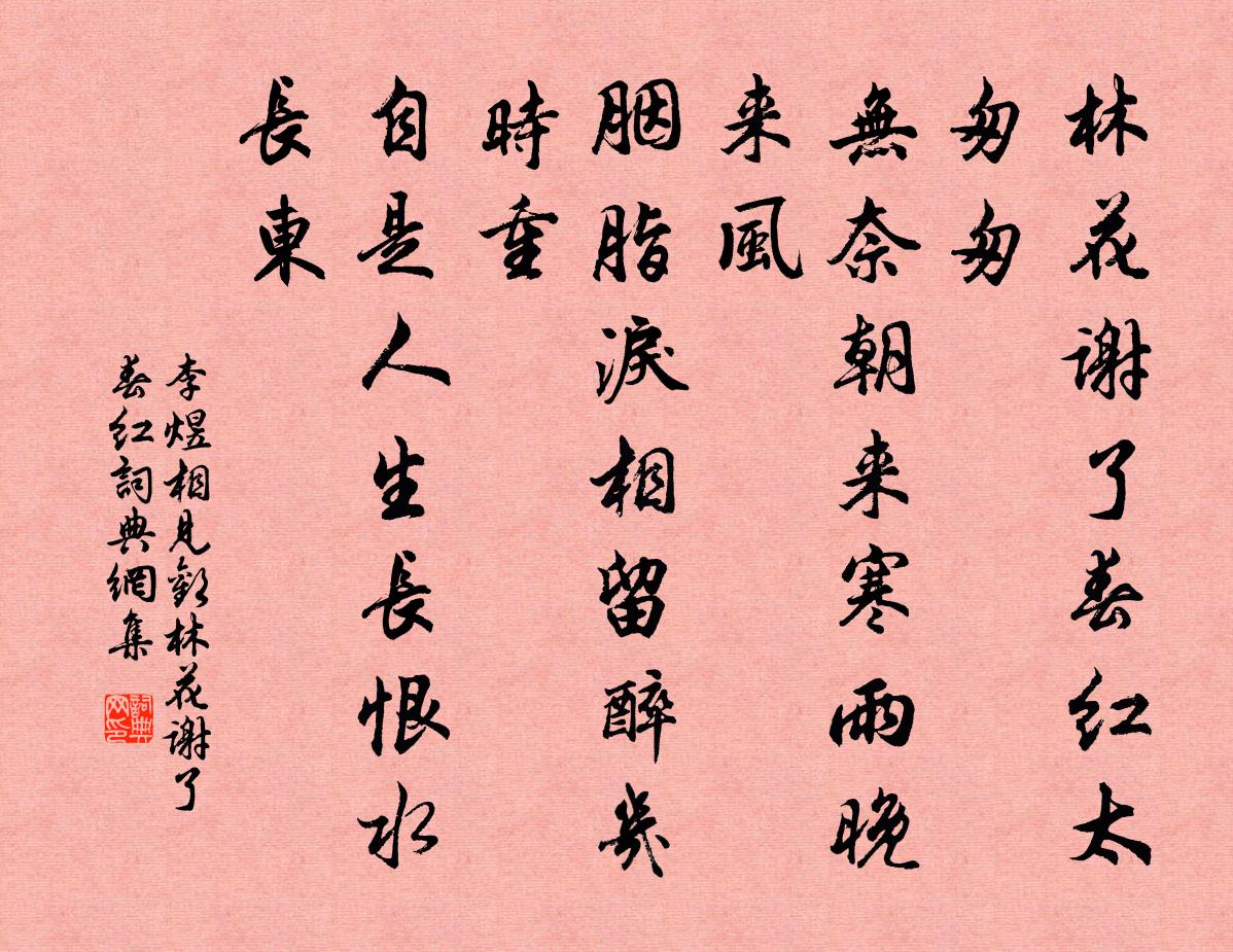林花謝了春紅,太匆匆。無奈朝來寒雨晚來風。胭脂淚,相留醉,幾時重。自是人生長恨水長東。(相留 一作:留人)