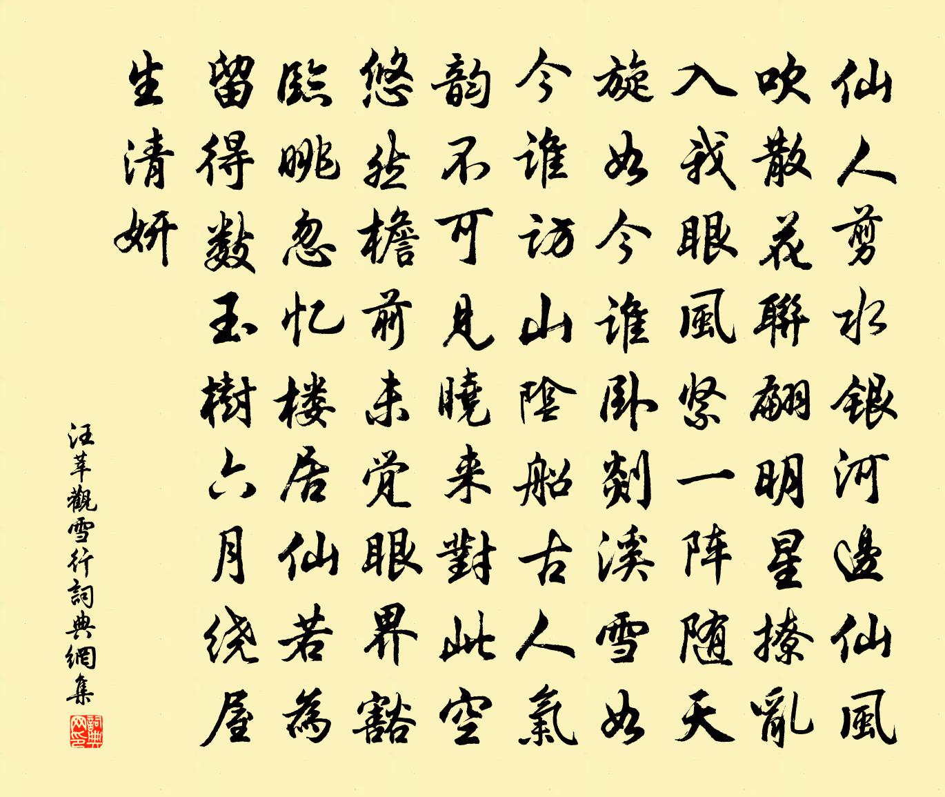詩詞名句歷史字典書法欣賞書法字典國語詞典說文解字康熙字典古漢語字典標 題 作 者 詩 句 觀雪行作者:汪莘 朝代:宋代觀雪行原文仙人剪水銀河邊,仙風吹散花聯翩。明星撩亂入我眼,風緊一陣隨天旋。如今誰臥剡溪雪,如今誰訪山陰船。古人氣韻不可見,曉來對此空悠然。檐前未覺眼界豁,臨眺忽憶樓居仙。若為留得數玉樹,六月繞屋生清妍。詩詞問答問:觀雪行的作者是誰?答:汪莘問:觀雪行寫於哪個朝代?答:宋代汪莘觀雪行書法欣賞觀雪行書法作品詩詞推薦過舊遊見雙鶴愴然有懷李遠〔唐代〕謝公何歲掩松楸,雙鶴依然傍玉樓。朱頂巑岏荒草上,雪毛零落小池頭。蓬瀛路斷君何在,雲水情深我尚留。他日六言偈四首劉克莊〔宋代〕佛祖流傳信具,兒孫承襲付度。一個深夜攜歸,一個中路奪去。次韻十二神體方岳〔宋代〕鼠技歇窮誰比數,牛衣政可眠春雨。虎窺九關高莫捫,兔禿千毫老無補。龍嬰鱗逆事可驚,蛇畫足添心獨苦。馬寧城南即事張栻〔宋代〕一春風雨水平湖,更覺湖心月榭孤。坐看百花開落遍,依然山色對清廬。楊柳枝(淡月)王質〔宋代〕慣得嬌雲趕不開。去還來。淡光無可照樓台。且停杯。薄雨疏疏時幾點,灑浮埃。賣花未上擔兒抬。聽他催。龍泉寺納涼呂同老〔宋代〕靡靡市廛盡,杳杳泉石閒。灌木蔽榛莽,爽籟彌空山。飛甍納餘輝,丹雘粲以繁。巍然青蓮宮,俯此碧玉闌。化人宿山驛吳商浩〔唐代〕文戰何堪功未圖,又驅羸馬指天衢。露華凝夜渚蓮盡,月彩滿輪山驛孤。岐路辛勤終日有,鄉關音信隔年無。好同華陽洞林逋叟〔宋代〕華陽山雨拂輕塵,獨步煙霞訪隱真。笑傲太平雲外客,安閒清世夢中身。金章名重人稱貴,布褐才高道不貧。吟罷贈元紱李群玉〔唐代〕相逢在總角,與子即同心。隱石那知玉,披沙始遇金。蘭秋香不死,松晚翠方深。各保芳堅性,寧憂霜霰侵。錦堂春/錦堂春慢司馬光〔宋代〕紅日遲遲,虛廊轉影,槐陰迤邐西斜。彩筆工夫,難狀晚景煙霞。蝶尚不知春去,漫繞幽砌尋花。奈猛風過後,縱奉和九日幸臨渭亭登高應制得直字李鹹〔唐代〕重陽乘令序,四野開晴色。日月數初並,乾坤聖登極。菊黃迎酒泛,松翠凌霜直。游海難為深,負山徒倦力。昭君怨四首曹勛〔宋代〕再拜升車望已過,卻教紅粉保山河。當時豈止毛延壽,對面欺君事更多。菩薩蠻楊冠卿〔宋代〕冰肌玉襯香綃薄。無言獨倚闌乾角。相見又還休。可堪歸去愁。碧波溪上路。幾陣黃昏雨。歸去斷人腸。紗廚枕簟挽聶孺人劉克莊〔宋代〕已病猶蔬素,西歸不復疑。飛鳧逾嶺遠,別鶴返鄉遲。箴史傳賢女,巾褠付侍姬。白頭潘令在,應有悼亡詩。偈頌三十六首釋如珙〔宋代〕明暗色空,不曾礙人。一念周沙界,日用萬般通。湛然常寂寂,常轉自家風。挽漳守鄭都承子敬四首王邁〔宋代〕壺山閥閱例多賢,雪玉風標憶眼前。正獻風猷復齋為,蜀公素業肯亭傳。人於故國悲諸老,我為吾州惜老仙。在昔送閻少隱同其弟伯子宣子赴試淮南為一月之別仲並〔宋代〕街頭日夜催槐黃,去去歸帆如許忙。我病公行欠卮酒,少遲飲至共傳觴。閉門齊己〔唐代〕正是閉門爭合閉,大家開處不須開。還防朗月清風夜,有個詩人相訪來。久雨薪炭食飲俱不繼戲作陸游〔宋代〕澤國春饒雨,書生老益貧,固難夸練炭,亦豈擇勞薪。鹽盡才供暮,醯微尚惱鄰。人嗤信書誤,痴絕望常珍。兵部王仲行尚書惠詩敘近日直舍隔壁論詩說棋周必大〔宋代〕詩可弄萬象,棋能消百憂。苦吟復苦戰,已過心休休。自從識夫子,十閱長安秋。奇才揜眾俊,博物包九流。遊戲名句推薦枉直隨形而不在影,屈申任物而不在我列子及其弟子《列子·說符》 綠蓑江上秋聞笛,紅袖樓頭夜倚欄。曹雪芹《香菱詠月·其三》 輪台東門送君去,去時雪滿天山路。岑參《白雪歌送武判官歸京》 智之所貴,存我為貴;力之所賤,侵物為賤。然身非我有也,既生,不得不全之列子及其弟子《列子·楊朱》 玉顏憔悴三年,誰復商量管弦。王建《宮中調笑·團扇》 十有九人堪白眼,百無—用是書生。黃景仁《雜感》 一朵芙蕖,開過尚盈盈。蘇軾《江神子·江景》 手攜稚子夜歸院,月冷空房不見人。白居易《為薛台悼亡》 東風惆悵欲清明,公子橋邊沉醉。張泌《滿宮花·花正芳》 秋草六朝寒,花雨空壇。朱彝尊《賣花聲·雨花台》