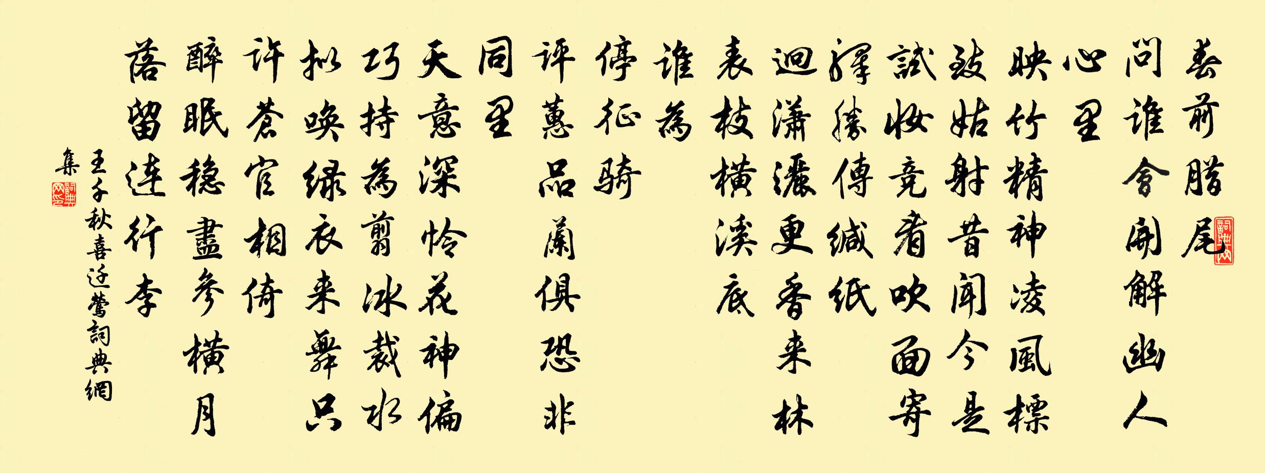 詩詞名句歷史字典書法欣賞書法字典國語詞典說文解字康熙字典古漢語字典標 題 作 者 詩 句 喜遷鶯作者:王千秋 朝代:宋代喜遷鶯原文春前臘尾。問誰會開解,幽人心裡。映竹精神,凌風標緻,姑射昔聞今是。試妝競看吹面,寄驛勝傳緘紙。迥瀟灑,更香來林表,枝橫溪底。誰為。停徵騎。評蕙品蘭,俱恐非同里。天意深憐,花神偏巧,持為翦冰裁水。擬喚綠衣來舞,只許蒼官相倚。醉眠穩,盡參橫月落,留連行李。詩詞問答問:喜遷鶯的作者是誰?答:王千秋問:喜遷鶯寫於哪個朝代?答:宋代問:喜遷鶯是什麼體裁?答:詞王千秋喜遷鶯書法欣賞喜遷鶯書法作品詩詞推薦敬賦黃萬安肅餘五雲閣曾豐〔宋代〕一合乾坤羅萬象,中有連天雲錦帳。分光日月兩輪間,聚蔭神仙十洲上。盤緗錯縹天上無,若為雲錦如許都。媧皇送許尉子云二首李呂〔宋代〕濟人曾現斬蛟手,慢學吳門作陸仙。雪月精神資句法,經綸器識得天全。評君全在羲皇上,許我難堪叔度賢。出處雜曲歌辭。少年樂李賀〔唐代〕芳草落花如錦地,二十長游醉鄉里。紅纓不重白馬驕,垂柳金絲香拂水。吳娥未笑花不開,綠鬢聳墮蘭雲起。陸郎好事近·花底一聲鶯劉翰〔宋代〕花底一聲鶯,花上半鉤斜月。月落烏啼何處,點飛英如雪。東風吹盡去年愁,解放丁香結。驚動小亭紅雨,舞雙雙青溪任希夷〔宋代〕閉門忽憶東風面,步向表溪繞碧灣。淡白深紅了無跡,綠楊煙外一鐘山。白雲王安石〔宋代〕英英白雲浮在天,下無根蒂旁無連。西風來吹欲消散,落日起望心悠然。願回羲和借光景,常使秀色當檐邊。時來招山乃詩人劉叔擬故居朱清之得其地清之赴南戴復古〔宋代〕半路袖回攀佳手,一生才遂買山心。要知此老風流處,來向劉郎吟處吟。歸姑蘇周文璞〔宋代〕舊巢已是別人門,梅自蕭疏柳自昏。河北謗來須混俗,江東讞就欲招魂。故王未納耶溪女,越相先尋澤國村。懷古送強甫赴惠安六言十首劉克莊〔宋代〕古雲若保赤子,亦曰如烹小鮮。雉馴萬物遂性,犬吠一村廢眠。敬酬張九齡當塗界留贈之作裴耀卿〔唐代〕茂先實王佐,仲舉信時英。氣睹沖天發,人將下榻迎。珪符肅有命,江國遠徂征。九派期方越,千鈞或所輕。高帆別後寄趙賓暘並楊華父二首方回〔宋代〕虛翁眼暗魯翁聾,聚散匆匆老病蹤。近已有人傳我死,何期此地與君逢。兩窮未必時流識,一笑猶為造物容。自覺冬日早作裘萬頃〔宋代〕黃昏月姊翦雲開,夜半雷車載雨來。晨起鉤簾望霄漢,風花吹墮萬璚瑰。有感葛立方〔宋代〕但知鬼目為芝草,誰信羚羊破佛牙。娘子阿姨何處辨,時人識賣假金家。張屯田知兗州宋祁〔宋代〕漢家關內使騶來,廣魯風旟畫隼開。地得股肱雄近輔,書留筋骨冠中台。儒宮劃壁嚴祠豆,督府均羊盛宴罍。應望秋日雜興李廌〔宋代〕橫煙下平林,閒雲依袤嶺。寓想高鴻背,游目凌倒景。吁嗟老於行,末路未遑騁。晚歲竟如何,三嘆心耿耿。廿一兄以手和四清香見餉用心清聞妙香為韻成曾幾〔宋代〕花覆春風殿,爐薰上紫清。舊時香案吏,趺坐對煙明。愛梅吳芾〔宋代〕經年不得見江梅,繞樹行行日幾回。已擬開時拼徑醉,其如病後怯銜杯。傷心還覺成三嘆,忍淚猶能強一來。顧我偈公六十五首釋鹹傑〔宋代〕今朝十五日,叢林皆結制。徑山有條攀條,無條攀例。逼拶露柱燈籠,盡要心空及第。現前普請證明,不妨神通游病中招孫醫士彭龜年〔宋代〕冬冬才動熱蒸蒸,直到更初漸漸清。臓腑始堅今反利,痰涎愈盛氣難平。形容凋瘦真如鬼,耳目聰明粗似人。自是哭同年羅著作王禹偁〔宋代〕同試五題為縣吏,共求三字作詞臣。西垣謫宦何須恨,若比羅三是幸人。名句推薦非君子不可與語變。王通《中說·卷七·述史篇》 梁園日暮亂飛鴉,極目蕭條三兩家。岑參《山房春事二首》 故不登高山,不知天之高也;不臨深溪,不知地之厚也;荀子《勸學》 田家幾日閒,耕種從此起。韋應物《觀田家》 雲淡風輕近午天,傍花隨柳過前川。程顥《春日偶成·雲淡風輕近午天》 秋色雁聲愁幾許,都在斜陽。吳文英《浪淘沙·九日從吳見山覓酒》 去年上巳洛橋邊,今年寒食廬山曲。宋之問《寒食江州滿塘驛》 害人之心不可有,防人之心不可無!佚名《增廣賢文·下集》 南去北來徒自老,故人稀。賀鑄《釣船歸·綠淨春深好染衣》 桂魄初生秋露微,輕羅已薄未更衣。王維《秋夜曲》