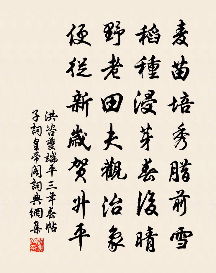 詩詞名句歷史字典書法欣賞書法字典國語詞典說文解字康熙字典古漢語字典標 題 作 者 詩 句 端平三年春帖子詞皇帝閣作者:洪咨夔 朝代:宋代端平三年春帖子詞皇帝閣原文麥苗培秀臘前雪,稻種浸芽春後晴。野老田夫觀治象,便從新歲賀昇平。詩詞問答問:端平三年春帖子詞皇帝閣的作者是誰?答:洪咨夔問:端平三年春帖子詞皇帝閣寫於哪個朝代?答:宋代洪咨夔端平三年春帖子詞皇帝閣書法欣賞端平三年春帖子詞皇帝閣書法作品詩詞推薦和人懷歸袁說友〔宋代〕宦海風波惡,窮途故舊新。匹夫猶按劍,夜璧莫投人。狎水舟沈羽,防城口累身。歸來老丘壑,一笑樂吾真。安樂窩中吟邵雍〔宋代〕安樂窩中春暮時,閉門慵坐客來稀。蕭蕭微雨竹間霽,嘒嘒翠禽花上飛。好景盡將詩記錄,歡情須用酒維持。自餘閨門詩三首鄭剛中〔宋代〕幽思春雲亂,擬向琴中說。徽寒錦薦高,未鼓弦中絕。尚有無弦韻,或可奏明月。階前望冰輪,去去不停轍。薄命離齊州後五首曾鞏〔宋代〕荷氣夜涼生枕席,水聲秋醉入簾幃。一帆千里空回首,寂寞船窗只自知。寄莫道人陳文孫〔宋代〕林木自春蘭自芽,游山過我興何賒。鐵橋問徑最高頂,石洞開雲隨處家。人訝長年能綠髮,我知真性即丹砂。談鋒避地雲山全父弟詩寄梅花陽枋〔宋代〕久荒詩律廢陶鈞,妙句佳君語意親。便欲支筇到岩底,不須拍贈隴頭春。袁侍郎輓詩魏了翁〔宋代〕學術趨平實,年來似寂寥。豈無先後覺,未在始終條。此老能深造,諸公獨後彫。平生寄心事,仿佛見魚朝。紅頭紫賈似道〔宋代〕紅頭紫勇敵剛強,項赤紅班腿長{外囗內昆}長。翅紫牙灣如桑剪,此蟲名號促織王。莫瑤歌劉禹錫〔唐代〕莫瑤自生長,名字無符籍。市易雜鮫人,婚姻通木客。星居占泉眼,火種開山脊。夜渡千仞谿,含沙不能射。題翠蛟羅相〔宋代〕坡仙已跨老鯨去,夭矯一蛟留翠岑。頭角要歸滄海闊,鬐鱗聊舞小亭陰。停杯欲共馮夷語,倚杖不知嵐氣深。休用送從叔書記山陰隱居李洞〔唐代〕山頂絕茅居,雲泉繞枕虛。燒移僧影瘦,風展鷺行疏。第五弟豐獨在江左,近三四載寂無訊息,覓使寄此二首杜甫〔唐代〕亂後嗟吾在,羈棲見汝難。草黃騏驥病,沙晚鶺鴒寒。楚設關城險,吳吞水府寬。十年朝夕淚,衣袖不曾乾。聞汝二使者游東山酒後寄詩走筆次韻張栻〔宋代〕繡衣雙節從天下,文字皆稱一世豪。桂山發地凜千尺,新詩與之相併高。送桃岩成上人歸本寺嚴維〔唐代〕長老歸緣起,桃花憶舊岩。清晨雲抱石,深夜月籠杉。道具門人捧,齋糧谷鳥銜。餘生願依止,文字欲三緘。和端式十題秋原菊司馬光〔宋代〕高原向搖落,叢菊始滋榮。草際浮金碧,照人雙目明。何須天生理,玉斝泛餘英。泊上虞驛來日行四首陳造〔宋代〕溪山可圖畫,風物憶吾鄉。漁艇鷗鶩亂,茅茨菱芡香。送劉學士知衡州余靖〔宋代〕朱轓新命漢諸侯,地扼荊湘占上游。醽淥水聲侵古堞,祝融峰色入晴樓。晝垂三組鄉枌過,春擁雙旌岳寺游。番直百字令 春日湖上張可久〔元代〕扣舷驚笑,想當年行樂,綠朝紅暮。麴院題詩,人去遠、別換一番歌舞。鷗占涼波,鶯巢小樹,船閣鴛鴦浦。畫橋去萍草方回〔宋代〕童子攜竹器,摝去池中萍。見魚故已佳,水底林巒青。復呼荷鋤者,剃草汛我庭。蛇蚓無留藏,行徑免露零。劃穢歸鄉二首姜特立〔宋代〕憶昔東坡老,曾吟陌上花。我今歸故里,卉木正光華。名句推薦酒闌歌罷玉尊空,青缸暗明滅。李清照《好事近·風定落花深》 青青河畔草,鬱郁園中柳。佚名《青青河畔草》 軍氣橫大荒,戰酣日將入。王昌齡《從軍行二首》 天下之百姓皆上同於天子,而不上同於天,則災猶未去也。墨子《墨子·11章 尚同(上)》 交河城邊鳥飛絕,輪台路上馬蹄滑。岑參《天山雪歌送蕭治歸京》 思家步月清宵立,憶弟看雲白日眠。杜甫《恨別》 閒來無事不從容,睡覺東窗日已紅。程顥《秋日》 怒濤卷霜雪,天塹無涯。柳永《望海潮·東南形勝》 十年驅馳海色寒,孤臣於此望宸鑾。戚繼光《望闕台》 人道惡盈而好謙。佚名《易傳·彖傳上·謙》