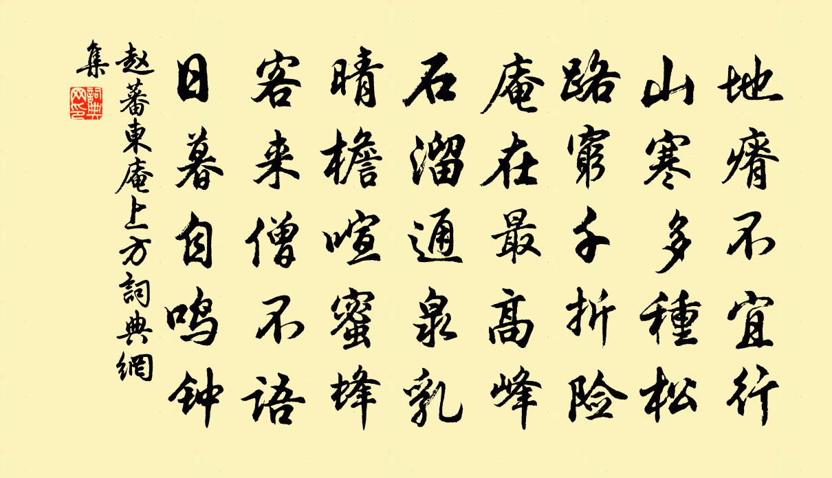 詩詞名句歷史字典書法欣賞書法字典國語詞典說文解字康熙字典古漢語字典標 題 作 者 詩 句 東庵上方作者:趙蕃 朝代:宋代東庵上方原文地瘠不宜行,山寒多種松。路窮千折險,庵在最高峰。石溜通泉乳,晴檐喧蜜蜂。客來僧不語,日暮自鳴鐘。詩詞問答問:東庵上方的作者是誰?答:趙蕃問:東庵上方寫於哪個朝代?答:宋代趙蕃東庵上方書法欣賞東庵上方書法作品詩詞推薦十一月後庭梅花盛開蔡襄〔宋代〕日暖香繁已盛開,開時曾繞百千回。春風豈是多情思,相伴花前去又來。對酒陸游〔宋代〕醫從和扁來,未著卻老方。吾晚乃得之,莫如麴櫱良。一杯臉生春,況復累十觴。坐令桃花紅,換盡霜葉黃。看鏡雜興陸游〔宋代〕孤夢初回揭短篷,橋邊曉日已曈曨。太平氣象君知否,盡在豐年笑語中。生查子·新月曲如眉牛希濟〔五代〕新月曲如眉,未有團圞意。紅豆不堪看,滿眼相思淚。終日劈桃穰,仁在心兒里。兩朵隔牆花,早晚成連理。依韻和子瞻游孤山文同〔宋代〕跨明越,壓蘇湖,錢塘風物天下無。玉峰孱顏石穿漏,雪海浩蕩潮喧呼。舊嘗持之詫吾孥,會挈爾去相與娛。宦遊春日田園雜興十首陳舜道〔宋代〕春來非是愛吟詩,詩是田園寄興時。稼穡但憑牛犢健,隊晴每付鵓鴣知。託尋花去將予樂,借卷桐吹實所思。撫景和惠檢閱送胡計院韻吳潛〔宋代〕小借園林一餉閒,相攜送客上天關。頺齡晚歲淒涼里,今日明朝聚散閒。極目煙雲方渺渺,滿蹊桃李正斑斑。老來臨秋三首宋庠〔宋代〕脫葉金霜罷,滄洲滿目前。林風寒結籟,溪日晚留煙。獨木橫官彴,方苞入稻田。持麾更吏隱,殊覺主恩偏。書窗劉克莊〔宋代〕跳丸屋角去如馳,蠹簡窗間卷復披。元老豈無揮玉麈,大儒曾有奮金樵。釣牽鰲極靈根動,斧入牛山傑木衰。白首送朱子式從軍馬廷鸞〔宋代〕折鏃奇勳在,衝冠怒氣深。堯天日月大,禹甸噎霾侵。塞下將軍令,隆中梁甫吟。酒行君可起,快展擊胡心。詠史八首蔡文姬蒲壽宬〔宋代〕琴彈十八拍,聽此雙淚流。一死固已難,萬言復誰尤。九原見衛子,何語可以酬。頌十玄談演教釋印肅〔宋代〕初說有空人盡執,未明理事虛勞力。念來年久轉 * ,心不負人徒面赤。古香慢(自度腔·夷則商犯無射宮·賦滄淚看桂)吳文英〔宋代〕怨娥墜柳,離佩搖葓,霜訊南圃。漫憶橋扉,倚竹袖寒日暮。還問月中游,夢飛過、金風翠羽。把殘雲、勝水萬頃高安公主輓歌二首李乂〔唐代〕湯沐三千賦,樓台十二重。銀爐稱貴幸,玉輦盛過逢。嬪則留中饋,娥輝沒下舂。平陽百歲後,歌舞為誰容。賓衛蝶戀花 上巳召親族李清照〔宋代〕永夜懨懨歡意少,空夢長安,認取長安道。為報今年春色好,花光月影宜相照。隨意杯盤雖草草,酒美梅酸,恰稱賀吉州李守臘雪楊萬里〔宋代〕仁侯妙手作廬陵,民歌敏惠如神明。歌聲動天天降瑞,一夜幻出瓊瑤城。麗譙一新玉樓觀,郡治別起銀設廳。曉上壺中天(壽丘樞密)程珌〔宋代〕日躔東井,正輪囷桂影,十分光潔。火令方中符國運,天與非常英傑。犖犖平生,眼空宇宙,綠髮千尋雪。笑談一郭圃送蕪菁感成長句張耒〔宋代〕蕪菁至南皆變菘,菘美在上根不食。瑤簪玉筍不可見,使我每食思故國。西鄰老翁知我意,盈筐走送如雪白。蒸烹晚秋農家陸游〔宋代〕吾里賢長者,蓋有萬石風。少年以利遷,但可哀其窮。仁義亦何常,聖賢與人同。我言不足取,汝豈忘乃翁?若拙弟說汝州可居已卜約一丘用韻寄元東陳與義〔宋代〕四歲冷官桑濮地,三年羸馬帝王州。陶潛迷路已良遠,張翰思歸那待秋。病鶴欲飛還躑躅,孤雲欲去更遲留。盍簪名句推薦秋色雁聲愁幾許,都在斜陽。吳文英《浪淘沙·九日從吳見山覓酒》 古人忠孝,不離心頭,今人忠孝,不離口頭,此是何等志量。王永彬《圍爐夜話·第二三則》 離歌且莫翻新闋。一曲能教腸寸結。歐陽修《玉樓春·尊前擬把歸期說》 逢郎欲語低頭笑,碧玉搔頭落水中。白居易《採蓮曲》 馬嘶人散後,秋風換、故園夢裡。吳文英《丁香結·夷則商秋日海棠》 花片片飛風弄蝶,柳陰陰下水平橋。張先《浣溪沙·樓倚春江百尺高》 人間萬事,毫髮常重泰山輕。辛棄疾《水調歌頭·壬子三山被召陳端仁給事飲餞席上作》 高山安可仰,徒此揖清芬李白《贈孟浩然》 人情似紙張張薄,世事如棋局局新。佚名《增廣賢文·上集》 銜霜當路發,映雪擬寒開。何遜《詠早梅 / 揚州法曹梅花盛開》