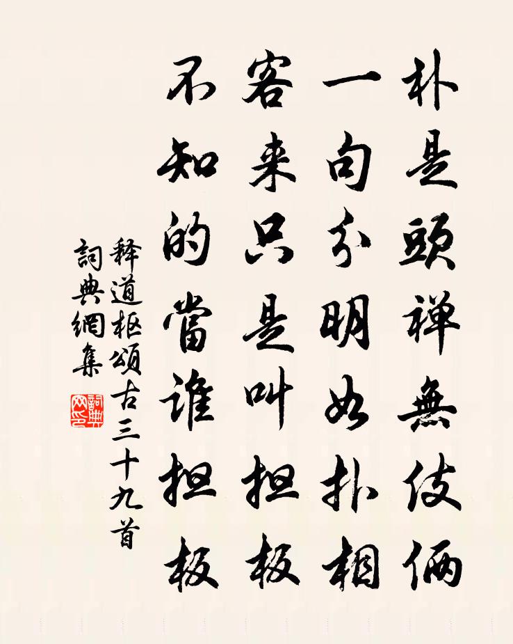 詩詞名句歷史字典書法欣賞書法字典國語詞典說文解字康熙字典古漢語字典標 題 作 者 詩 句 頌古三十九首作者:釋道樞 朝代:宋代頌古三十九首原文朴是頭禪無伎倆,一句分明如撲相。客來只是叫擔板,不知的當誰擔板。詩詞問答問:頌古三十九首的作者是誰?答:釋道樞問:頌古三十九首寫於哪個朝代?答:宋代釋道樞頌古三十九首書法欣賞頌古三十九首書法作品詩詞推薦頌證道歌證道歌釋印肅〔宋代〕三毒水泡虛出沒,將無作有埋深窟。洛浦曾將喻色身,誰人解語依靈物。題永崇西平王宅太尉愬院六韻杜牧〔唐代〕天下無雙將,關西第一雄。授符黃石老,學劍白猿翁。矯矯雲長勇,恂恂卻縠風。家呼小太尉,國號大梁公。[太偈頌九十三首釋梵琮〔宋代〕仙居多異草,聖地絕凡蹤。秋風動鱗甲,生蛇化活龍。次韻劉生蝶葉交飛陳著〔宋代〕荷衰菊老柳微黃,蝶舞風林葉共狂。閬苑無花留不住,飛來學做小春忙。觀丙辰省試宣鎖作胡仲弓〔宋代〕四海文章屬品題,老夫刮臘有金篦。諸君熟讀阿房賦,未必能為五色迷。和仲良病中耽睡楊萬里〔宋代〕居士何曾病,群兒錯見憐。對床正風雨,落紙忽雲煙。欲夏花全退,猶寒柳尚眠。如何睡卿里,只是著詩仙。池邊李商隱〔唐代〕玉管葭灰細細吹,流鶯上下燕參差。日西千繞池邊樹,憶把枯條撼雪時。和楊季恪景疏希白二首吳芾〔宋代〕人議居士老來迂,與世依違總不符。雖似子牟懷魏闕,卻同居易學浮屠。鋤荒只欲開三徑,適意寧論泛五湖。胸次次韻和原甫閣下午寢晚歸見示梅堯臣〔宋代〕殿閣風來夏日長,青林抽嫩見余芳。筆供五吏詞休敏,簟展雙紋睡正涼。故事早歸何獨晚,舊交新詠尚無忘。不言高士詠顏歜吳筠〔唐代〕高哉彼顏歜,逸氣陵齊宣。道尊義不屈,士重王來前。榮祿安可誘,保和從自然。放情任所尚,長揖歸山泉。與政仲山行見梅偶成並和其詩二首劉學箕〔宋代〕梅花端的記年芳,每到開時趁一陽。綠水湖邊和靖句,含章檐下壽陽妝。昏昏澹月疏疏影,緩緩清風細細香。不比煙徐夤〔唐代〕燎野焚林見所從,惹空橫水展形容。能滋甘雨隨車潤,不並行雲逐夢蹤。晴鳥回籠嘉樹薄,春亭嬌幕好花濃。有時再送黃醇甫四川制乾二首項安世〔宋代〕柏氏諸龍我獨蛇,樂翁群玉子無瑕。高曾未遠情終在,閩楚相望跡自賒。曉鏡雪侵蓮府綠,夜堂風入絳帷紗。天將白水縣崔少府十九翁高齋三十韻杜甫〔唐代〕客從南縣來,浩蕩無與適。旅食白日長,況當朱炎赫。高齋坐林杪,信宿游衍闃。清晨陪躋攀,傲睨俯峭壁。崇岡維揚萬花園宋伯仁〔宋代〕細柳營基鎖綠苔,萬花新種小亭台。芙蓉喜見江南客,故向西風一夜開。青玉案·綠槐煙柳長亭惠洪〔宋代〕綠槐煙柳長亭路。恨取次、分離去。日永如年愁難度。高城回首,暮雲遮盡,目斷人何處。解鞍旅舍天將暮。暗憶摸魚兒(登鳳凰台)梁棟〔宋代〕枕寒流、碧縈衣帶,高台平與雲倚。燕來鶯去誰為主,磨滅謫仙吟墨。愁思里。待說與山靈,還又羞拈起。蕭韶已送綿竹王主簿曹彥約〔宋代〕渴想才名不計年,得詩甜處徹中邊。知君眼裡藏青白,吒意杯中別聖賢。萬里偶逢多幸耳,一朝相別兩茫然。榮歸縣齋感懷二首張詠〔宋代〕前朝官政似無端,袁澤先生百日還。堪愧崇陽九河客,明時不敢自歸山。重題黃鶴樓柴望〔宋代〕自從崔顥題詩後,更有何人吊禰衡。芳草不知鸚鵡恨,晴天惟見漢陽城。樓頭月落酒方醒,岸口風高雁正鳴。五百名句推薦又有牆頭千葉桃,風動落花紅蔌蔌。元稹《連昌宮詞》 待到重陽日,還來就菊花。孟浩然《過故人莊》 誰家玉笛暗飛聲,散入春風滿洛城。李白《春夜洛城聞笛 / 春夜洛陽城聞笛》 疑行無成,疑事無功。商鞅《商君書·更法》 我未成名卿未嫁,可能俱是不如人。羅隱《贈妓雲英 / 嘲鍾陵妓雲英》 風裡落花誰是主?思悠悠。李璟《攤破浣溪沙·手卷真珠上玉鉤》 玉在櫝中求善價,釵於奩內待時飛。曹雪芹《紅樓夢·第一回》 新帖繡羅襦,雙雙金鷓鴣。溫庭筠《菩薩蠻·小山重疊金明滅》 平明日出東南地,滿磧寒光生鐵衣。李益《度破訥沙二首·其二 / 塞北行次度破訥沙》 鳳林關里水東流,白草黃榆六十秋。張籍《涼州詞三首·其三》