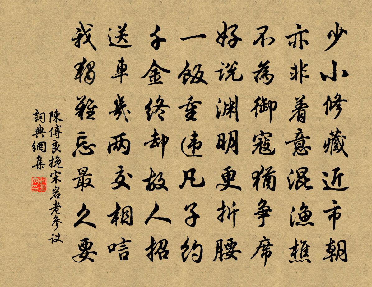 詩詞名句歷史字典書法欣賞書法字典國語詞典說文解字康熙字典古漢語字典標 題 作 者 詩 句 挽宋岩老參議作者:陳傅良 朝代:宋代挽宋岩老參議原文少小修藏近市朝,亦非著意混漁樵。不為禦寇猶爭席,好說淵明更折腰。一飯重違凡子約,千金終卻故人招。送車幾兩交相唁,我獨難忘最久要。詩詞問答問:挽宋岩老參議的作者是誰?答:陳傅良問:挽宋岩老參議寫於哪個朝代?答:宋代陳傅良挽宋岩老參議書法欣賞挽宋岩老參議書法作品詩詞推薦贈陳公益黃庭堅〔宋代〕陳子善學問,正色鉏其驕。束身居言前,析理在意標。心隨出處樂,性與寂寞超。安安而雅雅,不以行險徽。王良和張君春曉園黎廷瑞〔宋代〕知道芳菲只恁休,也應秉燭及春遊。來牛去馬乾坤老,舊燕新鴻歲月流。千里空勞芳草夢,一樽聊慰落花愁。桃源窊尊詩(在道州)元結〔唐代〕巉巉小山石,數峰對窊亭。窊石堪為樽,狀類不可名。巡迴數尺間,如見小蓬瀛。尊中酒初漲,始有島嶼生。豈無嘉泰二年恭上太皇太后尊號八首佚名〔宋代〕文物備矣,的略靖陳。龜瑞薦祉,坤行效珍。比皇之壽,翼帝以仁。和氣致祥,興物為春。句張迥〔唐代〕夜長燈影滅,天繞鶴聲孤。華陽巾陸龜蒙〔唐代〕蓮花峰下得佳名,雲褐相兼上鶴翎。須是古壇秋霽後,靜焚香炷禮寒星。郊居晚行呈章令四首趙蕃〔宋代〕淵明薪水憂兒子,玉川送米煩鄰僧。我今窮狀不可道,減憂得米憂年登。九日用淵明韻二首方回〔宋代〕淵明謝督郵,猶有金石交。故人篤古誼,未隨霜葉雕。把菊東籬下,氣與南山高。顏生忽至止,雙鳳鳴青霄。我誓寄鞏丈哭孫姜特立〔宋代〕情愛難纏曠士襟,俗緣那似道緣深。已知達識空諸幻,萬事從頭付醉吟。天封寺劉丹〔宋代〕桂旗芝蓋翳濃陰,嚴宇崢嶸枕柰林。蜺座有花和法雨,龍淵如鑑徹{左麥右夫}金。錫杖化去圓泉在,石志文昏亂後雜興陸游〔宋代〕曾合惜日短,別離愁夜長。人老愛吾廬,客歸悲故鄉。仲夏寄江南盧殷〔唐代〕五月行將近,三年客未回。夢成千里去,酒醒百憂來。晚暮時看槿,悲酸不食梅。空將白團扇,從寄復裴回。水龍吟馬需庵〔元代〕元龍豪氣消磨,鬢毛衰颯成何事。九衢烏帽,黃塵幾色,花前沉醉。落落情懷,悠悠歲月,欲歸無地。三年太晏,壬申年封州自正旦連雨至元宵不止城中泥淖沒鄭剛中〔宋代〕山城泥淖裹人家,雨腳連綿更似麻。元夜何妨燈數點,污渠合是有蓮花。偶書二首方回〔宋代〕一昨懸車後,蹉跎又五年。常書乞米帖,猶費買花錢。感舊許琮〔宋代〕捲簾新月在簾鉤,花氣同風過小樓。為憶昨宵燈下事,不將紅燭照梳頭。和張秘丞燈夕韻四首劉克莊〔宋代〕君侯談笑該能事,詩到元和字永和。五夜縱游聊與眾,一年更借不為多。牙旗此際留宵鑰,寶馬來春蹋曉珂。白髮湖口文天祥〔宋代〕江湖一都會,宇宙幾興亡。走馬蘆林外,買魚茅舍傍。南人撐快槳,北客坐危檣。江水交岷水,東流日夜長。無題舒岳祥〔宋代〕春風萬里虞姬草,夜月千村蜀帝花。已矣莫論如許事,菜畦黃蝶繞田家。滿庭芳 茶黃庭堅〔宋代〕北苑春風,方圭圓璧,萬里名動京關。碎身粉骨,功合上凌煙。尊俎風流戰勝,降春睡、開拓愁邊。纖纖捧,研膏名句推薦君不見,高堂明鏡悲白髮,朝如青絲暮成雪。李白《將進酒》 相恨不如潮有信,相思始覺海非深。白居易《浪淘沙·借問江潮與海水》 欲把西湖比西子,淡妝濃抹總相宜。蘇軾《飲湖上初晴後雨二首·其二》 日光寒兮草短,月色苦兮霜白。李華《弔古戰場文》 離恨恰如春草,更行更遠還生。李煜《清平樂·別來春半》 神女生涯原是夢,小姑居處本無郎。李商隱《無題·重幃深下莫愁堂》 白日光天兮無不曜,江左 一隅獨未照。魏收《魏書·列傳·卷四十四》 縱明月相思千里隔。夢咫尺。勤書尺。賀鑄《琴調相思引·送范殿監赴黃崗》 地下千年骨,誰為輔佐臣。戎昱《詠史 / 和蕃》 想今宵、也對新月,過輕寒、何處小橋。趙汝茪《戀繡衾·柳絲空有千萬條》