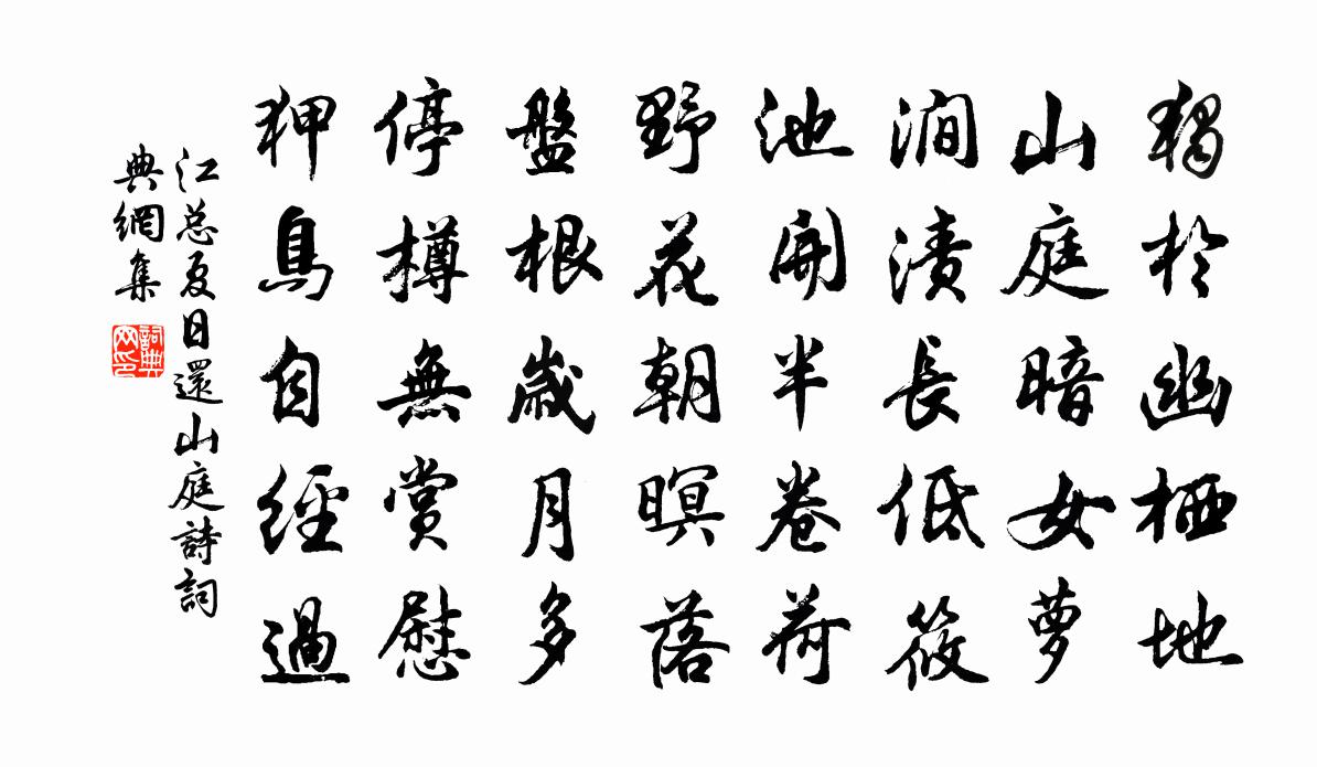 詩詞名句歷史字典書法欣賞書法字典國語詞典說文解字康熙字典古漢語字典標 題 作 者 詩 句 夏日還山庭詩作者:江總 朝代:隋代夏日還山庭詩原文獨於幽棲地。山庭暗女蘿。澗漬長低筱。池開半卷荷。野花朝暝落。盤根歲月多。停樽無賞慰。狎鳥自經過。詩詞問答問:夏日還山庭詩的作者是誰?答:江總問:夏日還山庭詩寫於哪個朝代?答:隋代江總夏日還山庭詩書法欣賞夏日還山庭詩書法作品詩詞推薦和冕仲觀試進進士黃庭堅〔宋代〕人圍廟垣重,鼓作宮漏曉。晨門傳放鑰,坌入荒庭秒。初如求木猿,稍若安巢鳥。黃爐答拜辱,月淡秋天杳。發題此游淡岩同成一詩敢用拜呈佚名〔宋代〕行盡蕭湘山復山,掣舟來叩淡岩關。幽深雖與塵寰隔,空闊猶容俗駕攀。是處名山有岩竇,莫如此地最寬閒。真人訪野老陸游〔宋代〕農事元知要細評,野人有舊得尋盟。林深未見果蔬地,舍近先聞雞犬聲。春水築塘謀竭作,陽坡臥犢約同耕。老來對酒王冕〔元代〕含笑看長劍,開懷對酒樽。江風生席面,山雨濕雲根。去國愁征戍,豐年荷聖恩。莫辭情爛漫,白首壯心存。立春內中帖子詞溫成皇后閣王珪〔唐代〕遙聞碧海有三山,雲鎖瓊樓日月間。花下玉顏常不老,也應春色勝人間。登南海驛樓汪廣洋〔明代〕海氣空濛日夜浮,山城才雨便成秋。馮唐頭白偏多感,倚遍天南百尺樓。雜詩吳大有〔宋代〕客行情最苦,草草共清尊。萬水千山路,今朝好出門。題玄潭觀雪浪閣用誠齋韻文天祥〔宋代〕棄官學道勾山許,學到至人本無怒。赤子(左角右戢)(左角右戢)如魚頭,不堪妖孽腥上流。鉗鍵長潭鐵樹立,木蘭花慢(重午)呂渭老〔宋代〕對修篁萬個,更疏雨、洗琅玕。望燕外晴絲,鷗邊水葉,胡蝶成團。榴紅勸人把酒,泛菖蒲、對客不成歡。金縷新雜詠六言八首劉克莊〔宋代〕上壽都來百歲,厚祿不過萬鍾。陋巷儒死廿九,灌園子辭三公。漫塘觀雪分韻得遠字劉宰〔宋代〕入臘甫目茲,得雪殊不晚。凝寒祛厲氣,積潤滋麥本。清興浩無極,步屐忘足蹇。扣門呼石交,頸縮語猶謇。挾攜目痛一月未愈自和前九首劉克莊〔宋代〕耄及歲不我與,眼空吾誰適從。蒙叟達觀鵬鷃},子云自視蛇龍。贈雪寶陳允平〔宋代〕一從說法雨華台,棕葉蕉花幾度開。春盡瀑泉猶濺雪,地幽篁竹亦生苔。臨溪洗缽青猿過,背石持經白鳥來。笑指始生七章章八句上皇子嘉王生辰陳傅良〔宋代〕生為帝子貴,本自歷數歸。歷屬萬億年,帝五壽無期。今夕果何夕,欲頌皆贅辭。但願王此心,無忘始生時。官舍歲暮感懷書事五首張耒〔宋代〕北風吹雁去翩翩,流滯周南又一年。田為歲荒陶令秫,酒無人乞廣文錢。香籠缽水清晨咒,坐暖 * 後夜禪。更謝寺院聽胡笳送李殷皎然〔唐代〕一奏胡笳客未停,野僧還欲廢禪聽。難將此意臨江別,無限春風葭菼青。春睡張玉孃〔宋代〕繡倦南窗下,條然睡思催。紅日過牆去,清風入幕來。幽夢迷莊蝶,荒雲隔楚台。覺來香縷在,虛室絕塵埃。悟本禪人求贊釋宗杲〔宋代〕一千七百痴衲子,圍繞這個無明叟。細膩常沒一星兒,粗糙卻有七八斗。未嘗寂寂入禪定,終日波波廊下走,為人玉撲花舒岳祥〔宋代〕花開壓逕枝堪挽,花落鋪階雪不飄。繭老蛾成投綠水,香乾蝶散了長條。滿地月明濃不掃,無人梅落怨難銷。老人三月八日百五節林敬輿攜酒約盛元仁戴帥初方方回〔宋代〕第五橋通曲港船,直搖春水到門前。休官久作漁竿客,扶老來尋鶴氅仙。疇曩歡娛如昨日,今吾衰颯最高年。舊墳名句推薦秋晚佳晨重物華,高台復帳駐鳴笳。宋祁《九日置酒》 家貧思良妻,國亂思良相。司馬光《資治通鑑·周紀·周紀一》 善處事者,但就是非可否,審定章程,而不必利於己。王永彬《圍爐夜話·第九則》 獻賦十年猶未遇,羞將白髮對華簪。錢起《贈闕下裴舍人》 姑蘇台上烏棲時,吳王宮裡醉西施。李白《烏棲曲》 祖宗疆土,當以死守,不可以尺寸與人。脫脫《宋史·列傳·卷一百一十七》 弄兒床前戲,看婦機中織鮑照《擬行路難·其六》 上馬擊狂胡,下馬草軍書。陸游《觀大散關圖有感》 耕夫召募愛樓船,春草青青萬項田;張繼《閭門即事》 謀先事則昌,事先謀則亡。劉向《說苑·談叢》