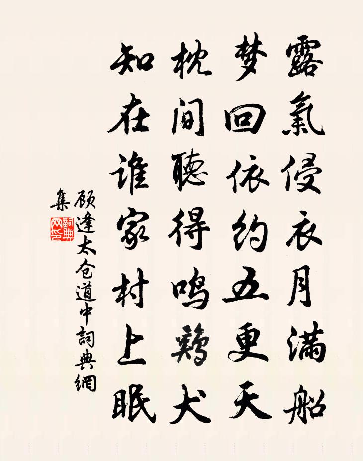 詩詞名句歷史字典書法欣賞書法字典國語詞典說文解字康熙字典古漢語字典標 題 作 者 詩 句 太倉道中作者:顧逢 朝代:宋代太倉道中原文露氣侵衣月滿船,夢回依約五更天。枕間聽得鳴雞犬,知在誰家村上眠。詩詞問答問:太倉道中的作者是誰?答:顧逢問:太倉道中寫於哪個朝代?答:宋代顧逢太倉道中書法欣賞太倉道中書法作品詩詞推薦同吳居安入開善四首出山劉子翬〔宋代〕日日冬氣昏,霜風不鐮面。回輿始見山,數點寒中現。我行得勝友,笑語生華絢。如何劍峰南,咫尺不常見。金鵝晚眺釋永頤〔宋代〕天低野曠樹濛濛,盡入金鵝望眼中。青嶂月生雙雁去,碧溪雲繞亂帆通。平稿落照沈煙墅,結陣寒鴉噪螟叢。歲月相和歌辭婕妤怨皇甫冉〔唐代〕由來詠團扇,今已值秋風。事逐時皆往,恩無日再中。早鴻聞上苑,寒露下深宮。顏色年年謝,相如賦豈工。江西壬辰秋大旱飢臨江守王幼學監簿極力救民戴復古〔宋代〕懇切金章奏,精誠玉帝知。稻粱民性命,豐歉國安危。苗秀方成實,雨來還及時。人能合天意,天亦順人為。內題賦得巫山雨(一作沈佺期詩。題雲巫山高)宋之問〔唐代〕神女向高唐,巫山下夕陽。裴回作行雨,婉戀逐荊王。電影江前落,雷聲峽外長。霽雲無處所,台館曉蒼蒼。剔銀燈(同公素賦,侑歌者以七急拍七拜勸酒)毛滂〔宋代〕簾下風光自足。春到席間屏曲。瑤瓮酥融,羽觴蟻鬧,花映酃湖寒綠。汨羅愁獨。又何似、紅圍翠簇。聚散悲歡箭雖然吟五首方回〔宋代〕桑柘陰陰間苧麻,店前下馬便斟茶。雖然此是尋常物,亂後空村沒一家。題劍灘陳宓〔宋代〕山在溪中水在山,人生何處鬼門關。數聲柔櫓風雷外,一葉輕舟劍戟間。為問片時驚陷溺,何如竟日緩躋攀。信知如夢令李清照〔宋代〕誰伴明窗獨坐,我共影兒倆個。燈盡欲眠時,影也把人拋躲。無那,無那,好個淒涼的我。望春亭侍游應詔杜審言〔唐代〕帝出明光殿,天臨太液池。堯樽隨步輦,舜樂繞行麾。萬壽禎祥獻,三春景物滋。小臣同酌海,歌頌答無為。試院書事呈子駿明叔三篇孔武仲〔宋代〕憶初懷詔下天街,紅燭相隨御史來。場屋喜遵新定格,朝廷思見已成材。誅鋤險異歸平坦,洗濯英華出草萊。文藻寒食雨三首仇遠〔宋代〕山色空濛寒食雨,楊花零亂溧陽樓。老人豈有傷春事,酒後情懷似感秋。新正二首張耒〔宋代〕新正閱月天苦陰,白日未照草木心。黃州城中人跡少,江濤涌洶山崎嶔。駕幸溫泉盧象〔唐代〕傳聞聖主幸新豐,清蹕鳴鑾出禁中。細草終朝隨步輦,垂楊幾處繞行宮。千官扈從驪山北,萬國來朝渭水東。此日貽王處士子文儲光羲〔唐代〕春草生洞渚,春風入上林。春皋有黃鶴,撫翮未揚音。王屋嘗嘉遁,伊川復陸沉。張弦鵾雞弄,閉室蓬蒿深。避地徐成之園亭三詠瑞香檻子孔武仲〔宋代〕異國攜來看愈新,移當樽俎會嘉賓。雖無絕艷驚流俗,為有清香得近人。燭下更宜觀態度,酒闌尤覺醒精神。湖南次韻王彥昭感秋三首張耒〔宋代〕年來詩酒最關身,滿酌休論薄與醇。愁見洛陽秋夜月,無情偏照不眠人。晚步追涼二首楊萬里〔宋代〕老眼偏明遠岫孤,夕陽故遣樹陰疏。蟬鳴葉底無尋處,隨意閒行偶見渠。關王祠李流謙〔宋代〕萬人傑誰可敵,千載名終不磨。此地晚鐘晨梵,生前鐵馬金弋。送王恭父倉部知洋州樓鑰〔宋代〕天清無雲秋氣明,好風叢桂傳芳馨。乃於此時送君行,江空目短難為情。蚤從兩川馳大名,眉宇瑩徹春壺冰。語輒名句推薦君子少思長,則學;老思死,則教;有思窮,則施也。荀子《荀子·法行》 有情風、萬里卷潮來,無情送潮歸。蘇軾《八聲甘州·寄參寥子》 貧士之腸習黎莧,富人之口厭膏梁。程登吉《幼學瓊林·卷三·貧富》 福無雙至,禍不單行。張南莊《何典·第三回》 寒英坐銷落,何用慰遠客。柳宗元《早梅》 日射紗窗風撼扉,香羅拭手春事違。李商隱《日射》 蟬鳴空桑林,八月蕭關道。王昌齡《塞下曲四首》 梧桐更兼細雨,到黃昏、點點滴滴。李清照《聲聲慢·尋尋覓覓》 斜月照簾帷,憶君和夢稀。毛熙震《菩薩蠻·梨花滿院飄香雪》 漢帝重阿嬌,貯之黃金屋。李白《妾薄命》