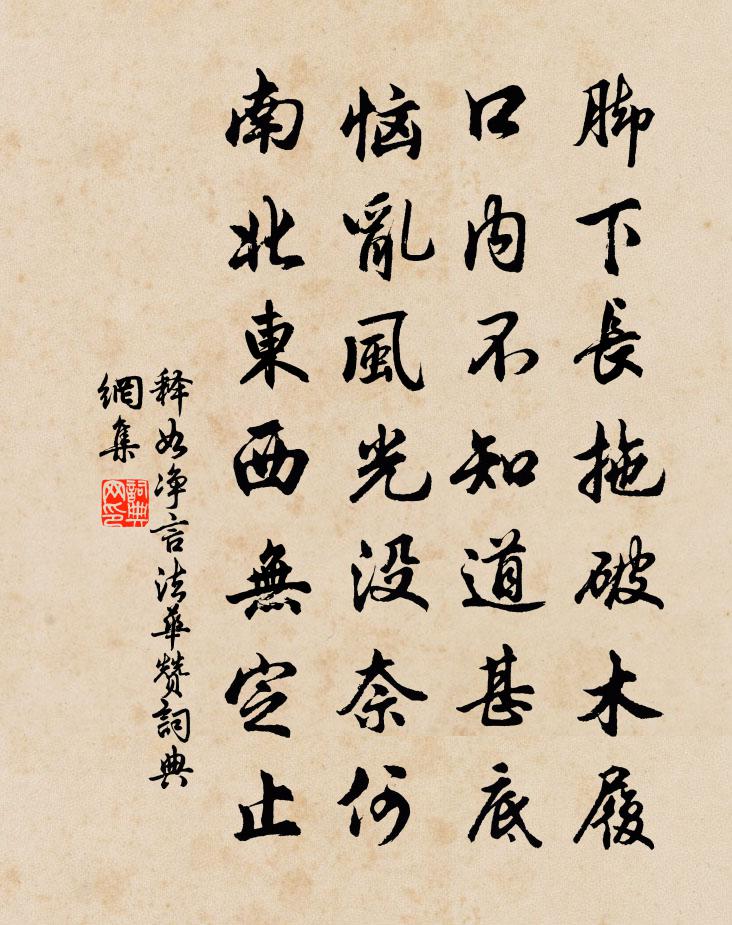 詩詞名句歷史字典書法欣賞書法字典國語詞典說文解字康熙字典古漢語字典標 題 作 者 詩 句 言法華贊作者:釋如淨 朝代:宋代言法華贊原文腳下長拖破木履,口內不知道甚底。惱亂風光沒奈何,南北東西無定止。詩詞問答問:言法華贊的作者是誰?答:釋如淨問:言法華贊寫於哪個朝代?答:宋代釋如淨言法華贊書法欣賞言法華贊書法作品詩詞推薦拜新月(一作李端詩)耿湋〔唐代〕開簾見新月,便即下階拜。細語人不聞,北風吹裙帶。句晏殊〔宋代〕已定復搖春水色,似紅如白野棠花。道游武夷遇雨既渡復回明日竟敢游九曲而行因李彌遜〔宋代〕渡口回舟未忍移,淨坊聽雨坐題詩。餘齡倘有尋真路,試與披雲問鳳兒。高侍郎詩佚名〔唐代〕危冠高袖楚宮妝,獨步閒庭逐夜涼。自把玉簪敲砌竹,清歌一曲月如霜。冬夜讀書陸游〔宋代〕退食淡無事,一窗寬有餘。重尋總角夢,卻對短檠書。功業雖蹉跌,光陰且破除。更須求半偈,回向此心初。落第西還別魏四懍陳子昂〔唐代〕轉蓬方不定,落羽自驚弦。山水一為別,歡娛復幾年。離亭暗風雨,征路入雲煙。還因北山徑,歸守東陂田。已亥雜詩 133龔自珍〔清代〕過江籍甚顏光祿,又作山中老樹看。賴是元龍樓百尺,雄談夜半鬥牛寒。題延平李氏宅陳宓〔宋代〕延平李氏廬,仙翁扁盤谷。虛堂納水石,蘭萱和修竹。距城才咫尺,作吏愧真俗。年餘始一到,賴有客如玉。螢王鎡〔宋代〕竹風吹動草根塵,熠熠高底自照身。每夜囊盛光到曉,書齋送輿少燈人。己已秋七月不雨人心焦然乃戊午齋宿致城隍清牟巘五〔宋代〕眼前物意頗昭蘇,未省郊原遍也無。更覓洗車三日雨,普教大地活焦枯。江樓陪范長官宴自警一篇戲呈鄭主簿林亦之〔宋代〕幾回過海上,此日暫躊躇。未盡尊前酒,還奔使者車。官人無少暇,賤子敢安居。一畝芭蕉圃,如今要自鋤。冷泉亭釋智圓〔宋代〕亭幽無俗狀,清景滌煩襟。砌壓寒流淺,簷分積翠深。晚花閒照影,古木冷垂陰。憑檻不能去,澄澄發靜吟。留題天樂寓張氏湖亭陳起〔宋代〕沉水香銷一局棋,客來淺酌旋分題。畫欄占得春多少,簾卷東風日未西。青杏兒劉處玄〔元代〕迷者似河沙。想世間、學者如麻。萬中敬信無一悟,觀今視古,浮生濁夢,個個都差。達了莫矜誇。訪洞天、閒臥見敏中初到邠寧秋日登城樓詩詩中頗多鄉思因以寄和白居易〔唐代〕想爾到邊頭,蕭條正值秋。二年貧御史,八月古邠州。絲管聞雖樂,風沙見亦愁。望鄉心若苦,不用數登樓。佛牙寺看桂因贈許秀才郭庭芝〔宋代〕何來仙女散天花,剩得余香伴佛牙。留取高枝青漢上,秋風吹送到君家。擷芳詞佚名〔宋代〕風搖盪,雨濛茸。翠條柔弱花頭重。春衫窄。香肌濕。記得年時,共伊曾摘。都如夢。何曾共。可憐孤似釵頭鳳。崇化寺三首張耒〔宋代〕樓殿沉沉鎖夜煙,秋燈一點佛龕前。梧桐葉上三更雨,亦有愁人獨自眠。玉泉施樞〔宋代〕水跡無增減,從知地有靈。群魚潛異窟,一芥納滄溟。濟隱新留詠,超師舊講經。聖時調玉燭,龍睡不須醒。右軍墨池劉言史〔唐代〕永嘉人事盡歸空,逸少遺居蔓草中。至今池水涵餘墨,猶共諸泉色不同。名句推薦斜月沉沉藏海霧,碣石瀟湘無限路。張若虛《春江花月夜》 盈盈一水間,脈脈不得語。佚名《迢迢牽牛星》 貧居往往無煙火,不獨明朝為子推。孟雲卿《寒食》 兒不嫌母醜,狗不嫌家貧。佚名《增廣賢文·下集》 瞻彼洛城郭,微子為哀傷。曹操《薤露行》 洛陽親友如相問,一片冰心在玉壺。王昌齡《芙蓉樓送辛漸》 嗚呼! 何時眼前突兀見此屋杜甫《茅屋為秋風所破歌》 意長翻恨遊絲短。盡日相思羅帶緩。嚴仁《玉樓春·春思》 萋萋芳草憶王孫。柳外樓高空斷魂。李重元《憶王孫·春詞》 夜雨做成秋,恰上心頭。納蘭性德《浪淘沙·夜雨做成秋》