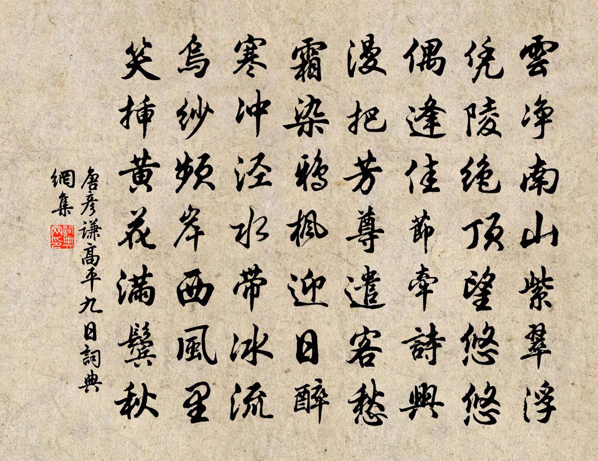 詩詞名句歷史字典書法欣賞書法字典國語詞典說文解字康熙字典古漢語字典標 題 作 者 詩 句 高平九日作者:唐彥謙 朝代:唐代高平九日原文雲淨南山紫翠浮,憑陵絕頂望悠悠。偶逢佳節牽詩興,漫把芳尊遣客愁。霜染鴉楓迎日醉,寒沖涇水帶冰流。烏紗頻岸西風裡,笑插黃花滿鬢秋。詩詞問答問:高平九日的作者是誰?答:唐彥謙問:高平九日寫於哪個朝代?答:唐代問:高平九日是什麼體裁?答:七律唐彥謙高平九日書法欣賞高平九日書法作品注釋全唐詩:卷671-60詩詞推薦浪淘沙劉禹錫〔唐代〕日照澄州江霧開,淘金女伴滿江隈。美人首飾侯王印,儘是沙中浪底來。採桑子王哲〔元代〕曹溪一路人難悟,怎舍妍妻。難受孤ω。獨自眠時越越迷。分明有個長生路,孰是能躋。說甚東西。誰肯抽身出污初夏雜興陸游〔宋代〕避寂諸緣息,安貧百慮寬。嬾如常抱疾,退似本無官。皎潔鶴翎扇,嵯峨龜屋冠。何勞問唐舉,徹屋是清寒。皇太子生辰詩三首馬廷鸞〔宋代〕蒼龍見天東,房駟拱辰北。煌煌心星前,炳炳天王側。休符協乾文,正陽毓紫極。銅樓藹祥光,玉卮奉愉色。嘆聲送廣帥秩滿之官丹陽二首楊萬里〔宋代〕北門臥護要耆英,小試胸中十萬兵。天借金山吟落月,身兼鐵瓮作長城。何如嶺上因歸路,摘取梅酸去作羹。已有尋詩方岳〔宋代〕蹇驢踏雪灞橋春,畫出茅茨野水濱。才見梅花詩便好,梅花卻是定詩人。三高祠姜夔〔宋代〕不貪名爵伐功功,勇退深虞禍患遭。甫里閒居耕釣樂,范張高處陸猶高。光祿庵二首蘇軾〔宋代〕文章恨不見文園,禮樂方將訪石泉。何事庵中著光祿,枉教閒處筆如椽。城中太守的何人,林下先生非我身。若向師廷珍以詩見惠因用其韻晁公溯〔宋代〕欲平靺鞨與堅昆,下詔旁求辟四門。吾子莫孤明主意,建隆開國聖雲孫。頌古一○一首釋子淳〔宋代〕金烏玉兔兩交馳,照破威音未淨時。若謂青霄別有路,木人依舊皴雙眉。垂釣白居易〔唐代〕臨水一長嘯,忽思十年初。三登甲乙第,一入承明廬。浮生多變化,外事有盈虛。今來伴江叟,沙頭坐釣魚。句胡仔〔宋代〕話盡春愁雙紫燕,喚回午夢一黃鸝。夜遊宮方千里〔宋代〕一帶垂楊蘸水。映芳草、萋萋千里。跋馬回堤少年子。擁青娥,向紅樓,南酒市。拼飲鶯花底。恣歡笑、粉融香墜登千福寺楚金禪師法華院多寶塔岑參〔唐代〕多寶滅已久,蓮華付吾師。寶塔凌太空,忽如湧出時。數年功不成,一志堅自持。明主親夢見,世人今始知。千家關口逢徐邁盧綸〔唐代〕廢寺連荒壘,那知見子真。關城夜有雪,冰渡曉無人。酒里唯多病,山中願作鄰。常聞兄弟樂,誰肯信家貧。夏五即事二首白玉蟾〔宋代〕曉來掠面更東風,過盡溪山屬祝融。楊柳引教荷芰綠,海棠讓與石榴紅。稻針刺水連青畝,麥浪翻雲漲碧空。我有武岡向權叔家有陳魏祠堂合祀簡齋鶴山惟兩公陳杰〔宋代〕簡齋以詩冠兩都,鶴山以文擅江東。茲溪僻在萬山底,遼絕安能來兩公。或撞天關忤九虎,或走窮海隨六龍。畏途十二月旦雪霰大縶張嵲〔宋代〕憶昔尋梅漢水旁,故乘微霰渡澄江。如今飄泊閩山側,擁褐安禪聽打窗。某近與和叔游景愛之不足因吟短篇以贈強至〔宋代〕夫子南州傑,相逢出肺肝。平生潛聖閫,壯歲尚儒冠。鴟鷃霄垠擊,蛟龍井底蟠。恥將孤憤劍,容易向 * 。減字木蘭花佚名〔宋代〕春融酒困。一寸橫波千里恨。著處芳菲。蝶與鶯情醉自迷。敧雲妥翠。冷落金屏山十二。低抱琵琶。月向黃昏日又名句推薦回日樓台非甲帳,去時冠劍是丁年溫庭筠《蘇武廟》 桂魄初生秋露微,輕羅已薄未更衣。王維《秋夜曲》 三千年事殘鴉外,無言倦憑秋樹。吳文英《齊天樂·與馮深居登禹陵》 傷身事莫做,傷心話莫說。佚名《增廣賢文·下集》 不是誠齋無月,隔一林修竹。楊萬里《好事近·七月十三日夜登萬花川谷望月作》 綠陰青子老溪橋。羞見東鄰嬌小。吳文英《西江月·賦瑤圃青梅枝上晚花》 半卷紅旗臨易水,霜重鼓寒聲不起。李賀《雁門太守行》 美人慵翦上元燈,彈淚倚瑤瑟。朱敦儒《好事近·春雨細如塵》 君馬黃,我馬白。李白《君馬黃》 所謂壹刑者,刑無等級。商鞅《商君書·賞刑》