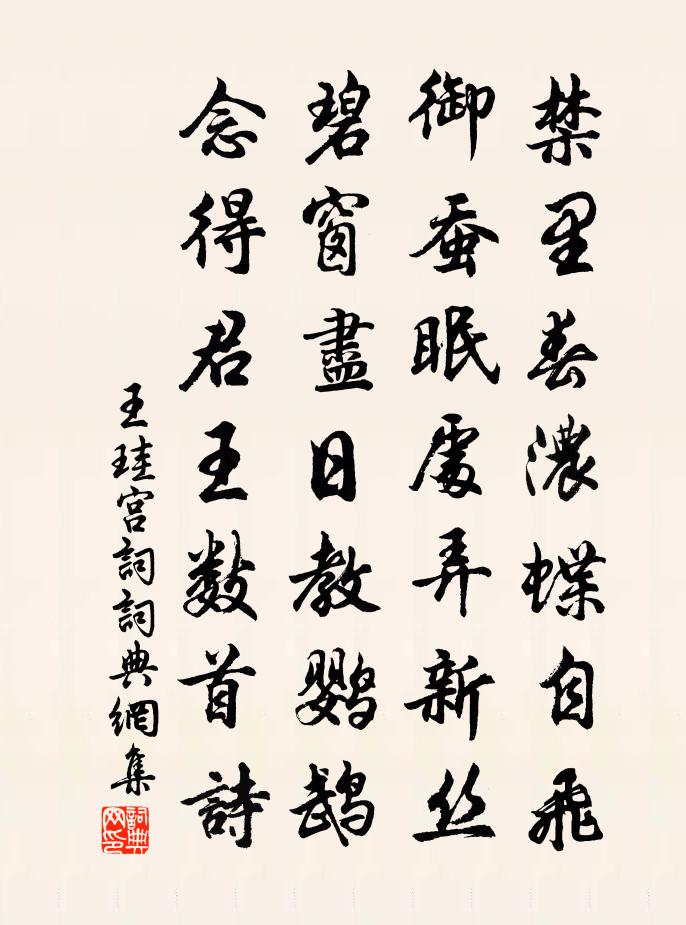 詩詞名句歷史字典書法欣賞書法字典國語詞典說文解字康熙字典古漢語字典標 題 作 者 詩 句 宮詞作者:王珪 朝代:唐代宮詞原文禁里春濃蝶自飛,御蠶眠處弄新絲。碧窗盡日教鸚鵡,念得君王數首詩。詩詞問答問:宮詞的作者是誰?答:王珪問:宮詞寫於哪個朝代?答:唐代王珪宮詞書法欣賞宮詞書法作品詩詞推薦送無懷道士游富春山水(一作送別吳逸士歸山)孟郊〔唐代〕造化絕高處,富春獨多觀。山濃翠滴灑,水折珠摧殘。溪鏡不隱發,樹衣長遇寒。風猿虛空飛,月狖叫嘯酸。信此偈頌七十六首釋師範〔宋代〕擾擾匆匆,晨雞暮鍾。瑞岩不會,喚主人翁。自遣李白〔唐代〕對酒不覺暝,落花盈我衣。醉起步溪月,鳥還人亦稀。道中劉子翬〔宋代〕微風收宿靄,細路繞平皋。石亂春溪急,山寒曉月高。鳥聲時出樹,花氣欲侵袍。行役兼清賞,驅馳未覺勞。歐陽少師令賦所蓄石屏蘇軾〔宋代〕何人遺公石屏風,上有水墨希微蹤。不畫長林與巨植,獨畫峨嵋山西雪嶺上萬歲不老之孤松。崖崩澗絕可望不可到秋思陸游〔宋代〕露濃壓架葡萄熟,日嫩登場罷亞香。商略人生如意事,及身強健得還鄉。達哉樂天行(一作健哉樂天行)白居易〔唐代〕達哉達哉白樂天,分司東都十三年。七旬才滿冠已掛,半祿未及車先懸。或伴遊客春行樂,或隨山僧夜坐禪。二年宮詞王仲修〔宋代〕雲羅霧谷曉風涼,繡幕黃龍繞畫廊。宿雨乍收煙水靜,曲池萬柄綠荷香。乙巳三月出湖口占鄭清之〔宋代〕幾朝花片落書奩,未信春光已屬厭。猛省清明今日是,家家青柳壓朱檐。甲辰臘日遣興蔣恢〔宋代〕臘里春前日日陰,西疇彌覺水雲深。梅邊句好無人覓,竹外煙輕有鳥吟。發興合窮千里目,著書聊寄百年心。翻雲訪李生野墅宋祁〔宋代〕風物澹蕭辰,陵阿訪隱淪。野槓裁度馬,溪路劣生塵。認菊知陶宅,觀禾識魯囷。林皋偏樂我,魚鳥似留人。山霽頌古十九首釋法全〔宋代〕幾回沾水又拖泥,年老心孤不自知。遊子不歸空悵望,一溪流水落花隨。古寺釋文珦〔宋代〕古寺居深處,隨緣掃一房。本圖依水石,因得避炎涼。皓鶴巢松潔,青蟲蠹橘香。但教終遠俗,貧賤亦何妨。書喜陸游〔宋代〕十月東吳草未枯,村村耕牧可成圖。歲收儉薄雖中熟,民得蠲除已小蘇。家塾競延師教子,里門罕見吏徵租。老昏探春令趙長卿〔宋代〕冰澌池面。柳搖金線,春光無限。問梅花底事,收香藏蕊,到此方舒展。百花頭上俱休管。且驚開俗眼。看綠陰結仲春晚尋覆釜山錢起〔唐代〕蝴蝶弄和風,飛花不知晚。王孫尋芳草,步步忘路遠。況我愛青山,涉趣皆游踐。縈迴必中路,陰晦陽復顯。古岸征婦詞十首劉克莊〔宋代〕詩云王赫怒,吏說相宣威。假使從公旦,三年便袞歸。西江月(泛舟)曹冠〔宋代〕一派彎溪曲港,兩山松乾檉蘿。尋幽乘興泛煙波。時見白鷗飛過。炫日浪紋金影,連雲岸草青莎。陶然一醉養天和登城有作杜荀鶴〔唐代〕上得孤城向晚春,眼前何事不傷神。遍看原上累累冢,曾是城中汲汲人。盡謂黃金堪潤屋,誰思荒骨旋成塵?一名寄當塗李遠許渾〔唐代〕賦擬相如詩似陶,雲陽煙月又同袍。車前驥病駑駘逸,架上鷹閒鳥雀高。舊日樂貧能飲水,他時隨俗願餔糟。不須名句推薦催成清淚,驚殘孤夢,又揀深枝飛去。陸游《鵲橋仙·夜聞杜鵑》 馬先馴而後求良,人先信而後求能。劉安及其門客《淮南子·說林訓》 將軍玉帳貂鼠衣,手持酒杯看雪飛。劉基《北風行》 首夏猶清和,芳草亦未歇。謝靈運《游赤石進帆海》 花片片飛風弄蝶,柳陰陰下水平橋。張先《浣溪沙·樓倚春江百尺高》 佳節清明桃李笑,野田荒冢只生愁。黃庭堅《清明》 譽人不增其美。王充《論衡·卷八·藝增篇》 棘枝風哭酸,桐葉霜顏高。孟郊《秋懷十五首》 葉落風不起,山空花自紅。陳師道《妾薄命·為曾南豐作》 他鄉生白髮,舊國見青山。司空曙《賊平後送人北歸》