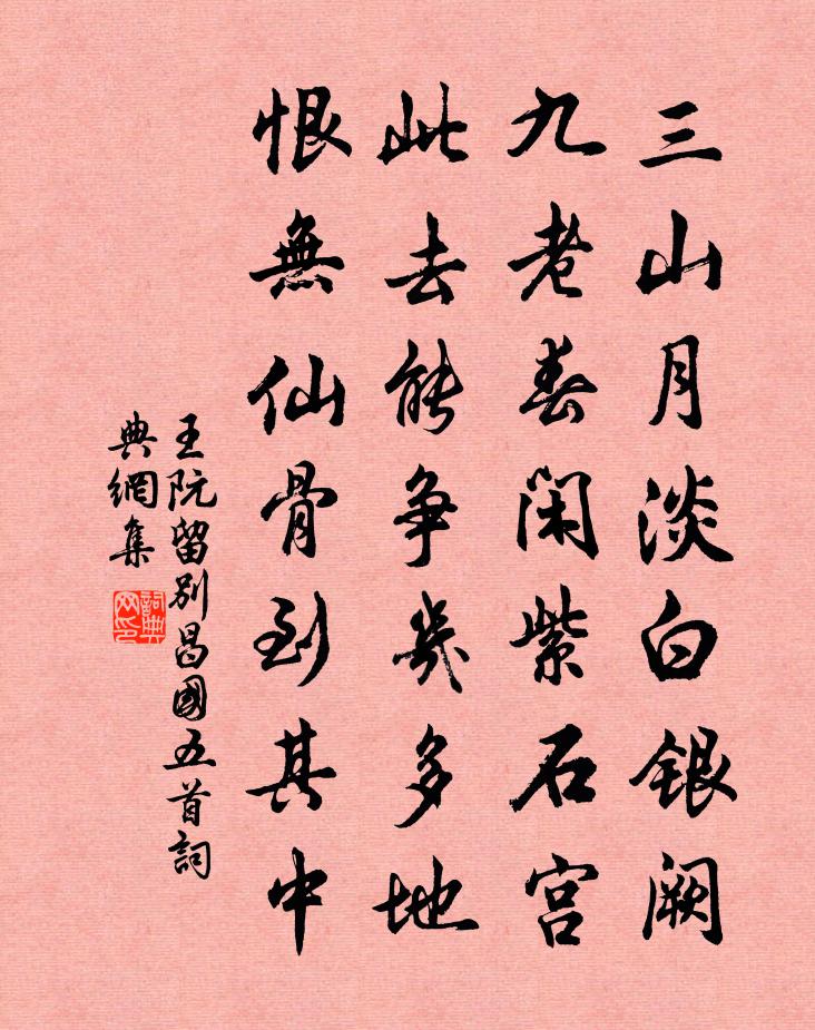 詩詞名句歷史字典書法欣賞書法字典國語詞典說文解字康熙字典古漢語字典標 題 作 者 詩 句 留別昌國五首作者:王阮 朝代:宋代留別昌國五首原文三山月淡白銀闕,九老春閒紫石宮。此去能爭幾多地,恨無仙骨到其中。詩詞問答問:留別昌國五首的作者是誰?答:王阮問:留別昌國五首寫於哪個朝代?答:宋代王阮留別昌國五首書法欣賞留別昌國五首書法作品詩詞推薦望江南·幽州九日汪元量〔宋代〕官舍悄,坐到月西斜。永夜角聲悲自語,客心愁破正思家。南北各天涯。腸斷裂,搔首一長嗟。綺席象床寒玉枕,端午日楊時〔宋代〕悠悠南北各天涯,欲望鄉關眼已花。憶得親庭誰共語,應憐遊子未還家。梅洪咨夔〔宋代〕竹屋茅檐一樹斜,冰霜意氣蓋韶華。有餘不盡如知道,半已青青半尚花。寄題朱元晦武夷精舍陸游〔宋代〕先生結屋綠岩邊,讀易懸知屢絕編。不用采芝驚世俗,恐人謗道是神僊。長老鳳師新作四照亭以其環顧洞徹無纖翳礙目強至〔宋代〕大士安禪外,孤亭曠望中。物無形可遁,心與境俱通。日月光應倍,江山氣更雄。寧須面壁坐,到此即觀空。五日東宮賜酒肴任希夷〔宋代〕重來六泛菖蒲酒,儲禁黃封歲歲攽。遙想三宮天上宴,肯分餘瀝到人間。丹青引贈曹將軍霸 / 丹青引贈曹霸將軍杜甫〔唐代〕將軍魏武之子孫,於今為庶為清門。英雄割據雖已矣,文彩風流猶尚存。學書初學衛夫人,但恨無過王右軍。丹青四日汎舟馬家園宋祁〔宋代〕淺蒲垂蔓兩厓深,閒刺煙篙到碧潯。會待乘春留禊帖,茂林脩竹似山陰。賈師憲望海樓成次韻陳宜中〔宋代〕功歸再造金甌好,歲已三登玉燭調。昨日倚筇平地看,一如石壁望松寥。游嶽麓宮抱黃洞廖行之〔宋代〕長沙不足容迴旋,放腳直到清虛天。層雲盪胸意矯矯,皓月入袖情娟娟。扶搖浩蕩九萬里,城郭仿佛三千年。仙期山中即事李曾伯〔宋代〕手挼岩菊嗅寒香,陡覺輕飈透薄裳。自是蒼官添老色,不因青女眩寒妝。新篘未熟啜茶去,晚稻才收種麥忙。原學緣識宋太宗〔宋代〕靈無知大道,極意思悠然。摩日雲中雁,瀟湘水似天。孤峰高遠近,寶月瑩團圓。信解明開悟,青霄在目前。浩嘆宋庠〔宋代〕鼻濁哀吟倦,空懷浩嘆盈。心同注鉤怯,功比畫墁輕。俗態驚狙怒,剛腸謝鶩爭。淹回江外客,日夕望堯旍。次韻和王敏仲望祝融峰四首孔武仲〔宋代〕僧居曉看一峰青,迥絕織塵點畫屏。會有片雲來觸石,江湖三日雨冥冥。和平甫招道光法師王安石〔宋代〕鏈師投老演真乘,像劫空王爪與肱。於總持門通一路,以光明藏續千燈。從容發口酬摩詰,邂逅持心契慧能。新句玉繡球花董嗣杲〔宋代〕潔身自擁翠枝寒,遺得春魂寄素顏。夜月曳光凝絕徑,晚風拋影入空關。幾團白雲能嬌膩,五色流蘇只等閒。宛似晚霽趙蕃〔宋代〕雨歇蟬聲抱木悲,茅檐獨立看雲移。一陰十日不見月,想見清光分外奇。獨酌權德輿〔唐代〕獨酌復獨酌,滿盞流霞色。身外皆虛名,酒中有全德。風清與月朗,對此情何極。客中作牟融〔唐代〕異鄉歲晚悵離懷,遊子驅馳愧不才。夜夜砧聲催客去,年年雁影帶寒來。半林殘葉迎霜落,三徑黃花近節開。幾度雜詩五首曾鞏〔宋代〕妯仕任固小,會計未可失。方今備千品,內外有卑秩。孰當責在己,施設能自必。拘文已難騁,避世固多屈。細雲名句推薦人有所不忍,而後能及其所忍;有所不為,而後可以有為。張廷玉《明史·列傳·卷一百零四》 乘我大宛馬,撫我繁弱弓。張華《壯士篇》 提籠忘采葉,昨夜夢漁陽。張仲素《春閨思》 雁啼紅葉天,人醉黃花地,芭蕉雨聲秋夢裡。張可久《清江引·秋懷》 花枝出建章,鳳管發昭陽。皇甫冉《婕妤怨》 江間波浪兼天涌,塞上風雲接地陰。杜甫《秋興八首·其一》 天馬徠,龍之媒,游閶闔,觀玉台。劉徹《天馬二首·其二》 昔在零陵厭,神器若無依。何遜《行經孫氏陵》 萬里平湖秋色冷,星辰垂影參然。牛希濟《臨江仙·洞庭波浪颭晴天》 危樓高百尺,手可摘星辰。李白《夜宿山寺》
