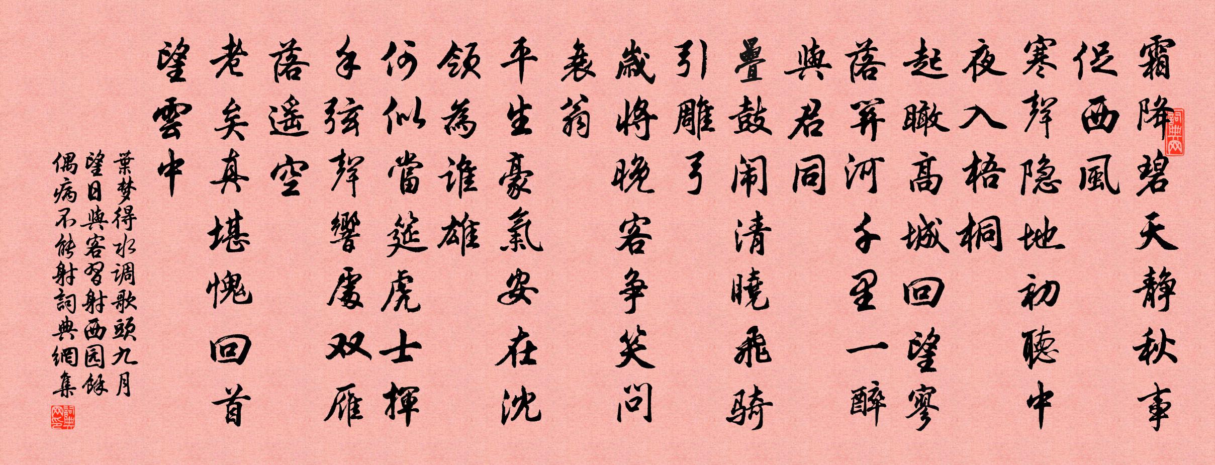 九月十五日,賓客們在西園練習射箭,我卻因病不能練習,客人明顯可以取勝。岳德將領,弓的力量比二石五斗還要多,仍能三發連中,觀看的賓客都很吃驚。因此寫下此詞展示給賓客,前一天晚上還是大風,第二天就開始寒冷了。