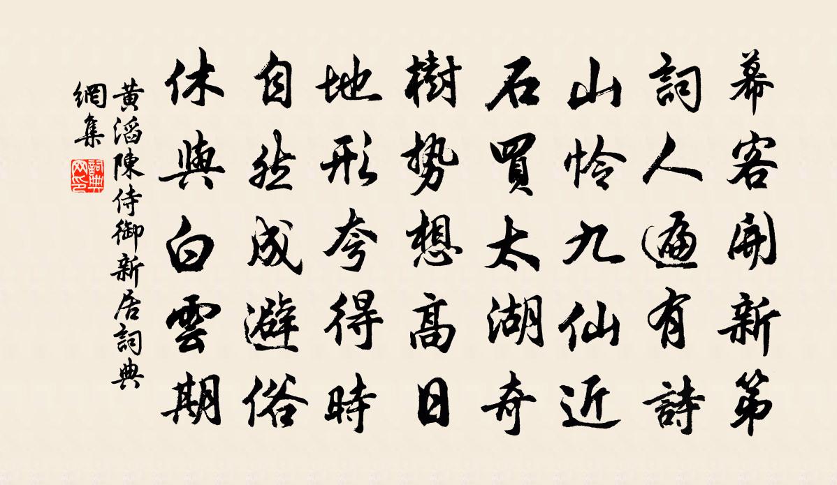詩詞名句歷史字典書法欣賞書法字典國語詞典說文解字康熙字典古漢語字典標 題 作 者 詩 句 陳侍御新居作者:黃滔 朝代:唐代陳侍御新居原文幕客開新第,詞人遍有詩。山憐九仙近,石買太湖奇。樹勢想高日,地形誇得時。自然成避俗,休與白雲期。詩詞問答問:陳侍御新居的作者是誰?答:黃滔問:陳侍御新居寫於哪個朝代?答:唐代問:陳侍御新居是什麼體裁?答:五律黃滔陳侍御新居書法欣賞陳侍御新居書法作品注釋全唐詩:卷704-36詩詞推薦挽徐左史薛師石〔宋代〕左史聲名空復存,如今往事不堪論。惟應指佞當前陛,已判身歸老故園。驄馬引喪寒有淚,麒麟臥冢寂無言。人生題友人湘行稿連文鳳〔宋代〕詩史久不作,此游清興長。看山到湘水,隨雁過衡陽。醉裹關河在,吟余草木香。九歌流落年,想為一沾裳。雪劉子翬〔宋代〕晚天冥漠霰初飛,皓皓出顏復水湄。莫遣瑤林生染污,卻憂雲路隱巇危。寒侵夜褐樽前覺,春入晴檐枕上知。憶得送東光呂少府之官連帥奏授竇牟〔唐代〕遠愛東光縣,平臨若木津。一城先見日,百里早驚春。德禮邀才重,恩輝拜命新。幾時裁尺素,滄海有枯鱗。中秋方岳〔宋代〕曉入雲堂已起單,病留法喜太無端。當塗月擬中秋見,建鄴水仍江上寒。與世不供三笑別,暮年轉覺四並難。鸕鶿送達州先上人釋普度〔宋代〕吾道從來沒正偏,就中達者便為先。花前一笑即回首,此去西川路八千。開府潞公太師得謝西歸謹賦七言四韻詩五首拜蘇頌〔宋代〕官崇真是帝王師,八十歸休亦未遲。不似孔光辭位日,早於姜望出封時。儀形昔已圖麟閣,稿草今應集鳳池。故府舟次廣陵懷寄京都交舊賀鑄〔宋代〕朋游冠蓋滿京華,病客東流跡自賒。音驛未聞來日下,鄰牆不見亦天涯。尚慙斗粟煩官廩,已指扁舟是我家。莫謂雨晴見山陳宓〔宋代〕經旬不見嶙峋面,雨施雲行到九州。春政已成無一事,卻扶紅日翠峰頭。游金精山胡平仲〔宋代〕人去壇空幾歷年,塵埃難沒漢山川。竇門深入壺中地,環壁遙開瓮外天。致雨土龍如解化,隨時木鶴亦能仙。要知寄裴施州(裴冕坐李輔國貶施州刺史)杜甫〔唐代〕廊廟之具裴施州,宿昔一逢無此流。金鐘大鏞在東序,冰壺玉衡懸清秋。自從相遇感多病,三歲為客寬邊愁。堯有蝶戀花(春殘)趙長卿〔宋代〕綠盡燒痕芳草遍。不暖不寒,切莫辜良宴。罨畫屏風開羽扇。薄羅衫子仙衣練。晚雨小池添水面。戲躍赬鱗,又向荊門秋日寄友人齊己〔唐代〕青溪知不遠,白首要難歸。空想煙雲里,春風鸞鶴飛。誰論傳法偈,自補坐禪衣。未謝侯門去,尋常即掩扉。竹樓鑰〔宋代〕蟄宮驚起兩龍角,蛟室未呈雙水犀。同本君為分魯衛,清風應不愧夷齊。送師相陳大觀文喻良能〔宋代〕頻年秋稔穀相因,八郡恩波著處勻。長樂城中家幾萬,家家生子總名陳。食淡戴表元〔宋代〕世亂謀生拙,村深食淡能。沙蔬羹白煮,山稻飯紅蒸。暑豉方傳友,寒糟共學僧。庖廚尚如此,未嘆室生冰。探芳訊(湖上春遊,繼草窗韻)李彭老〔宋代〕對芳晝。甚怕冷添衣,傷春疏酒。正緋桃如火,相看自依舊。閒簾深掩梨花雨,誰問東陽瘦。幾多時,漲綠鶯枝,鄞中送坦上人歸故里釋文珦〔宋代〕白雲相見初,而子獨知予。世態易翻覆,道交難間疏。三江同遠棹,此日晚離袪。莫放音書絕,東來有鯉魚。梨李復〔宋代〕柿垂黃尚微,棗熟赤可剝。新梨接亦成,實大何磊落。累累如碧罌,器宇極恢廊。懸枝細恐折,植竹仰撐托。露下靈隱蓮峰堂孫雄飛〔宋代〕堂開金 * ,梵客為鉤簾。山影碧侵座,水聲清繞檐。粉雲埋石腳,珠露泣松髯。終擬攜孤笛,憑欄喚玉蟾。名句推薦衰蘭送客鹹陽道,天若有情天亦老。李賀《金銅仙人辭漢歌》 七夕今宵看碧霄,牽牛織女渡河橋。林傑《乞巧》 泛菊杯深,吹梅角遠,同在京城。劉過《柳梢青·送盧梅坡》 回雁峰前路,煙樹正蒼蒼葛長庚《水調歌頭·江上春山遠》 枕上十年事,江南二老憂,都到心頭。徐再思《水仙子·夜雨》 秋色漸將晚,霜信報黃花。葉夢得《水調歌頭·秋色漸將晚》 萬里橋西一草堂,百花潭水即滄浪。杜甫《狂夫》 料得年年腸斷處,明月夜,短松岡。蘇軾《江城子·乙卯正月二十日夜記夢》 柳葉隨歌皺,梨花與淚傾。黃庭堅《南歌子·槐綠低窗暗》 士不以利移、不為患改。劉向《說苑·談叢》
