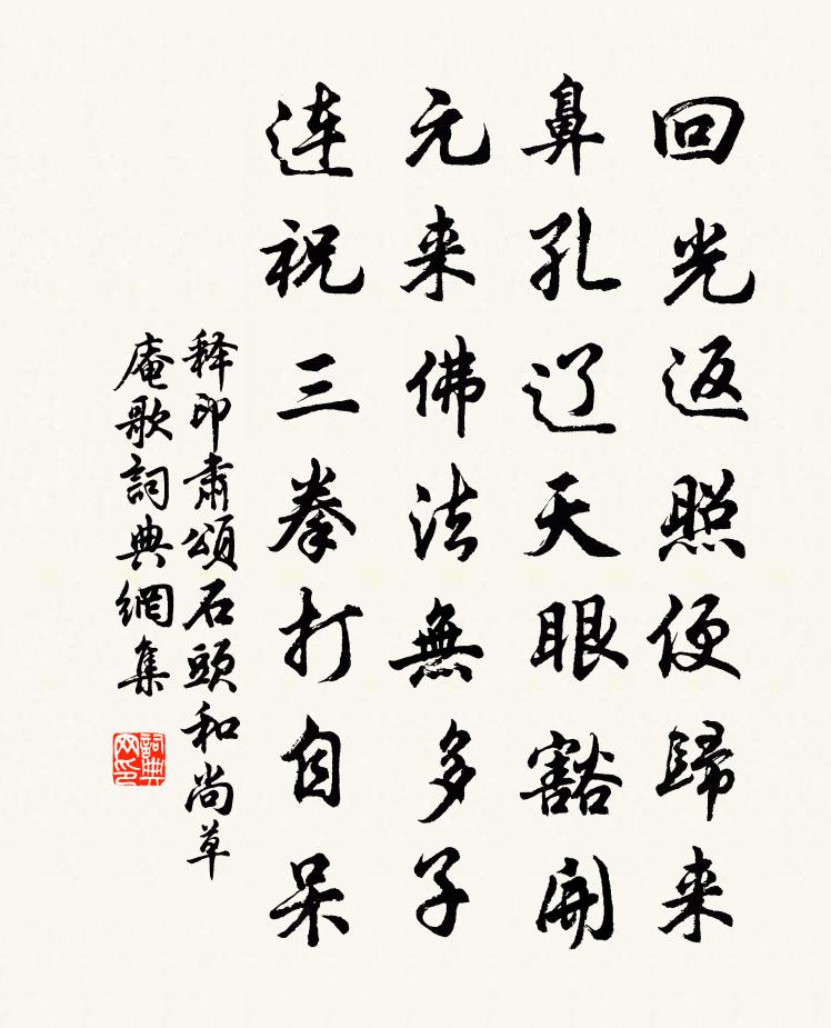 詩詞名句歷史字典書法欣賞書法字典國語詞典說文解字康熙字典古漢語字典標 題 作 者 詩 句 頌石頭和尚草庵歌作者:釋印肅 朝代:宋代頌石頭和尚草庵歌原文迴光返照便歸來,鼻孔遼天眼豁開。元來佛法無多子,連祝三拳打自呆。詩詞問答問:頌石頭和尚草庵歌的作者是誰?答:釋印肅問:頌石頭和尚草庵歌寫於哪個朝代?答:宋代釋印肅頌石頭和尚草庵歌書法欣賞頌石頭和尚草庵歌書法作品詩詞推薦謝劉仲寬惠茶家鉉翁〔宋代〕憶昨中原全盛時,五方貢茶走京師。建溪頭綱最先到,天子特命開經闈。儒臣講畢上命坐,瀹茗初試瓊甌瓷。雲章題四止庵艾性夫〔宋代〕本無食肉相,每飯甘藜羹。侯鯖豈不佳,怯怯疑生兵。還至呈興春事已過綠陰木森然小圃可愛摘青梅龐謙孺〔宋代〕為客清霜重,歸來夏木蒼。雞鵝驚甚大,童稚覺微長。花絮今無跡,園林未肯荒。青梅應可摘,臘摘要開嘗。朝中措朱敦儒〔宋代〕胸中塵士久無奇。今夕借清輝。歌縱群英諸彥,舞狂蕙帶荷衣。鴛鴦湖上,波平岸遠,酒釅魚肥。好是中秋圓月,岳陽樓別竇司直韓愈〔唐代〕洞庭九州間,厥大誰與讓。南匯群崖水,北注何奔放。瀦為七百里,吞納各殊狀。自古澄不清,環混無歸向。炎風題崔行先石室別墅鄭巢〔唐代〕山空水繞籬,幾日此棲遲。採菊頻秋醉,留僧擬夜棋。桂陰生野菌,石縫結寒澌。更喜連幽洞,唯君與我知。送格堯臣宋祁〔宋代〕祖帟都門路,秋風滿客衣。台舟三鷁駛,官舄兩鳧飛。鄉思臨波遠,離憂傍酒微。不應緣事事,手自廢談圍。茅舍元稹〔唐代〕楚俗不理居,居人盡茅舍。茅苫竹梁棟,茅疏竹仍罅。邊緣堤岸斜,詰屈檐楹亞。籬落不蔽肩,街衢不容駕。南風謝二吳書見訪王遂〔宋代〕緇衣之後賦無衣,王室安知晉鄭依。淝水八千思偃伯,丹徙十萬盡忘飢。喜看猿鶴從公樂,更覺蓴鱸到處肥。泉楮浣溪沙楊 * 〔宋代〕芳蕊鬅鬆夾道垂。珠幢玉節下瑤池。異香團就小花兒。應念裴航佳句好,休論白傅送行悲。月娥親自送仙衣。藍田溪雜詠二十二首古藤錢起〔唐代〕引蔓出雲樹,垂綸覆巢鶴。幽人對酒時,苔上閒花落。古意蘇軾〔宋代〕兒童鞭笞學官府,翁憐兒痴旁笑侮。翁出坐曹鞭復呵,賢於群兒能幾何。兒曹鞭人以為戲,公怒鞭人血流地。等為頌古九十八首釋印肅〔宋代〕臨事全提少作家,雲堂徒自臥煙霞。趙州一塞無餘欠,萬古彌堅應落花。鳳凰台二首黎廷瑞〔宋代〕三山二水年年在,向日浮雲處處多。醉拍欄桿呼李白,東風吹雨下新河。【雙調】沽美酒過太平令佚名〔元代〕花奴將羯鼓催,寧王把玉笛吹。御手親將桐樹擊,鄭觀音琵琶韻美,簇捧定個太真妃。丹臉上胭脂勻膩,翠盤中采禪人並化主寫真求贊釋正覺〔宋代〕白髮蒼顏,三篾住山。開眼不覺曉,靜坐不知閒。善應全機用,靈明入道環。而今相伴塵中去,榆葉青錢莫我慳。浣溪沙程大昌〔宋代〕獸炭香紅漫應時。遮寒姝麗自成圍。銷金暖帳四邊垂。報導黑風飛柳絮,齊翻白雪侑羔卮。那家斟唱□□詞。記蕭大山父子樂雷發〔宋代〕仙桂靈椿各典刑,飄飄姿韻激天鯨。家傳八葉鹽梅種,詩接三蘇父子名。四海盡將看縣譜,一堂那許與文盟。塵埃游臨丞輓詩魏了翁〔宋代〕冰至人猶玩,波頹力不支。搖搖路旁梗,炯炯日中葵。學道長身健,憂時兩鬢絲。竟搖天老眼,畀以寧馨兒。同君俞、季永步至普濟寺,晚泛西湖以歸,得楊萬里〔宋代〕曲曲都城繚翠微,鱗鱗湖浪動斜暉。天寒日暮遊人少,兩岸輕舟星散歸。名句推薦黃山僅見其腳,惜未一瞻面目。沈復《浮生六記·浪遊記快》 一上一上又一上,一上直到高山上。唐寅《登山詩》 燕支長寒雪作花,蛾眉憔悴沒胡沙。李白《王昭君二首》 江山故宅空文藻,雲雨荒台豈夢思。杜甫《詠懷古蹟五首·其二》 年年躍馬長安市。客舍似家家似寄。劉克莊《玉樓春·戲林推》 想當年,金戈鐵馬,氣吞萬里如虎。辛棄疾《永遇樂·京口北固亭懷古》 上不臣天子,下不事諸侯;慎靜而尚寬,強毅以與人,博學以知服;近文章砥厲廉隅;雖分國如錙銖,不臣不仕。戴聖《禮記·儒行》 人恆過然後能改,困於心衡於慮而後作,征於色,發於聲,而後喻。孟子及其弟子《生於憂患,死於安樂》 秋來相顧尚飄蓬,未就丹砂愧葛洪。杜甫《贈李白》 天將暮,雪亂舞,半梅花半飄柳絮。馬致遠《壽陽曲·江天暮雪》