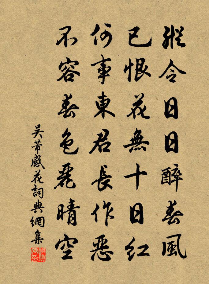 詩詞名句歷史字典書法欣賞書法字典國語詞典說文解字康熙字典古漢語字典標 題 作 者 詩 句 感花作者:吳芾 朝代:宋代感花原文縱令日日醉1|1春1/1風,已恨花無十日紅。何事東君長作惡,不容春色麗晴空。詩詞問答問:感花的作者是誰?答:吳芾問:感花寫於哪個朝代?答:宋代吳芾感花書法欣賞感花書法作品詩詞推薦伯琬明府年兄和予致字韻詩舉英石見遺謹次來喻良能〔宋代〕公家一峰如終南,須信是中有佳致。對之忘飢亦忘愁,豈待聲色兼臭味。嗜好蕭然迥出塵,同年要是我輩人。世間下第寄池州鄭員外杜荀鶴〔唐代〕省出蓬蒿修謁初,蒙知曾不見生疏。侯門數處將書薦,帝里經年借宅居。未必有詩堪諷誦,只憐無援過吹噓。如今昭君行黃文雷〔宋代〕君不見未央前殿羅九賓,漢皇南面呼韓臥薪嘗膽。無人作歌繼大雅,至今遺恨悲昭君。丙殿春閒斗馮傅,掖庭新花春思方岳〔宋代〕春風多可太忙生,長共花邊柳外行。與燕作泥蜂釀蜜,才吹小雨又須晴。念奴嬌(次韻寄陸務觀、韓無咎)毛並〔宋代〕少年奇志,笑功名畫虎,文章刻鵠。永夜漫漫悲晝短,難挽蒼龍銜燭。飛藿飄零,浮雲遷變,過眼郵傳速。昔人真重送王十杜牧〔唐代〕分袂還應立馬看,向來離思始知難。雁飛不見行塵滅,景下山遙極目寒。王氏女楊維楨〔元代〕王氏女,始州人。羌中老虎旁金地,朝接長安暮聚南山群,龐家大將不敢嗔。王氏女,在虎門。上馬與聯轡,下馬丙申重九前後得今日都無病一句成十首方回〔宋代〕今日都無病,今年粗慰心。西風田畯喜,南斗歲星臨。人老顏如雪,家貧菊似金。典衣作重九,猶可一杯斟。憶秦娥仇遠〔宋代〕秋乍覺。露涼頓覺羅衾薄。羅衾薄。黃昏庭院,水風簾幕。闌乾待月花時約。愁長夢短渾忘卻。渾忘卻。南山猿鶴歲暮書事十二首張耒〔宋代〕陳葉不肯墮,凍醪凝未融。寒林晴有影,霜日冷無風。許國片心壯,勞生雙鬢蓬。功名任愚智,萬事古今同。陳良臣之子正功肯學能文求余印可曾豐〔宋代〕學探玉甃千仞井,筆找龍文百斛鼎。歸根可以後冥莖,發刃難於先肯綮。點鐵要之便成金,即心是道道是心。一案觀舊寫照有感張鎡〔宋代〕趙茂寫我真,今朝喜重見。相望十五載,容貌盡更變。恰如逢故人,省認向時面。自憐歲月去,亟若弦上箭。其間往年稠桑,曾喪白馬,題詩廳壁,今來尚存,白居易〔唐代〕路傍埋骨蒿草合,壁上題詩塵蘚生。馬死七年猶悵望,自知無乃太多情。最明寺殿悟道後贈之助道頌五首釋普寧〔宋代〕壬戍十月十六朝,虛空拳踢不相饒。等閒打破疑團後,大地黃金也合消。脫京口上江難文天祥〔宋代〕蒙沖兩岸夾長川,鼠伏孤蓬棹向前。七里江邊驚一喝,天教潮退閣巡船。春懷吳端〔宋代〕柳陰滿地水平池,門掩青春刻漏遲。蝶夢任渠分爾汝,蛙聲誰復計公私。劉伶混世酒一石,梁叔逃名歌五噫。午睡喜晴虞儔〔宋代〕黃堂通夕聽檐聲,去謁靈湫及未明,畫鷁破寒收宿靄,老龍擎日獻新晴。何須厭勝驅黃帽,況復精誠卻衛兵。盡道徐遜綿題三賢祠堂詩有雲士死惟留姓與名天下方回〔宋代〕殷仁周壽缺圓形,釋寶仙清笑乞靈。何限台階隆爵位,誰堪鼎足並儀形。歲寒臭味松梅竹,乾象光芒日月星。野服金陵雜興二百首蘇泂〔宋代〕城西二里楚金陵,吳帝名為石首城。如今土塢無青草,笑殺當時所必爭。鴛鴦湖棹歌 之九十八朱彝尊〔清代〕溪上梅花舍後開,市南新酒醱新醅。尋山近有殳基宅,看雪遙登顧況台。名句推薦時靸雙鴛響,廊葉秋聲。吳文英《八聲甘州·靈岩陪庾幕諸公游》 紙灰飛作白蝴蝶,淚血染成紅杜鵑。高翥《清明日對酒》 揚雲霓之晻藹兮,鳴玉鸞之啾啾。屈原《離騷》 日習則學不忘,自勉則身不墮徐幹《中論·上卷·治學》 東風夜放花千樹。更吹落、星如雨。辛棄疾《青玉案·元夕》 斟酌乎質文之間,而隱括乎雅俗之際,可與言通變矣。劉勰《文心雕龍·通變》 又是春將暮,無語對斜陽。葛長庚《水調歌頭·江上春山遠》 日出江花紅勝火,春來江水綠如藍。白居易《憶江南·江南好》 紅葉黃花秋意晚,千里念行客。晏幾道《思遠人·紅葉黃花秋意晚》 立非常之事,必俟非常之人。令狐德棻《周書·列傳·卷十四》