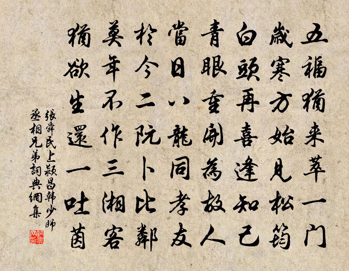 詩詞名句歷史字典書法欣賞書法字典國語詞典說文解字康熙字典古漢語字典標 題 作 者 詩 句 上潁昌韓少師丞相兄弟作者:張舜民 朝代:宋代上潁昌韓少師丞相兄弟原文五福猶來萃一門,歲寒方始見松筠。白頭再喜逢知己,青眼重開為故人。當日八龍同孝友,於今二阮卜比鄰。莫年不作三湘客,猶欲生還一吐茵。詩詞問答問:上潁昌韓少師丞相兄弟的作者是誰?答:張舜民問:上潁昌韓少師丞相兄弟寫於哪個朝代?答:宋代張舜民上潁昌韓少師丞相兄弟書法欣賞上潁昌韓少師丞相兄弟書法作品詩詞推薦書用師庵李昭述〔宋代〕架泉龕石搆幽棲,竹樹陰森鎖翠微。珍重支郎得高趣,一庵一榻自忘機。壽時相李商叟〔宋代〕龍盤虎踞王金陵,傑出天人致太平。千載精神真會聚,一朝文物益彰明。扶持直使乾坤正,指顧能令海岱清。二紀惻惻吟白居易〔唐代〕惻惻復惻惻,逐臣返鄉國。前事難重論,少年不再得。泥塗絳老頭斑白,炎瘴靈均面黎黑。六年不死卻歸來,道著綿王夢應〔宋代〕既庶既繁,既多受祉。厥胤維何,宜兄宜弟。兄弟求矣,以燕翼子。宮詞王仲修〔宋代〕長生殿裹更闌後,乞巧樓前月上時。河漢玉梯三十六,不知誰見畫蛾眉。約黃成之觀瓊花予不及從以詩代簡方岳〔宋代〕處處春風自物華,有詩不了醉生涯。別離苦憶平山柳,題品翻疑后土花。獨倚斷雲愁戰馬,重歌流水帶歸鴉。夢寒仙鶴樓避暑洪咨夔〔宋代〕孤塔山光寂,危樓岸影斜。秋聲來木末,客思滿天涯。離列高低樹,滄茫隱見沙。夜涼人被酒,乘月快浮家。感秋六首鄭獬〔宋代〕短松青鐵乾,童童三尺餘。花實少姿媚,獨與寒心俱。暴霜時侵凌,奮怒張雄須。長楸擁腫材,旁蔭可容車。秋風如夢令趙長卿〔宋代〕居士年來懶散。凡事只從寬簡。身外更無求,祗要夏涼冬暖。美滿。美滿。得過何須積趲。送趙國晉隨侍之江西陳文蔚〔宋代〕如今無復酒腸寬,十五年同一夢間。歲月易從愁里換,鬢毛多向別時斑。諸公台閣總皆著,獨我山林自愛閒。見說過田家周南〔宋代〕得麥兒今喜,無梅雨又愆。翁身今七十,眼見幾般年。連年增口數,再世種人田。機上畸零絹,今當數百錢。閔雨鄭獬〔宋代〕潭底乖龍喚不譍,驕陽似欲敗西成。虛堂永夜耿無寐,起聽四郊車水聲。長相思李煜〔唐代〕雲一緺,玉一梭,澹澹衫兒薄薄羅。輕顰雙黛螺。秋風多,雨相和,簾外芭蕉三兩窠。夜長人奈何?成都大閱陸游〔宋代〕千步球場爽氣新,西山遙見碧嶙峋。令傳雪嶺蓬婆外,聲震秦川渭水濱。旗腳倚風時弄影,馬蹄經雨不沾塵。屬櫜舊遊劉克莊〔宋代〕扶胥黃木水連空,曾讀韓碑訪祝融。安得六丁機萬弩,岷江西去海潮東。答京西提刑張司封次韻宋祁〔宋代〕乞得二千石,終非循吏才。霜蓬根易動,籠鳥翅難開。夢寤慚封邑,陶埏仰鉉台。報言殊麗藻,虛附驛筩回。三字詩六首寒山〔唐代〕寒山道,無人到。若能行,稱十號。有蟬鳴,無鴉噪。黃葉落,白雲掃。石磊磊,山隩隩。我獨居,名善導。子細遇旅鶴孫昌胤〔唐代〕靈鶴產絕境,昂昂無與儔。群飛滄海曙,一叫雲山秋。野性方自得,人寰何所求。時因戲祥風,偶爾來中州。中州和頭巾趙希逢〔宋代〕休言抱道更懷才,大叫天門雲欲排。獨自一冠猶屢變,事幾何以御方來。癸卯歲始春懷古田舍 其一陶淵明〔魏晉〕在昔聞南畝,當年竟未踐。屢空既有人,春興豈自免。夙晨裝吾駕,啟塗情已緬。鳥哢歡新節,泠風送餘善。寒竹名句推薦碧溪影里小橋橫,青簾市上孤煙起。謝逸《踏莎行·柳絮風輕》 食必常飽,然後求美;衣必常暖,然後求麗劉向《說苑·反質》 輪匠執其規、矩,以度天下之方圓墨子《墨子·天志(上)》 明朝甑復空,母子相持哭。陸游《十月二十八日風雨大作》 對酒當歌,人生幾何!曹操《短歌行》 宣父猶能畏後生,丈夫未可輕年少。李白《上李邕》 已訴徵求貧到骨,正思戎馬淚盈巾。杜甫《又呈吳郎》 鳳尾森森,龍吟細細。曹雪芹《紅樓夢·第二十六回》 風雨牢愁無著處,那更寒蛩四壁。文天祥《酹江月·和友驛中言別》 何處是歸程?長亭連短亭。李白《菩薩蠻·平林漠漠煙如織》