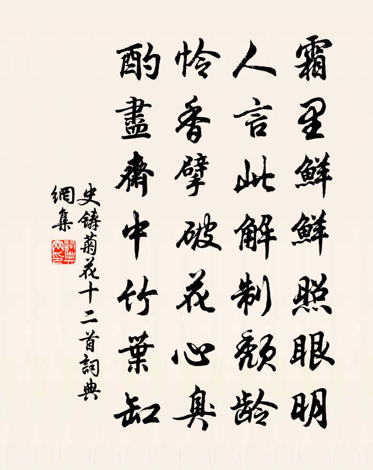 詩詞名句歷史字典書法欣賞書法字典國語詞典說文解字康熙字典古漢語字典標 題 作 者 詩 句 菊花十二首作者:史鑄 朝代:宋代菊花十二首原文霜里鮮鮮照眼明,人言此解制頹齡。憐香擘破花心臭,酌盡齋中竹葉缸。詩詞問答問:菊花十二首的作者是誰?答:史鑄問:菊花十二首寫於哪個朝代?答:宋代史鑄菊花十二首書法欣賞菊花十二首書法作品詩詞推薦登城樓望西山作張九齡〔唐代〕城樓枕南浦,日夕顧西山。宛宛鸞鶴處,高高煙霧間。仙井今猶在,洪厓久不還。金編莫我授,羽駕亦難攀。檐際答孫正之王安石〔宋代〕無才處處是窮塗,兩地誰傳萬里書。節物崢嶸催歲暮,溪山蕭灑入吾廬。南歸猶喜尋同志,北去還聞困索居。佳句思佳客 賦半面女髑髏吳文英〔宋代〕釵燕攏雲睡起時。隔牆折得杏花枝。青春半面妝如畫,細雨三更花又飛。輕愛別,舊相知。斷腸青冢幾斜暉。斷紅白沙阻風張耒〔宋代〕春江風易惡,故作客行難。晴日開野色,朝寒醒醉顏。歸人出斷岸,去翼復前山。淹泊無誰語,村翁亦往還。和人子夜四時歌李復〔宋代〕窈窕月華來,對月理瑤箏。將心托弦語,幾弄未成聲。非關霜氣澀,不忍苦分明。菩薩蠻程垓〔宋代〕夜來花底鶯饒舌。把人心事分明說。許大好因緣。只成容易傳。春闌無好計。唯有歸來是。從此玉台前。曉妝休太望湖亭釋仲殊〔宋代〕凝華浮藻五雲間,下壓凌虛萬象閒。湖水際天天欲盡,落霞照出洞庭山。學海樓和水心先生韻薛師石〔宋代〕江口潮生夜語喧,月殘叭有數得存。更憑高處觀空闊,始悟乾坤是易門。玉真瑞世頌白玉蟾〔宋代〕維皇宋嘉定皇后崇尚神仙,有志鉛汞,臣生遇熙旦,獲覩盛事,謹制《玉真瑞世頌》。其辭曰:西華王母,紫虛元分水嶺元稹〔唐代〕崔嵬分水嶺,高下與雲平。上有分流水,東西隨勢傾。朝同一源出,暮隔千里情。風雨各自異,波瀾相背驚。勢高祝英台近(寄陳直卿)張炎〔宋代〕路重尋,門半掩、苔老舊時樹。採藥雲深,童子更無語。怪他流水迢迢,湖天日暮,想只在、蘆花多處。謾延佇。玉泉十二韻納蘭性德〔清代〕地涌西山脈,名標禁御泉。百層飛作雨,萬頃匯成淵。潤下終歸海,源高卻自天。縈煙來樹杪,帶雪落雲邊。隱見依韻和張叔毅讀柳先生文強至〔宋代〕先生蕭瑟半塗休,一跌青雲不再收。名壓班行來眾毀,筆鑱造化起天讎。王韋黨破誰為地,柳播風殊願易州。廟食喜陳兄至白居易〔唐代〕黃鳥啼欲歇,青梅結半成。坐憐春物盡,起入東園行。攜觴懶獨酌,忽聞叩門聲。閒人猶喜至,何況是陳兄。從容句程師孟〔宋代〕亭為新成號獅子,人曾舊隱作龍頭。冬夜作短歌陸游〔宋代〕飢鼠窺殘燈,寒犬踏枯葉。小室擁燎爐,清笳下危堞。老人素多疾,舉動常畏怯。衣裘視寒暖,日夜自調燮。食必薔薇花聯句裴度〔唐代〕似錦如霞色,連春接夏開。——劉禹錫波紅分影入,風好帶香來。 ——裴度得地依東閣,當階奉上台。 ——行以六一泉煮雙井茶楊萬里〔宋代〕鷹爪新茶蟹眼湯,松風鳴雪免毫霜。細參六一泉中味,故有涪翁句子香。日鑄建溪當退舍,落霞秋水夢還鄉。何時贈河間隱者苑君年八十有一家鉉翁〔宋代〕海上有三山,瀛洲居其一。何年飛來神州赤縣東,其上至今猶有神仙宅。龐眉皓前方瞳翁,喬松羨門乃其匹。深衣減字木蘭花黃庭堅〔宋代〕見,復用前韻先往使君那裡。千騎塵中依約是。拂我眉頭。無處重尋庾信愁。山雲瀰漫。夾道旌旗聯復斷。萬事茫名句推薦樹曲木者,惡得直景劉向《說苑·君道》 回日樓台非甲帳,去時冠劍是丁年溫庭筠《蘇武廟》 蔞蒿滿地蘆芽短,正是河豚欲上時。蘇軾《惠崇春江晚景 / 惠崇春江曉景》 經一失長一智馮夢龍《警世通言·卷三》 蕭條清萬里,瀚海寂無波。李白《塞上曲》 燕子重來,往事東流去。吳文英《點絳唇·時霎清明》 日入群動息,歸鳥趨林鳴陶淵明《飲酒·七》 居上不寬,為禮不敬,臨喪不哀,吾何以觀之哉?孔子弟子《論語·八佾篇》 東風動百物,草木盡欲言。李白《長歌行》 梅花散彩向空山,雪花隨意穿簾幕。王旭《踏莎行·雪中看梅花》