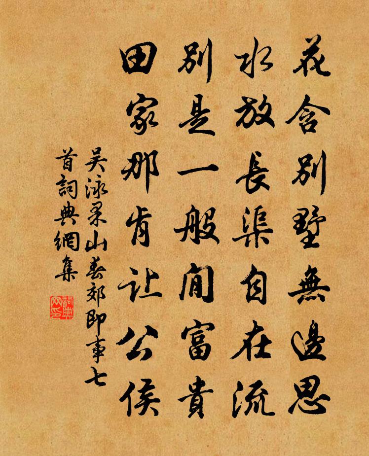 詩詞名句歷史字典書法欣賞書法字典國語詞典說文解字康熙字典古漢語字典標 題 作 者 詩 句 果山春郊即事七首作者:吳泳 朝代:宋代果山春郊即事七首原文花含別墅無邊思,水放長渠自在流。別是一般閒富貴,田家那肯讓公侯。詩詞問答問:果山春郊即事七首的作者是誰?答:吳泳問:果山春郊即事七首寫於哪個朝代?答:宋代吳泳果山春郊即事七首書法欣賞果山春郊即事七首書法作品詩詞推薦見物吟邵雍〔宋代〕見物即謳吟,何嘗曾用意。閒將篋笥詩,靜看人間事。游雲際寺喻鳧〔唐代〕澗壑吼風雷,香門絕頂開。閣寒僧不下,鍾定虎常來。鳥啄林稍果,鼯跳竹里苔。心源無一事,塵界擬休回。題開元寺水閣趙嘏〔唐代〕年來獨向此游頻,謝氏青山與寺鄰。朱檻夜飛溪路雪,碧林晴隔馬蹄塵。波穿十里橋連寺,絮壓千家柳送春。湖山雜賦陸游〔宋代〕門前天鏡倒千峰,舍後菰蒲與海通。乘興出遊無遠近,煙波何處覓孤篷?題考功印紙曾如驥〔宋代〕謹將節義二字,結果印紙一宗。了卻神遊何處,澄江明月清風。醜奴兒/採桑子張孝祥〔宋代〕十年聞說查山好,何日追游。木落霜秋。夢想雲溪不那愁。主人好事長留客,尊酒夷猶。一笑登樓。興在西峰上上呈宜之兄八首趙蕃〔宋代〕兄詩楚山竹,歲晚色愈綠。譬彼朝陽桐,當令鳳棲宿。曉色謝宗元〔元代〕遠似煙霽近又空。非明非夜兩朦朧。一天清露洗難退。幾抹曙雲遮不窮。斷角樓台濃淡里。殘燈院落有無中。蒼茫送傅左司赴袁州釋善珍〔宋代〕長安貂蟬賤如土,故家文獻餘一縷。平生粗疎不媚嫵,直語豈知犯張禹。腰間金印太二組,我自棄置君自取。兒時勾龍君貺求所居垂蔭亭岷堂二首蘇籀〔宋代〕岷陽英傑古賢鄉,侍史香爐今望郎。柬擢欲書丹鳳詔,夢魂勤到碧雞坊。已應盛美摽其茇,不比畸人愚厥堂。宦牒端平二年端午帖子詞皇帝閣洪咨夔〔宋代〕明進離方午,柔生遇已陰。妙參三聖易,細測兩儀心。西江月譚處端〔元代〕欲入全真門戶,行住坐臥寂寥。存心乞化度中朝。塵事般般屏了。莫論黃芽白雪,休搜龍虎嬰嬌。色財無掛火煙消房家夜宴喜雪戲贈主人白居易〔唐代〕風頭向夜利如刀,賴此溫爐軟錦袍。桑落氣薰珠翠暖,《柘枝》聲引管弦高。酒鉤送盞推蓮子,燭淚粘盤壘葡萄。和正父游榕溪韻張栻〔宋代〕隔岸高低露碧山,眼明使作故園看。直從榕影度輕舫,更傍溪光撫曲欄。鴻雁來希空悵望,梅花開早未初寒。喜君夏園梅堯臣〔宋代〕夏園甘果熟,日覺樹林稀。休笑道傍李,無人摘自肥。句祝廉夫〔宋代〕會當歸去來。治平丁未仲秋遊伊洛二川六日晚出洛城西門宿邵雍〔宋代〕向晚驅車出上陽,初程便宿水雲鄉。更聞數弄神仙曲,始信壺中日月長。洛下送張曼容赴上黨召杜牧〔唐代〕歌闋樽殘恨起偏,憑君不用設離筵。未趨雉尾隨元老,且驀羊腸過少年。七葉漢貂真密近,一枝詵桂亦徒然。羽書台城路 寒食後雨軒獨坐,次復孺韻 以上六首錢應庚〔元代〕一庭芳草閒春書,疏疏弄簾花影。鼓子風喧,苔痕雨潤,還聽蛙聲鳴井。沉吟坐暝。正綺席杯空,蕙爐煙冷。老去送陳秀才將游霅上便議北歸方乾〔唐代〕婆娑戀酒山花盡,繞繚還家水路通。轉楫擬從青草岸,吹帆猶是白蘋風。淮邊欲暝軍鼙急,洛下先寒苑樹空。詩句名句推薦女曰雞鳴,士曰昧旦。佚名《女曰雞鳴》 勿貪意外之財,勿飲過量之酒。朱柏廬《朱子家訓·全文》 攜籮驅出敢偷閒,雪脛冰須慣忍寒。范成大《雪中聞牆外鬻魚菜者求售之聲甚苦有感》 賊是小人,智過君子。佚名《增廣賢文·上集》 莫買沃洲山,時人已知處。劉長卿《送方外上人/送上人》 公子王孫逐後塵,綠珠垂淚滴羅巾。崔郊《贈去婢》 芳洲拾翠暮忘歸,秀野踏青來不定。張先《木蘭花·乙卯吳興寒食》 憶共人人睡魂蝶亂,夢鸞孤。趙長卿《更漏子·燭消紅》 北風吹白雲,萬里渡河汾。蘇頲《汾上驚秋》 行路難!行路難!多歧路,今安在?李白《行路難三首》